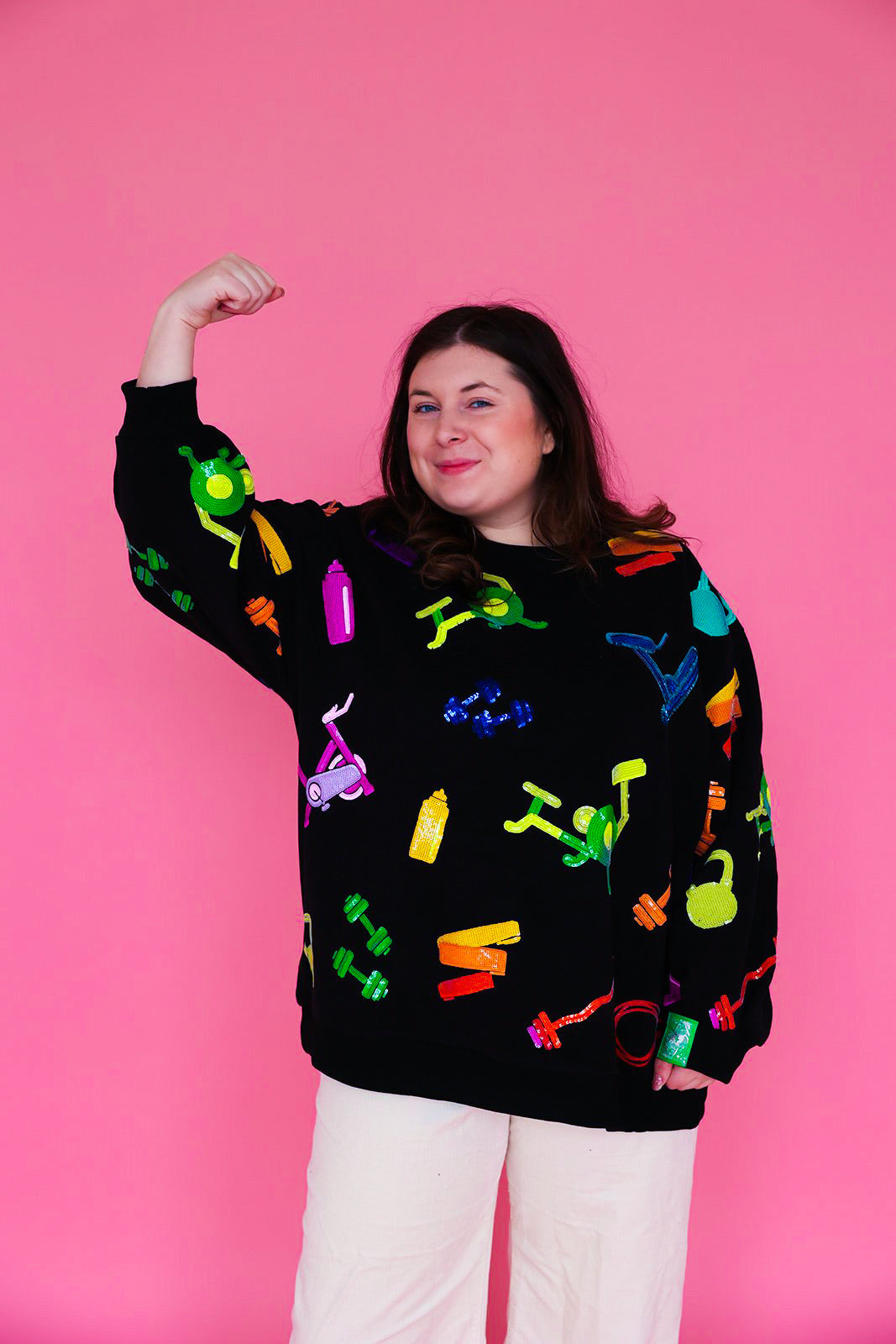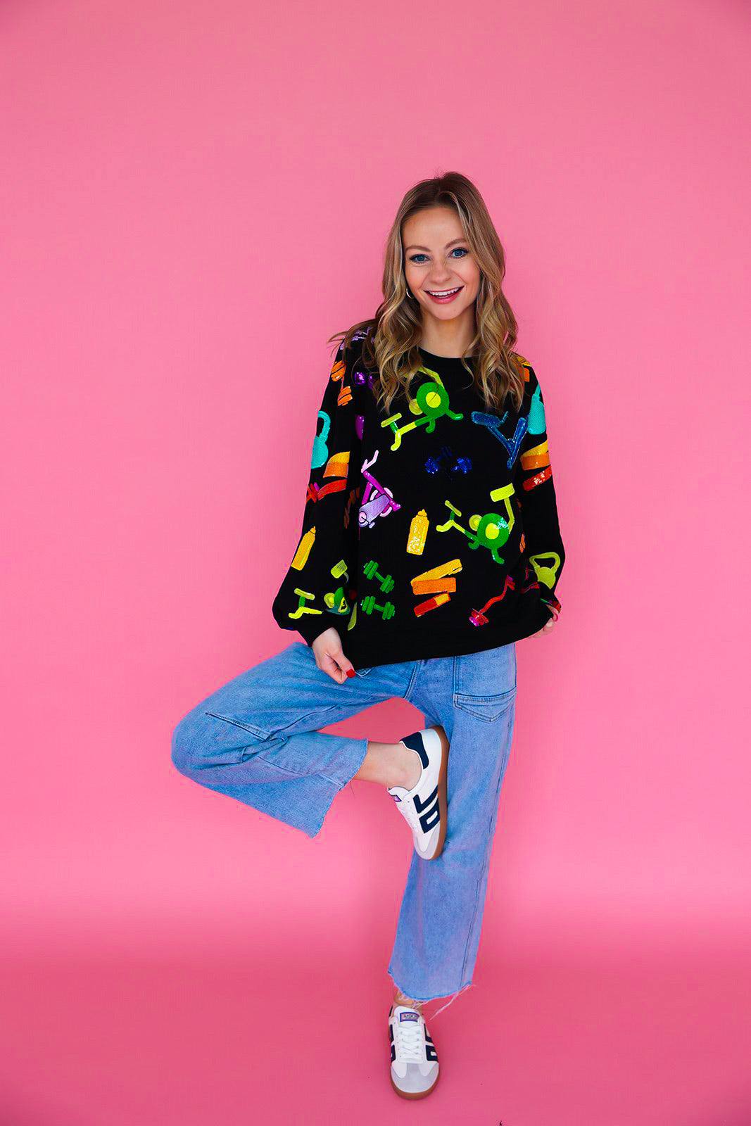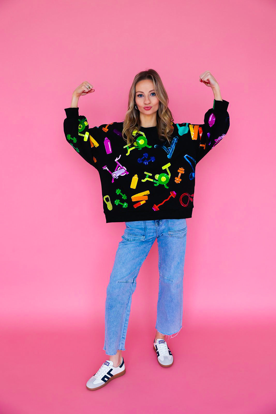 Sparkle and shine while you workout with our Black Multi Workout Equipment Sweatshirt. Adorned with colorful sequin designs, this black sweatshirt is perfect for the sporty season. Stay stylish and comfortable during your workouts with this eye-catching piece!
