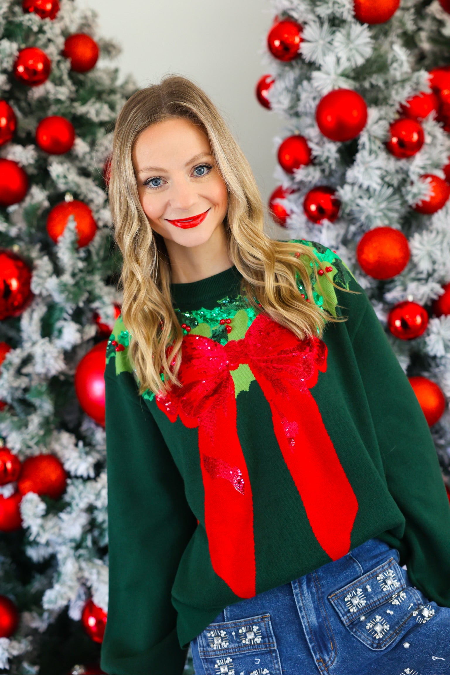 Celebrate the season in style with this Dark Green & Red Wreath Around Neck Sweater. Featuring a festive wreath design elegantly placed around the neckline, this sweater brings holiday cheer to your wardrobe. Its rich colors and cozy fit make it perfect for family gatherings or holiday parties, keeping you comfortable and spirited all day long. Embrace warmth and festive charm effortlessly with this standout piece.