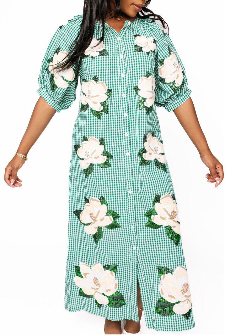 Embrace timeless elegance with this charming gingham midi dress from Queen of Sparkles. The classic green and white checked pattern pairs beautifully with delicate magnolia details, creating a look that's both sophisticated and effortlessly feminine. Crafted from soft, breathable cotton, this button-up style offers comfort without compromising on style. The midi length flatters every figure while the structured fit ensures you'll feel confident and put-together from morning to night. Perfect for garden parties, casual brunches, or any occasion calling for understated charm.