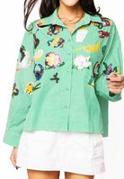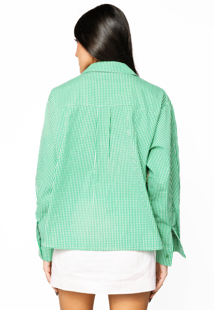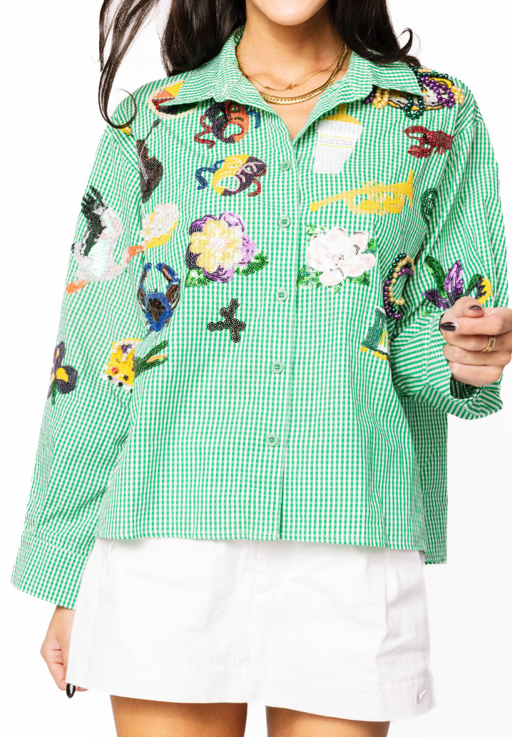 Green & White Gingham Mardi Gras Icon Button Up Cotton Top Queen of Sparkles