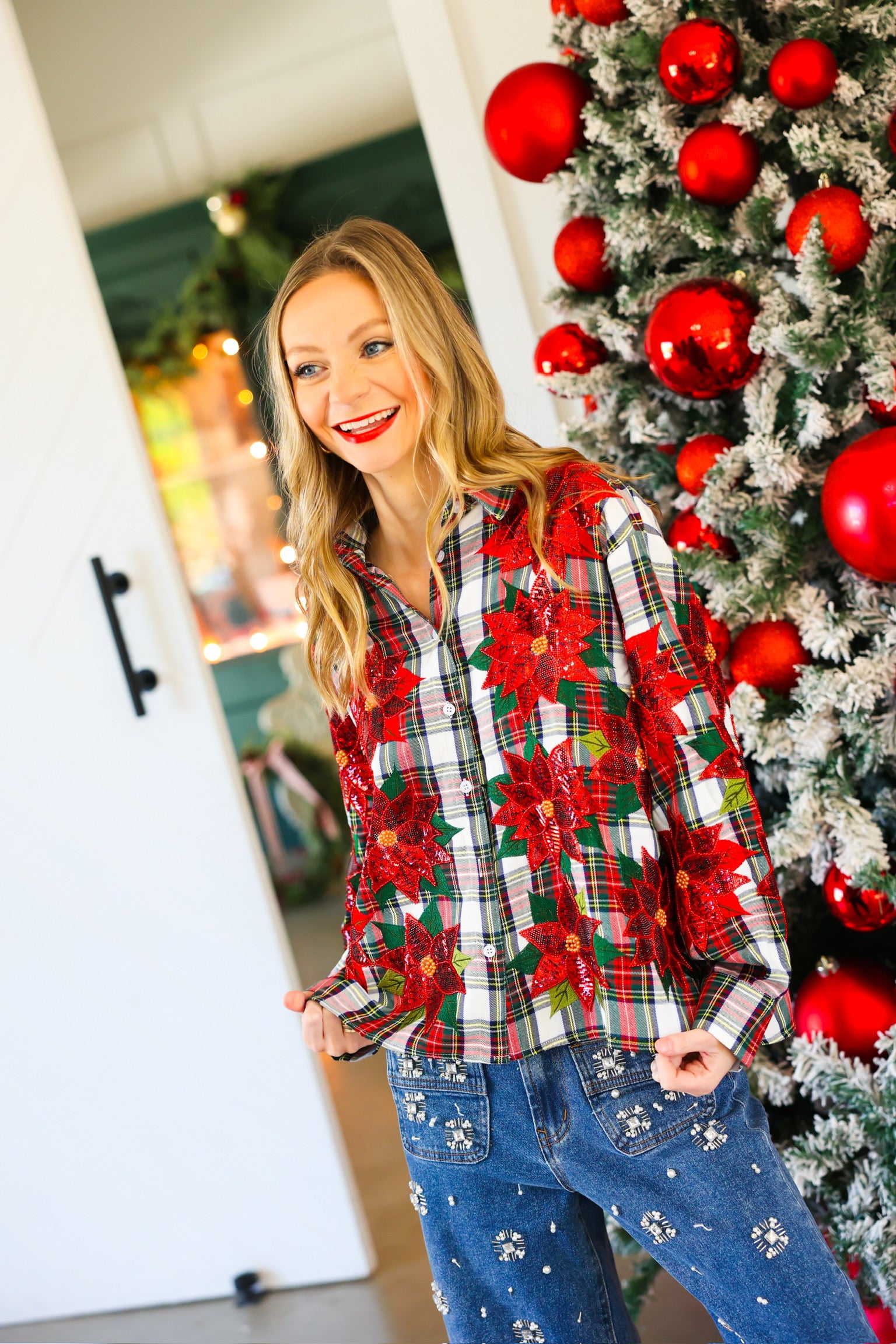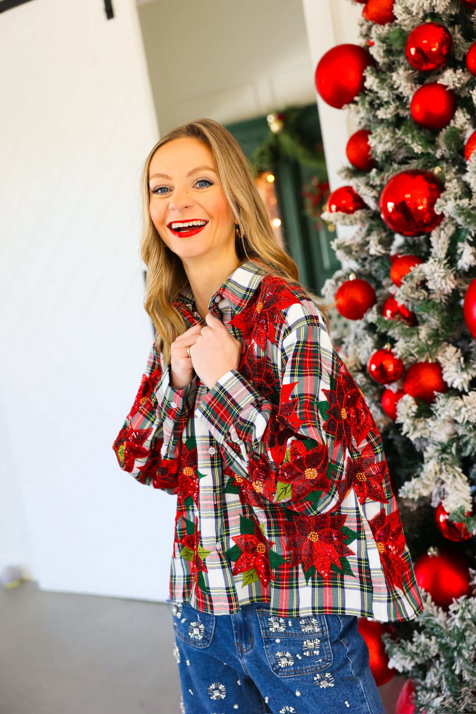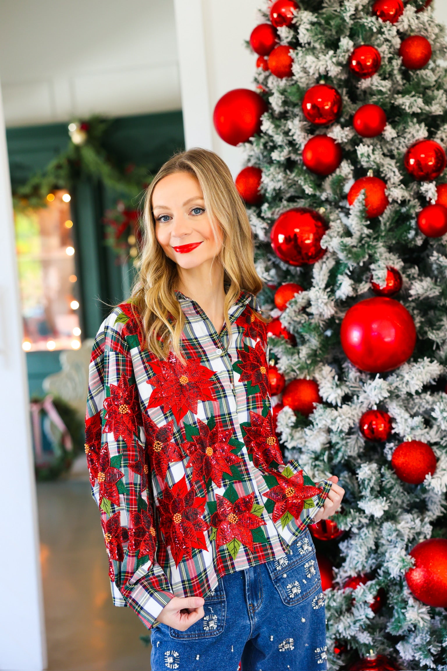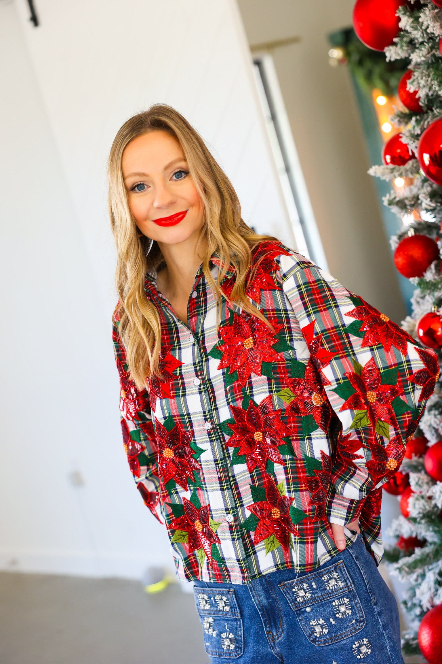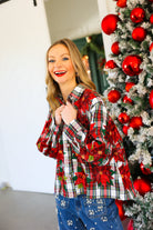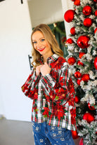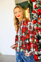 Red, Green & White Plaid Poinsettia Cotton Button Up Top Queen of Sparkles