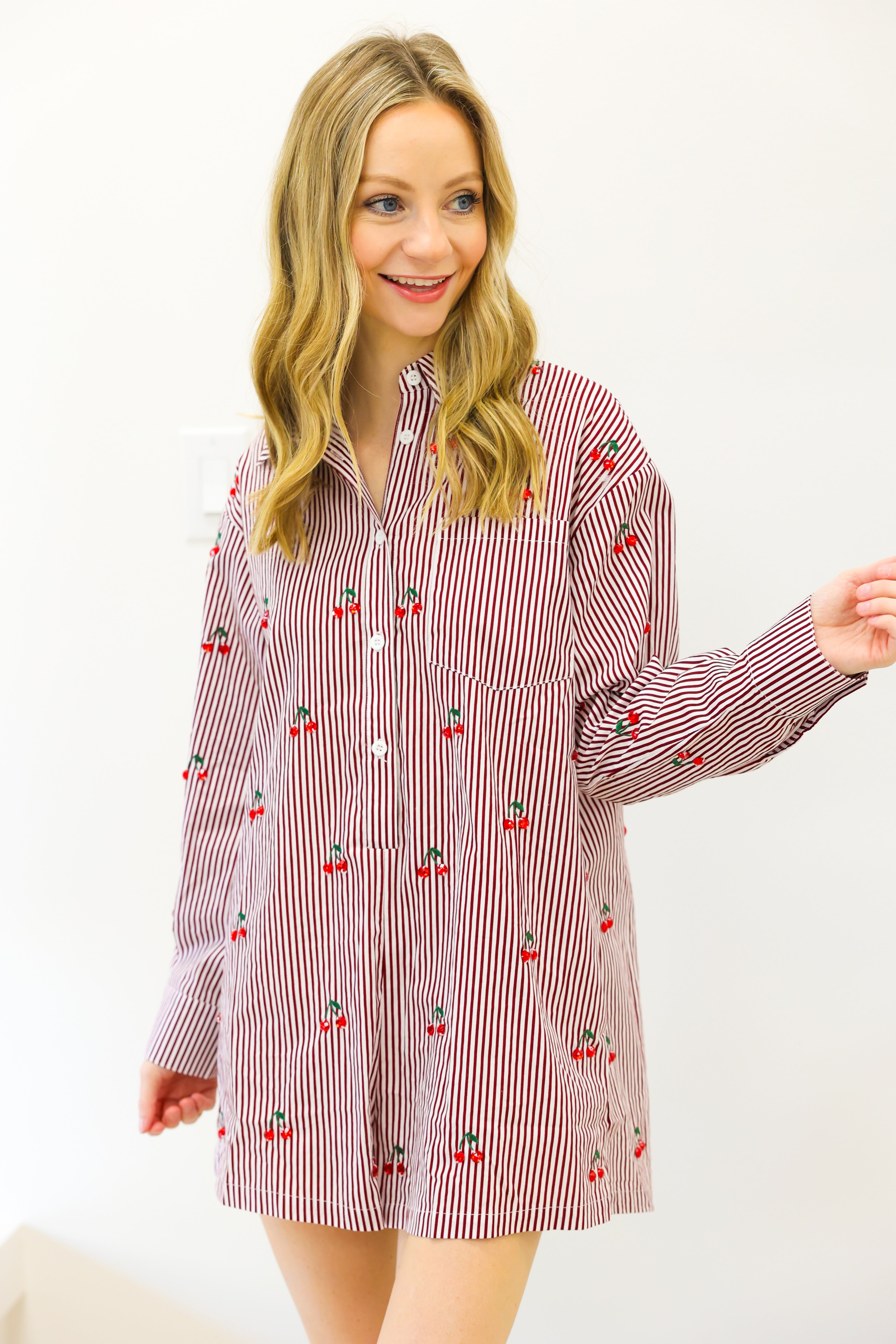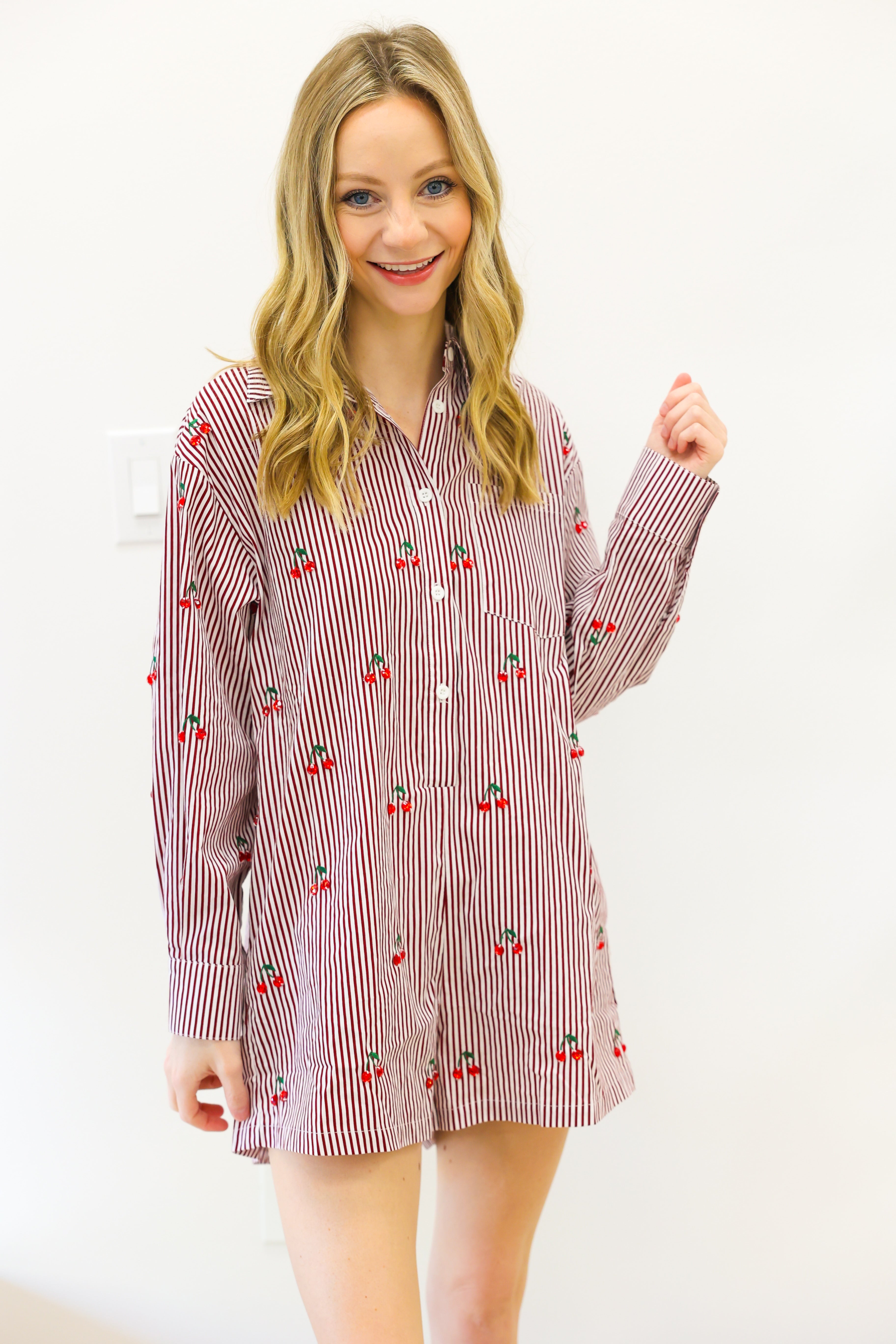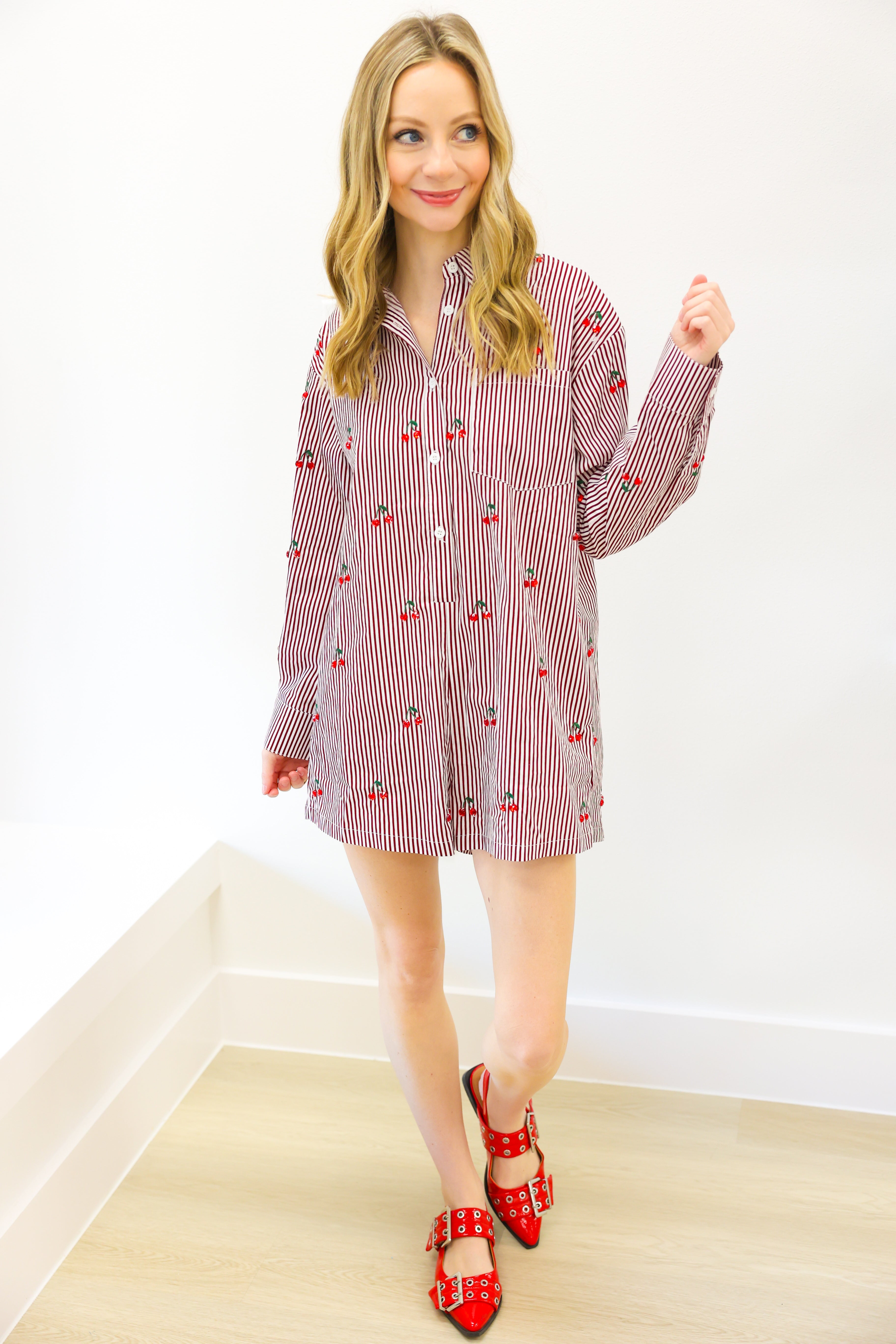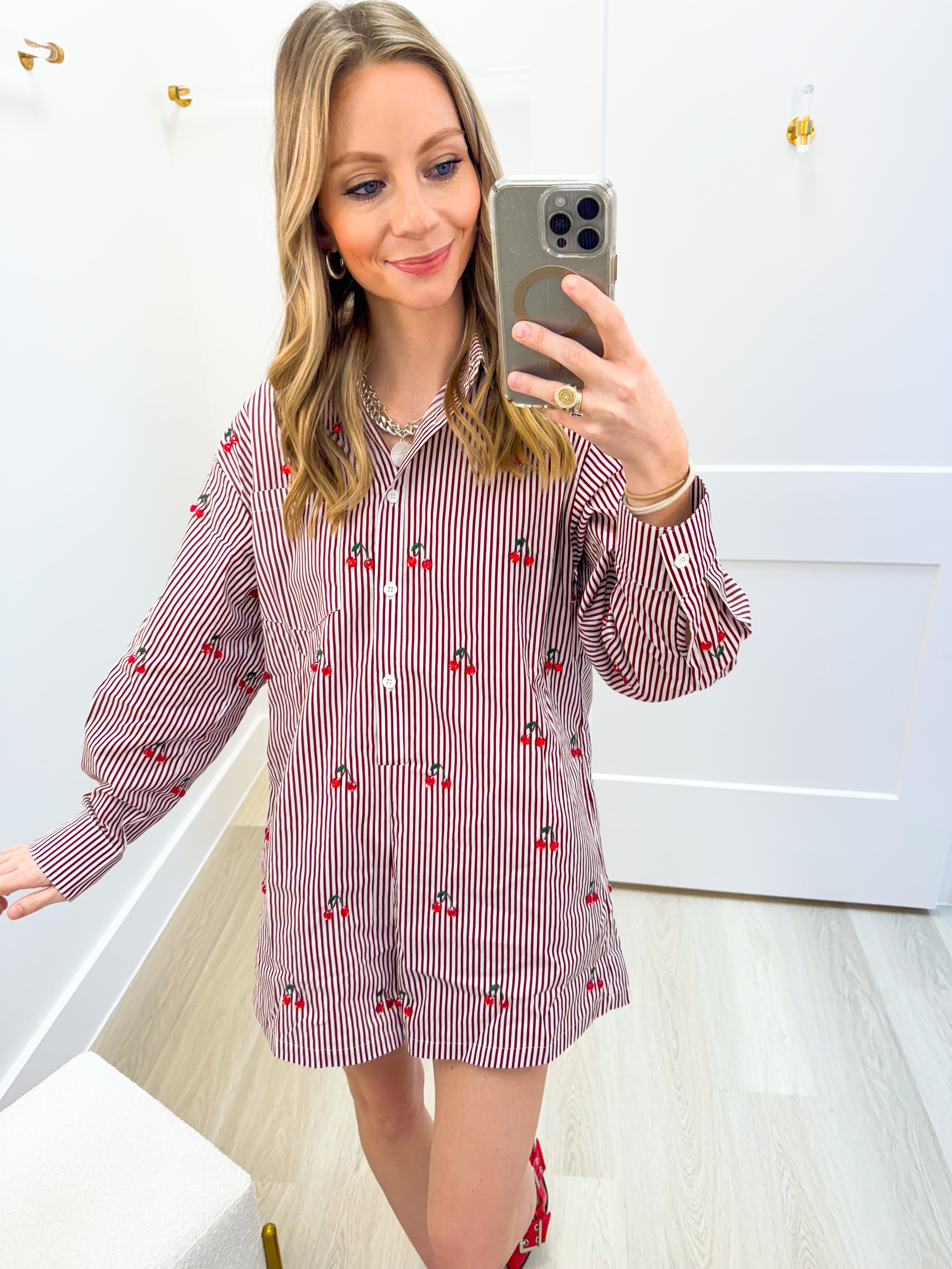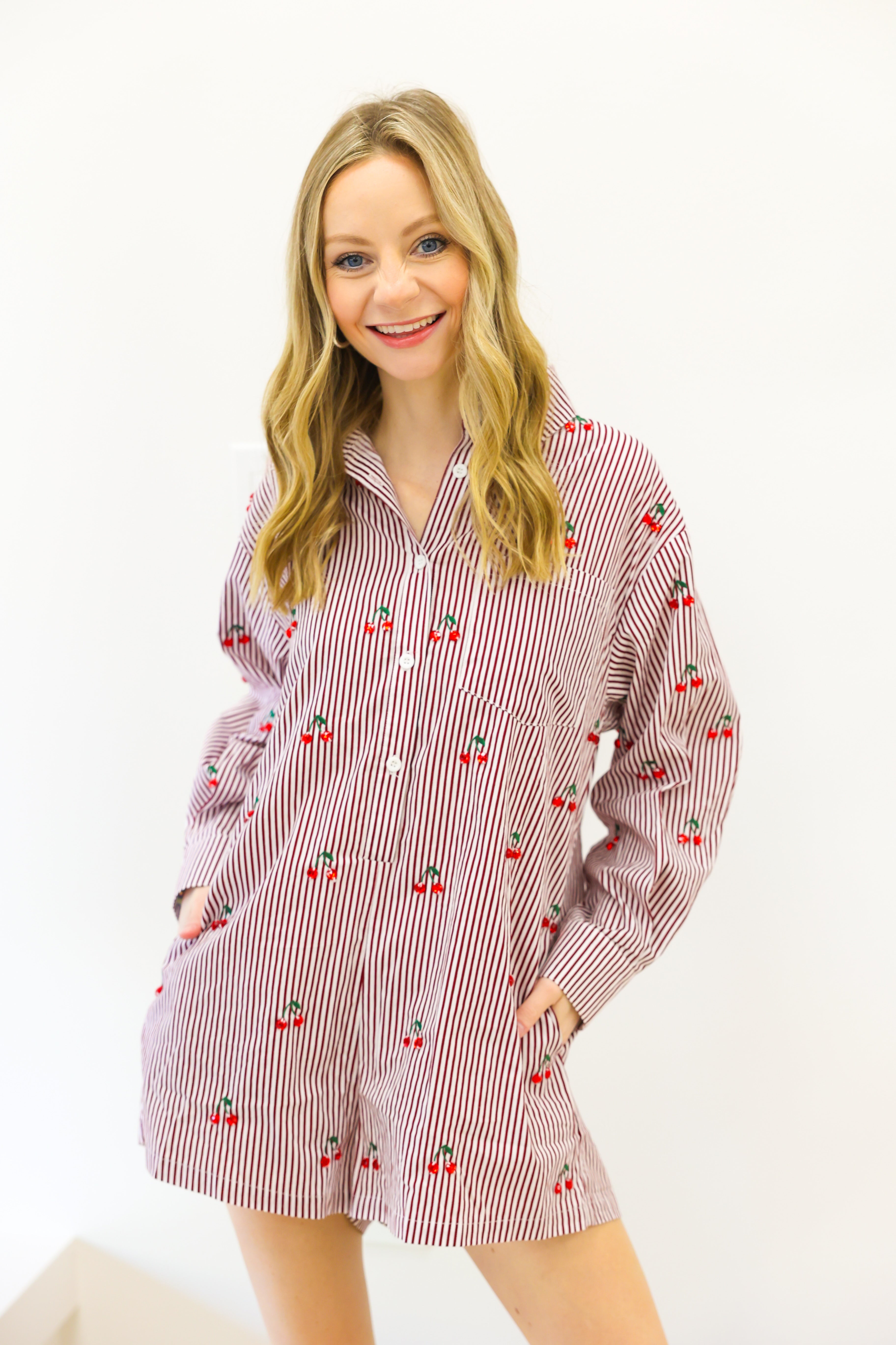 Striped Cotton Button Up Long Sleeve Jeweled Cherry Romper Queen of Sparkles