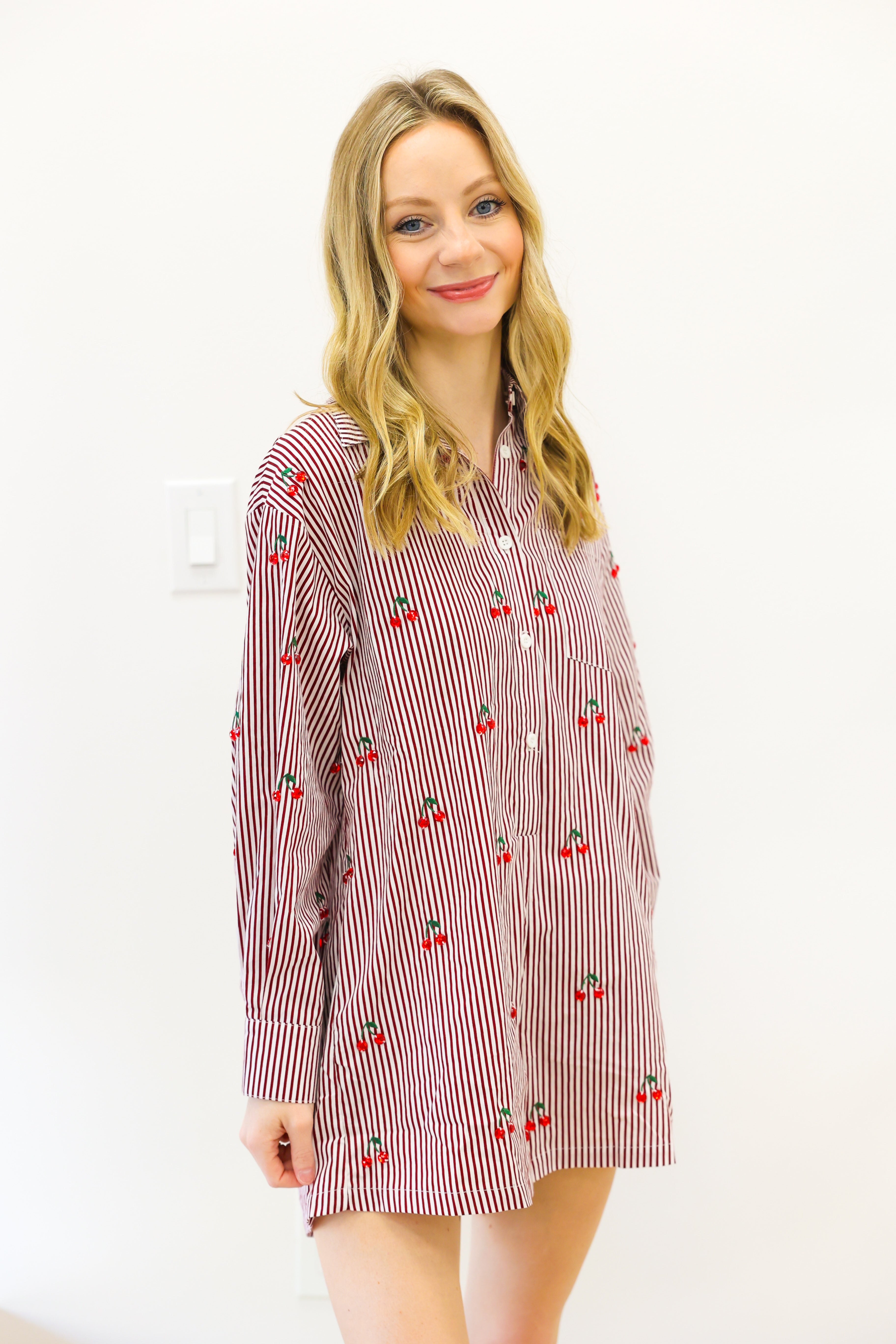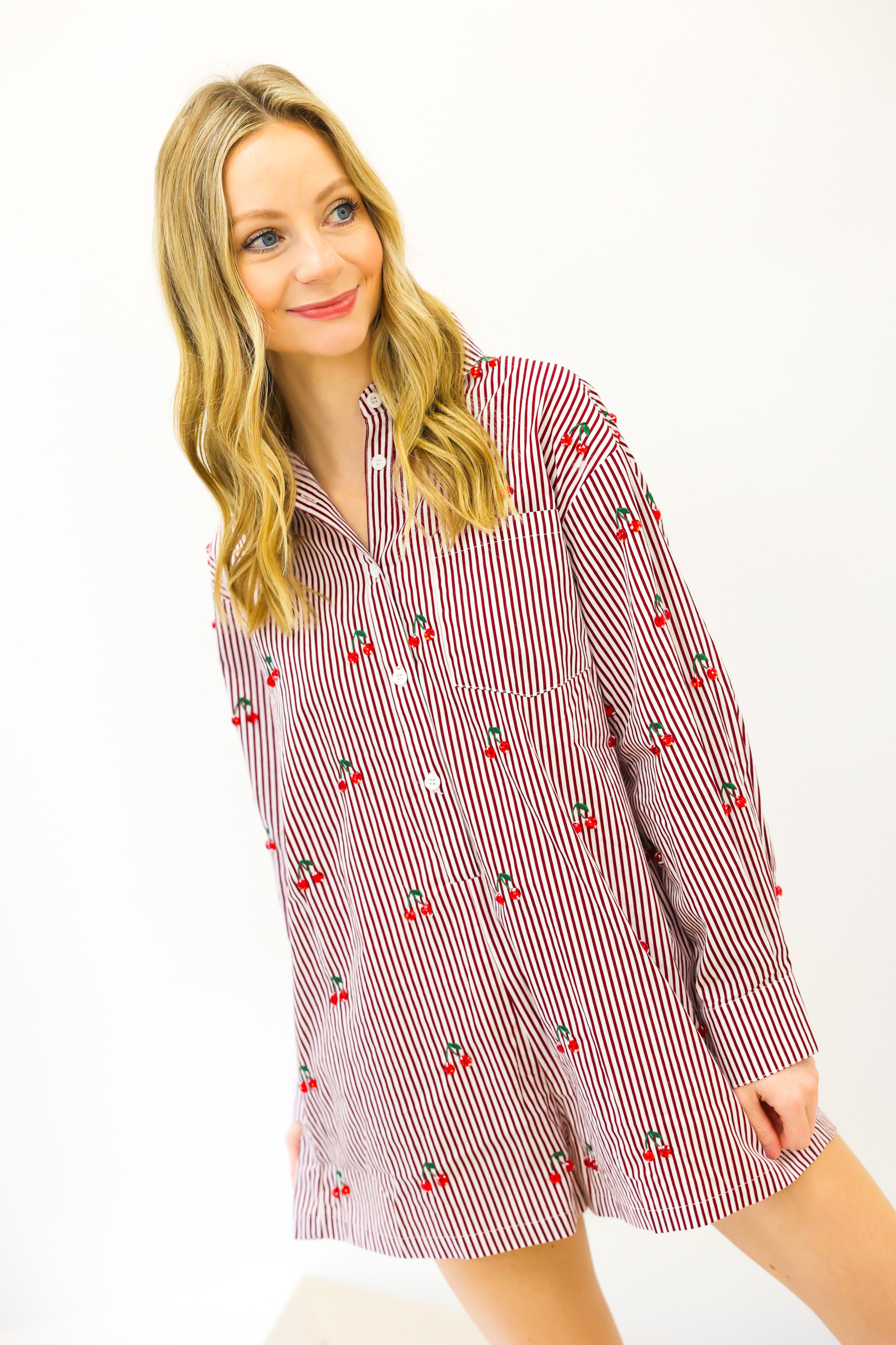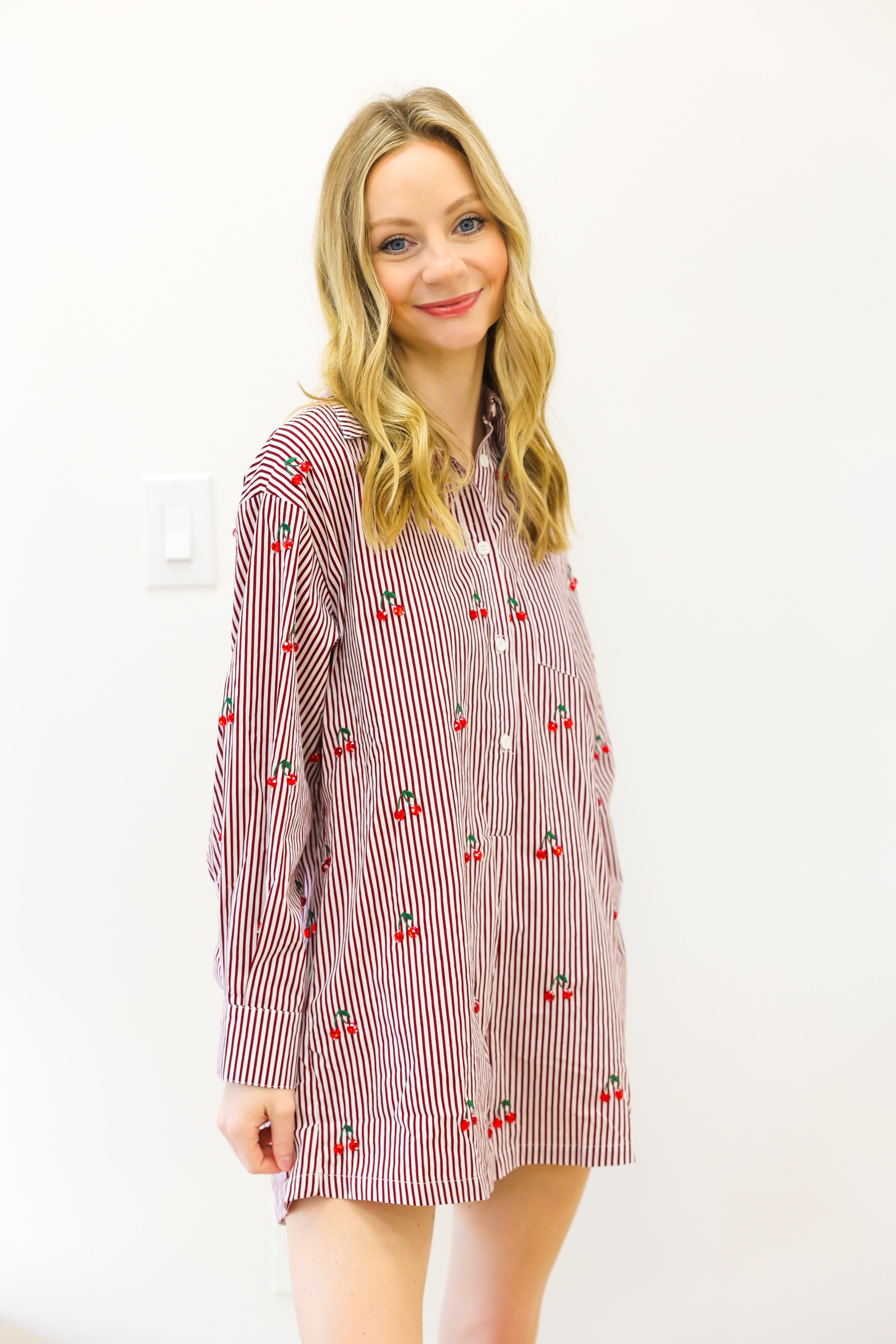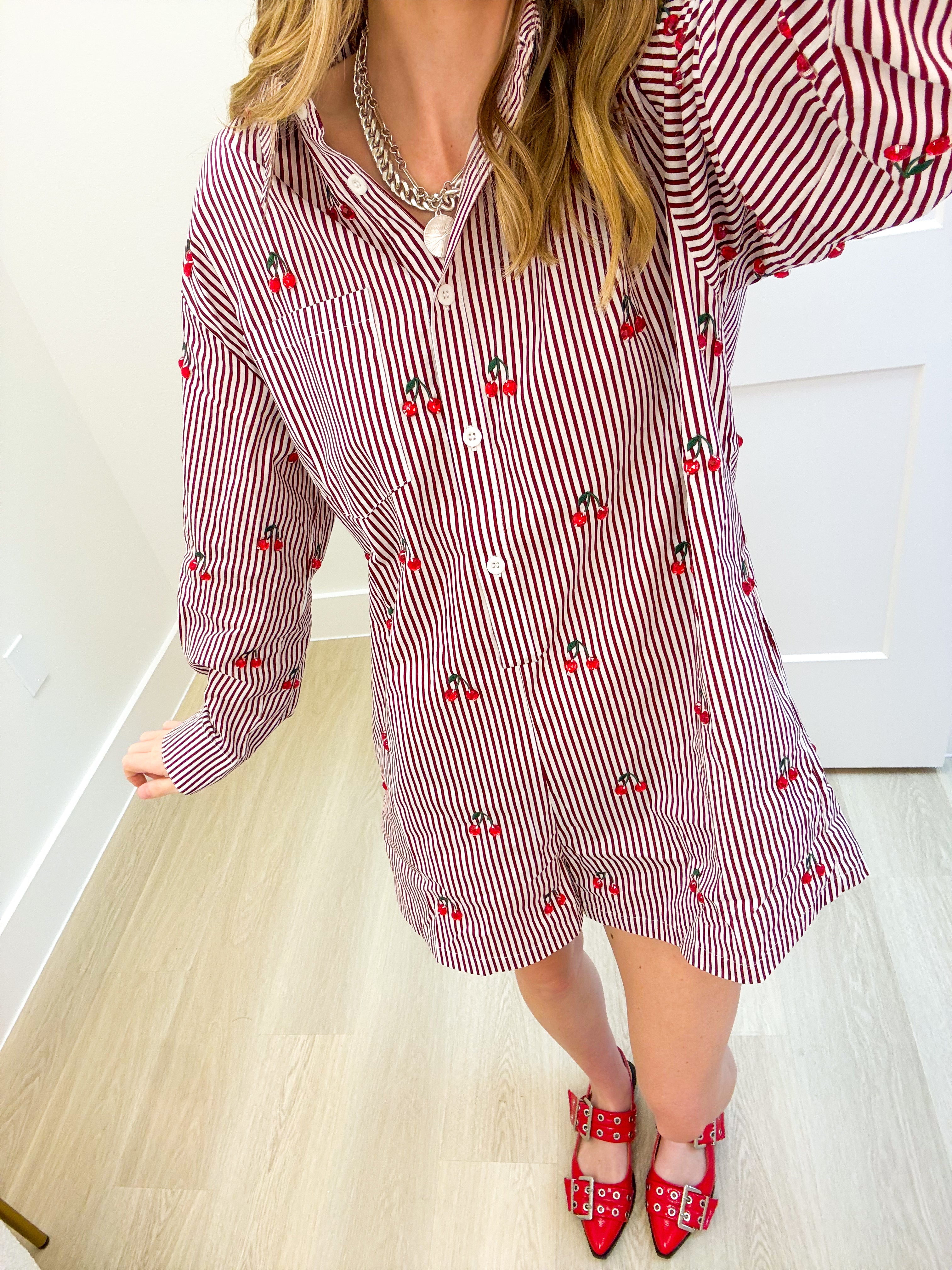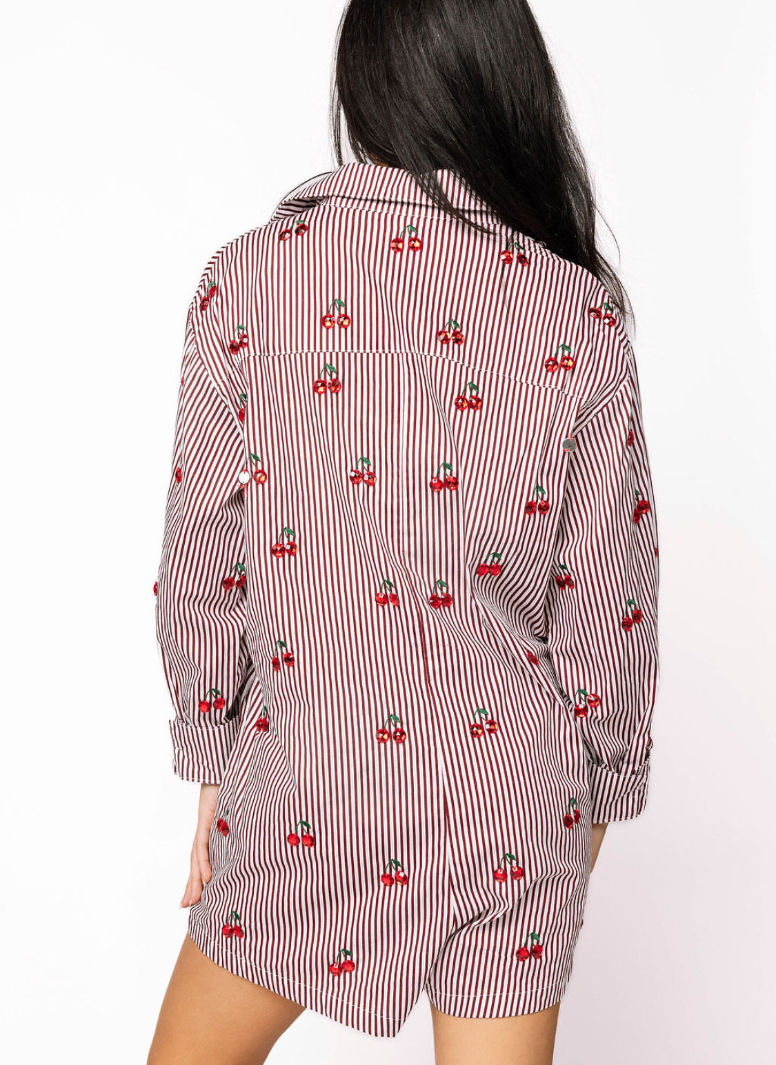 Striped Cotton Button Up Long Sleeve Jeweled Cherry Romper Queen of Sparkles