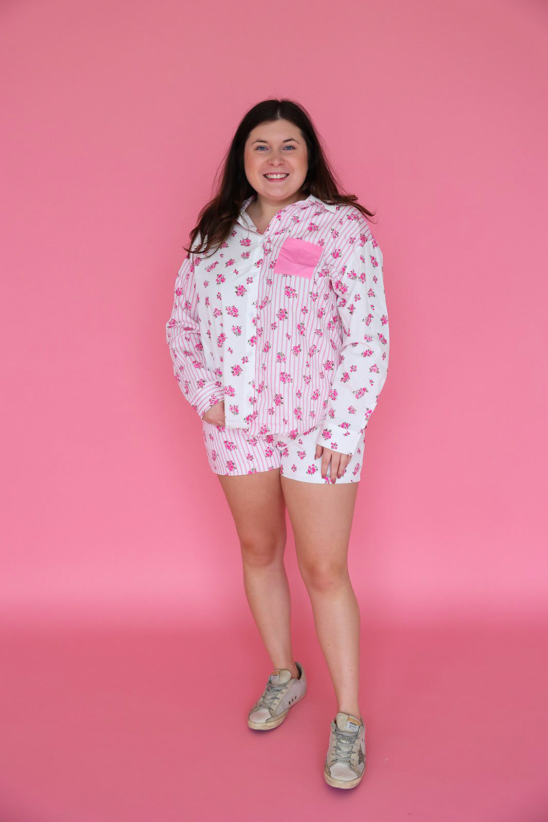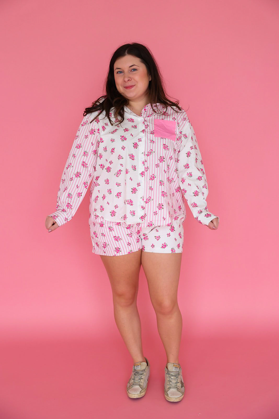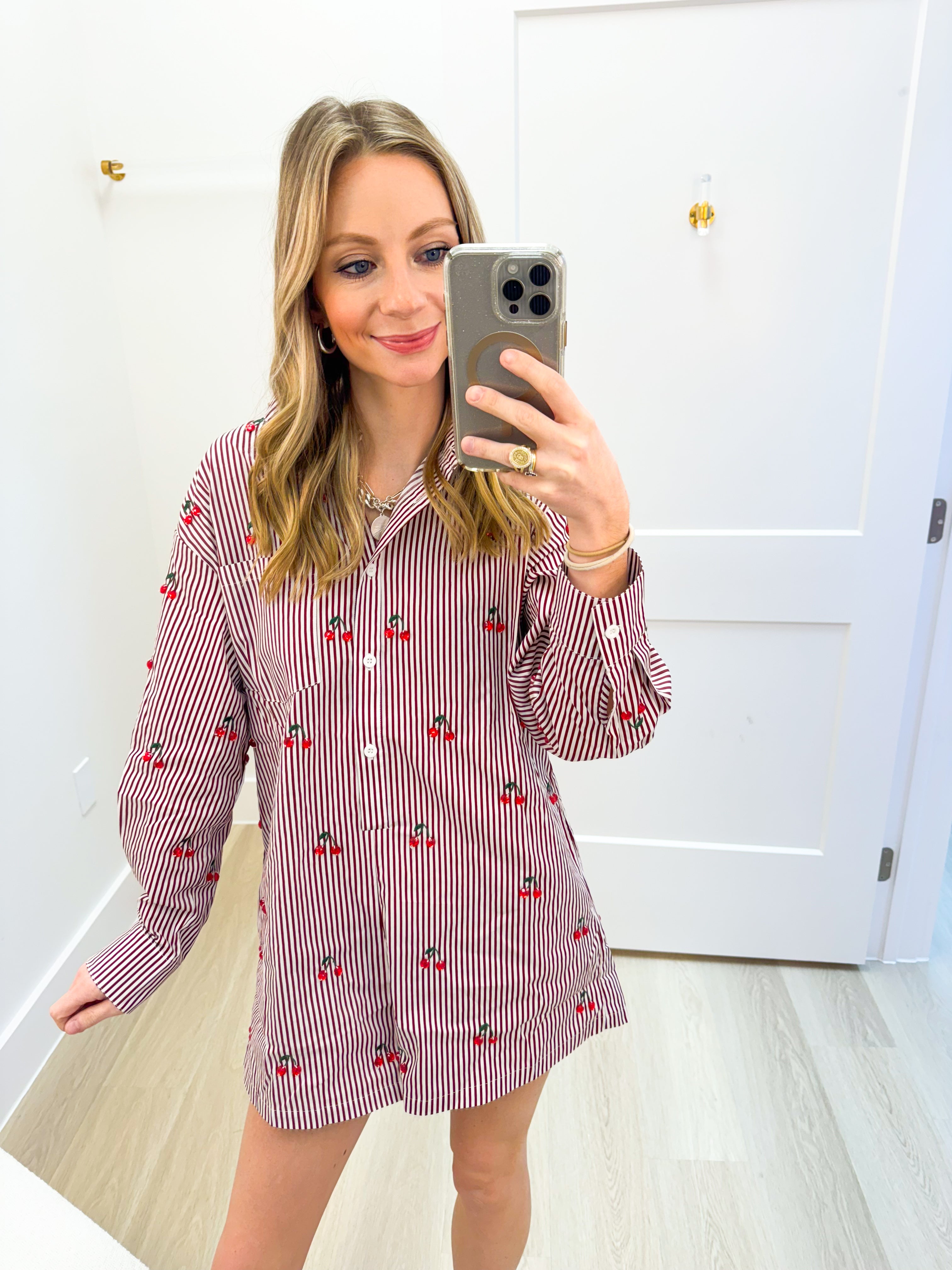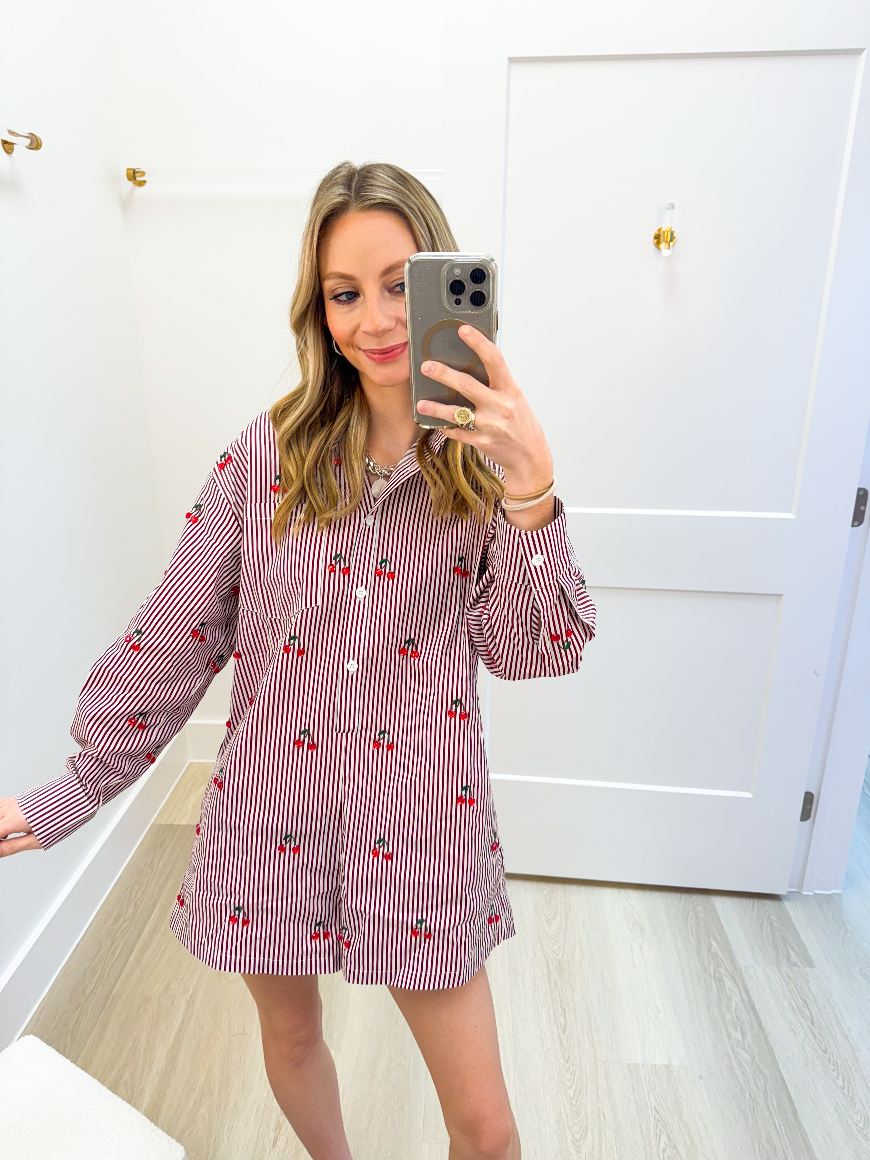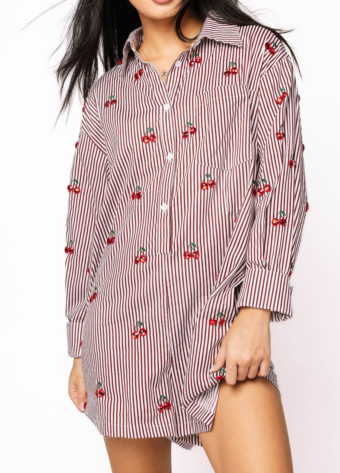Striped Cotton Button Up Long Sleeve Jeweled Cherry Romper Queen of Sparkles