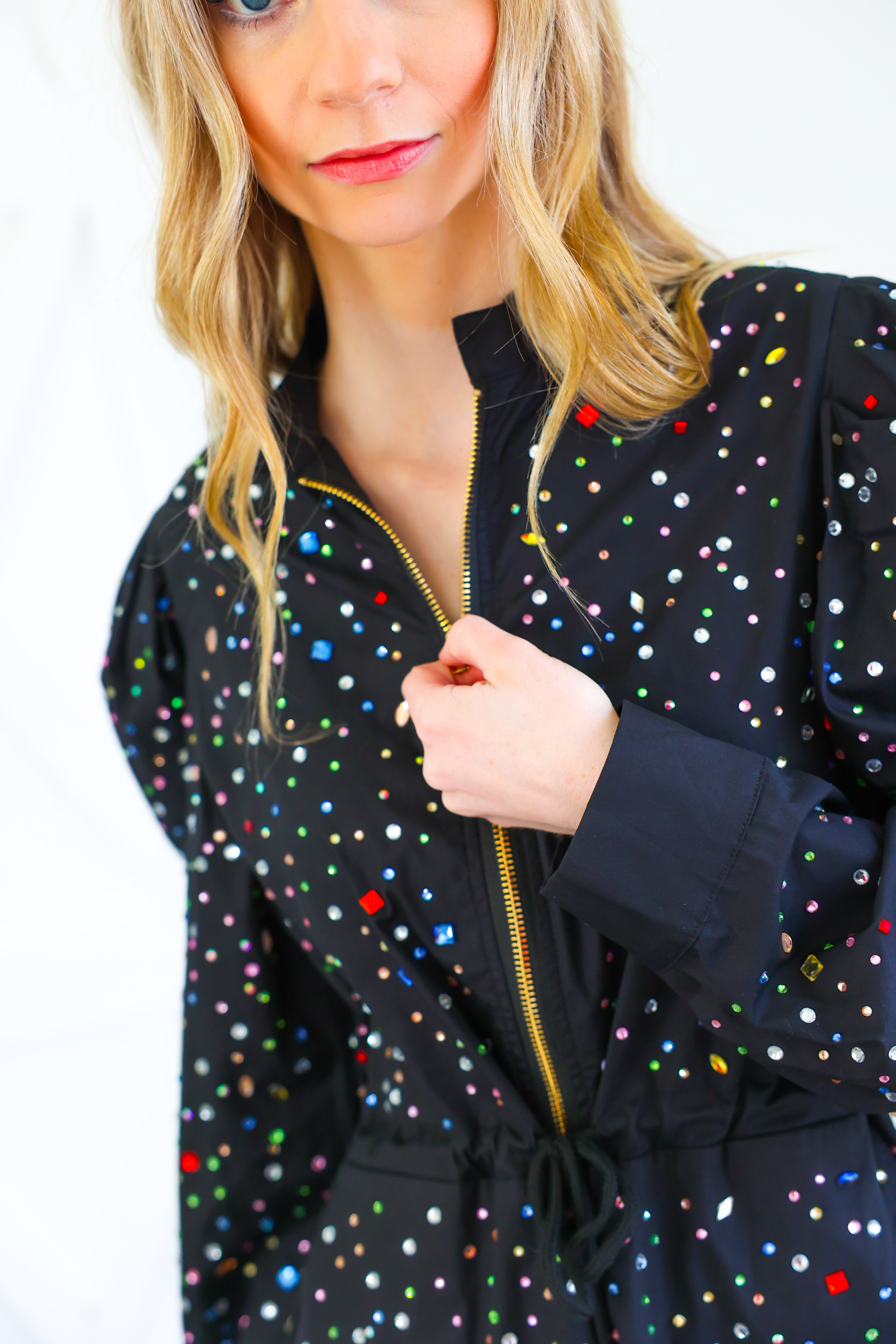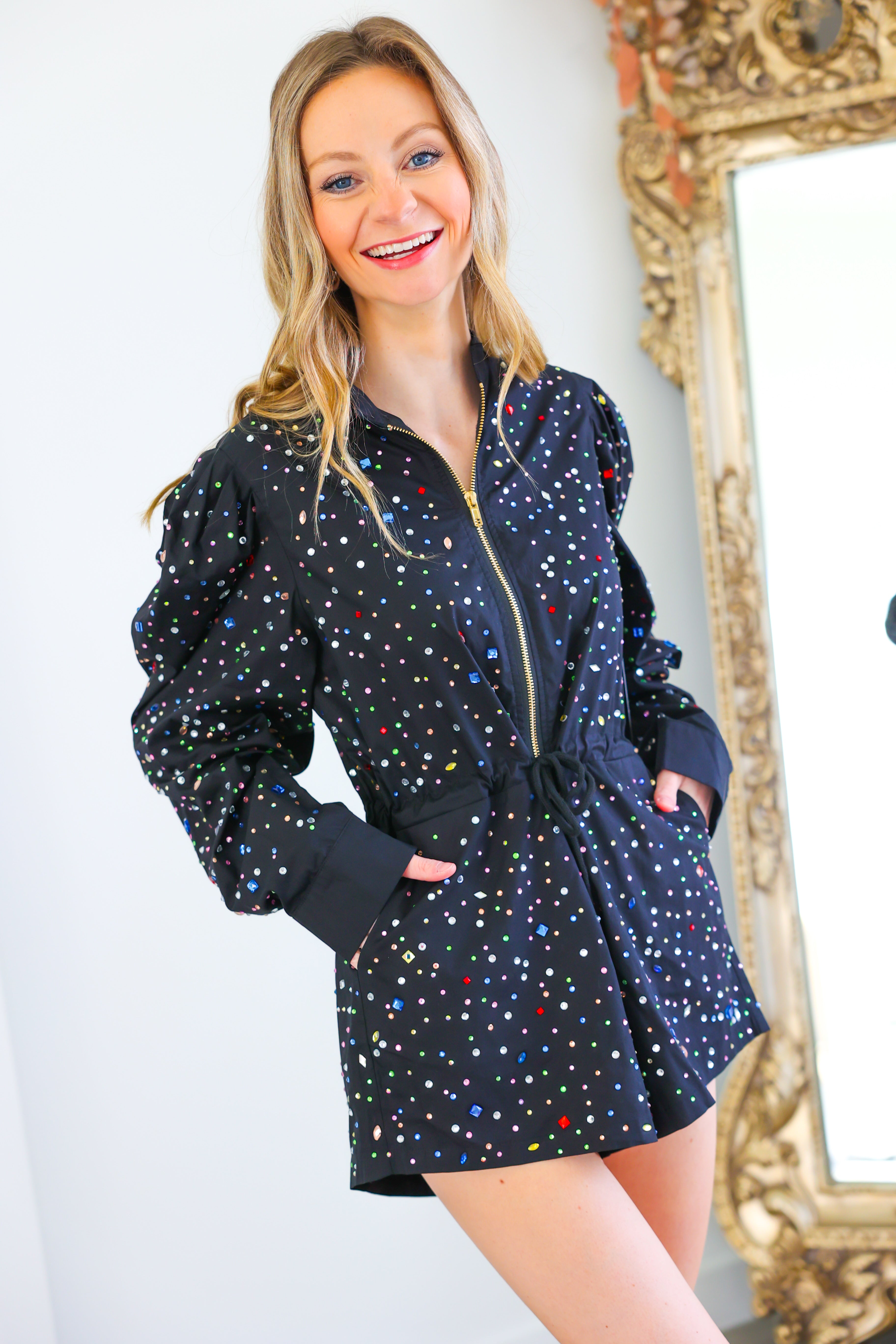 Black Multi Scattered Rhinestone Long Sleeve Romper Queen of Sparkles