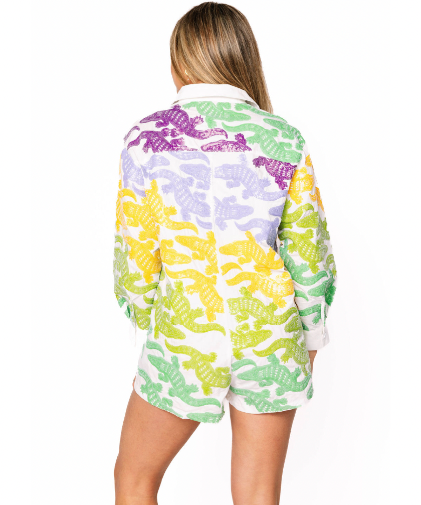 White, Purple, Yellow & Green Alligator Button Up Cotton Romper Queen of Sparkles