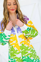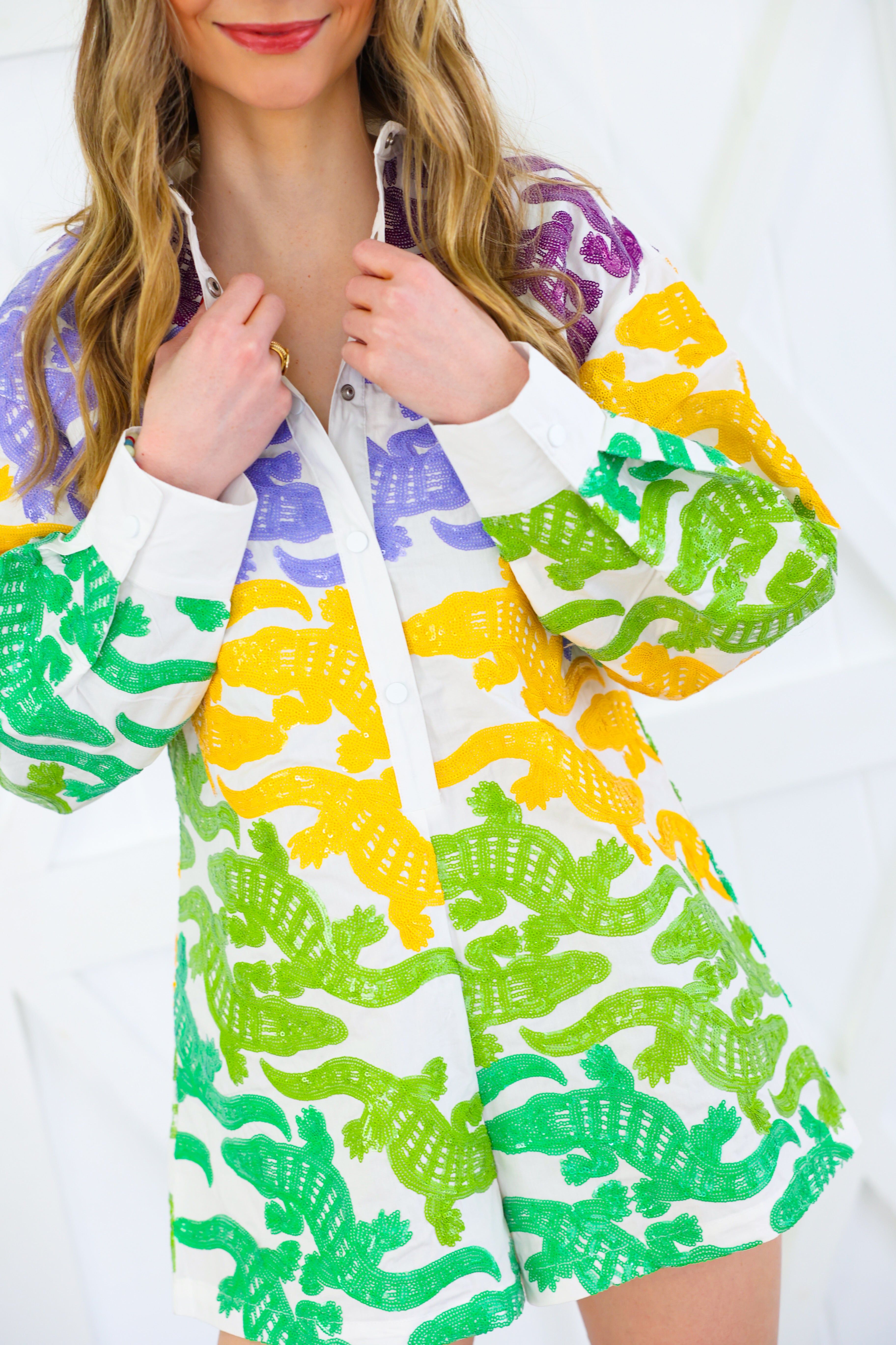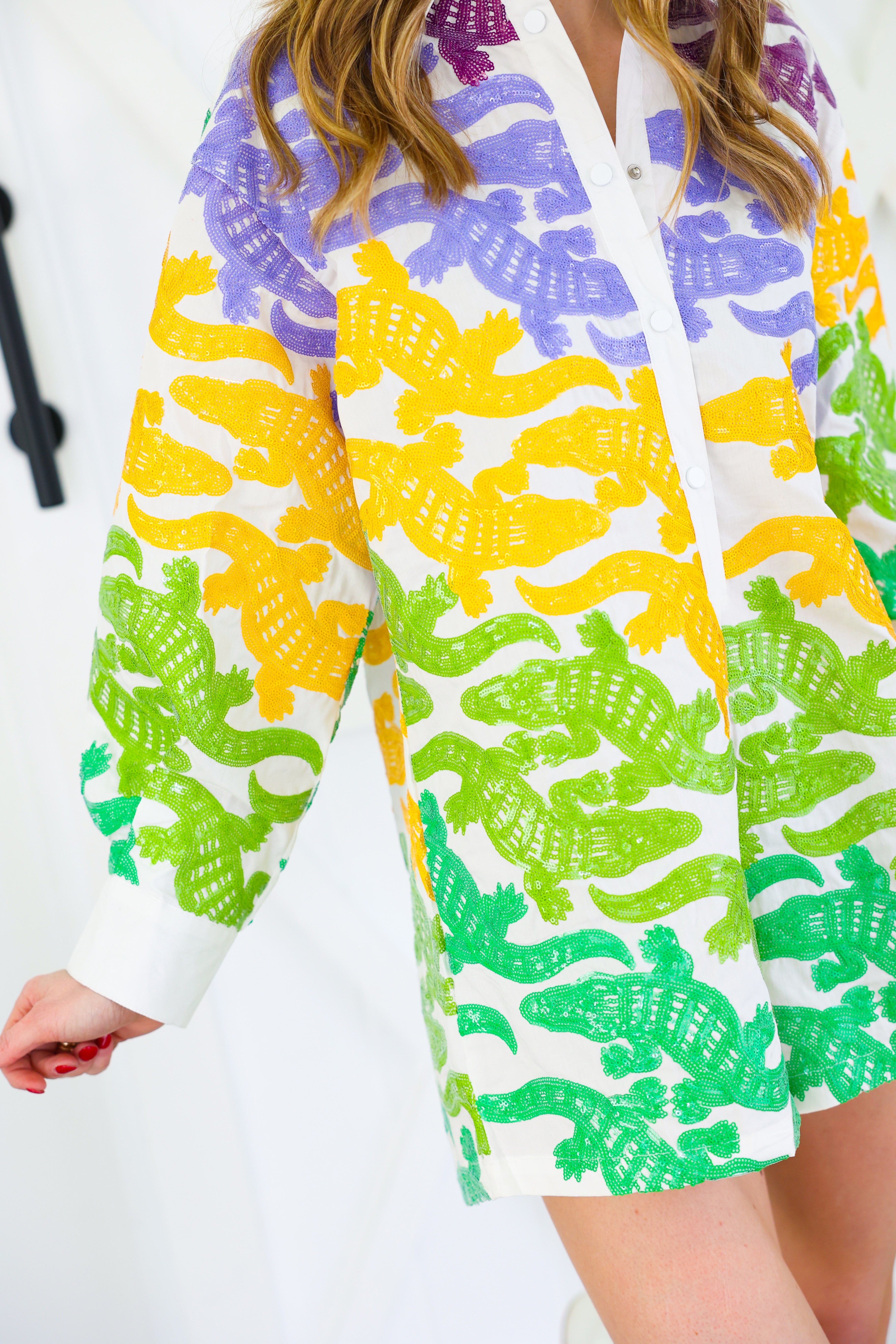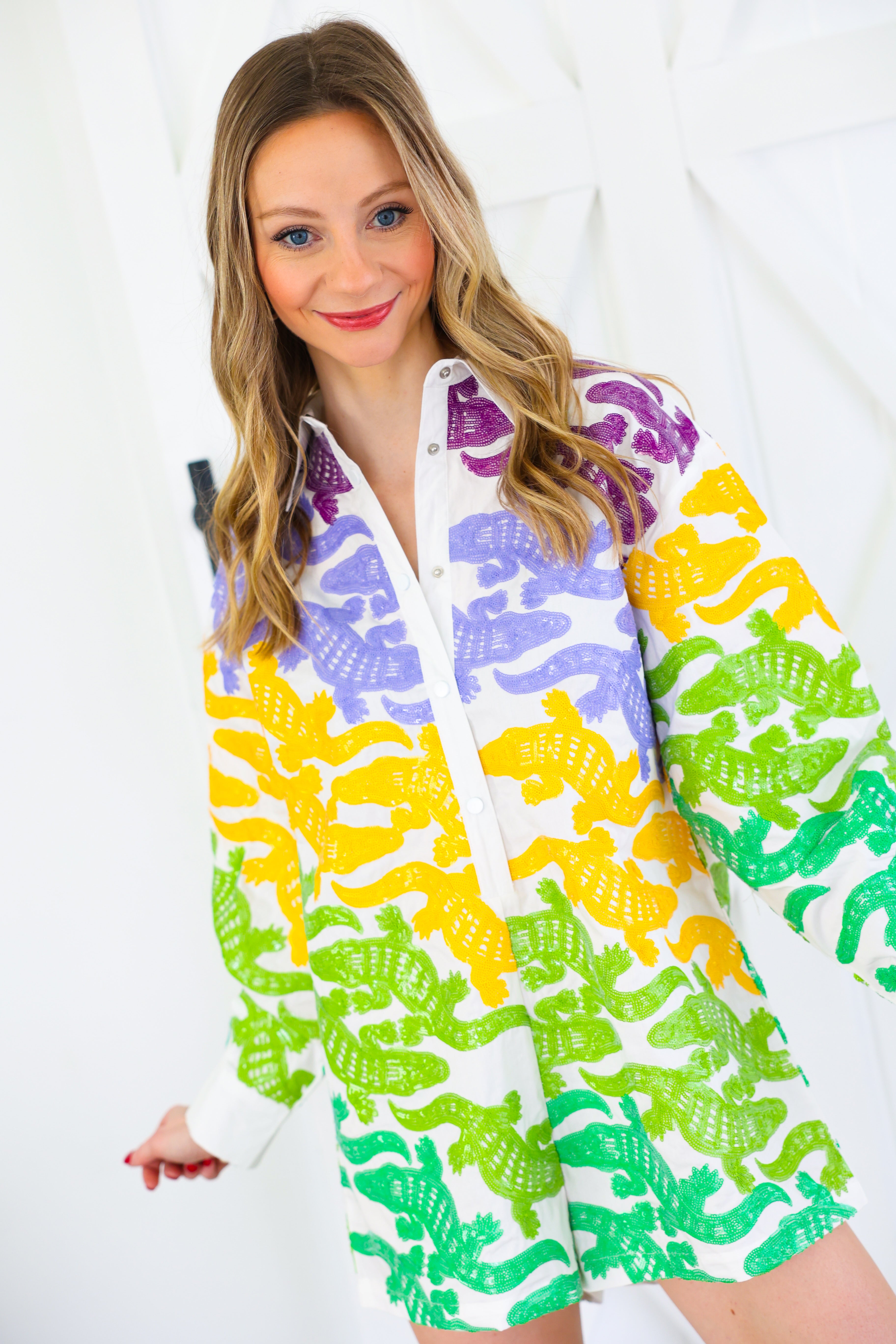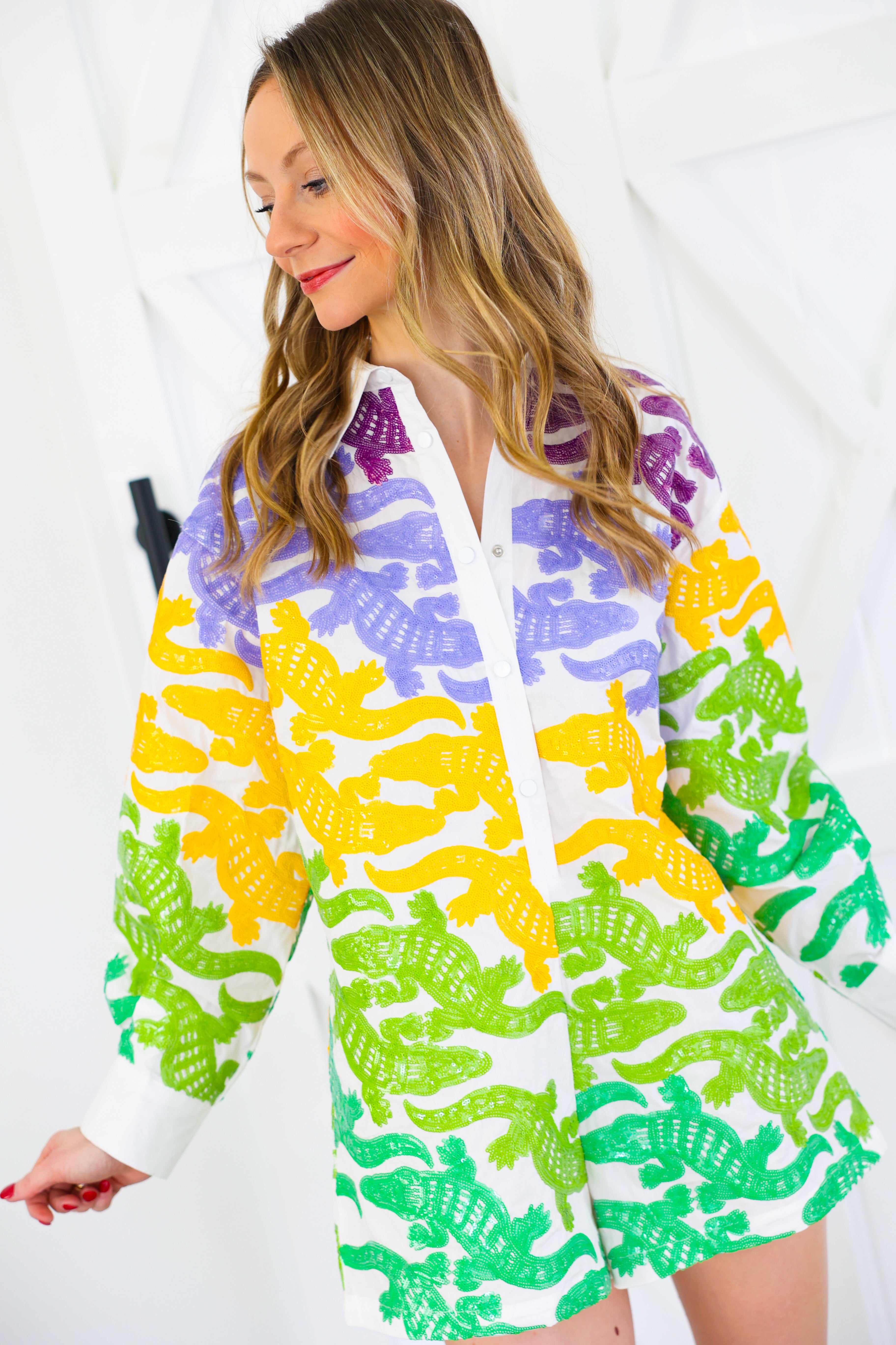 White, Purple, Yellow & Green Alligator Button Up Cotton Romper Queen of Sparkles