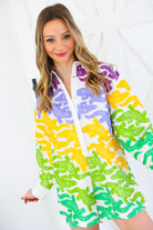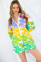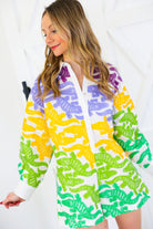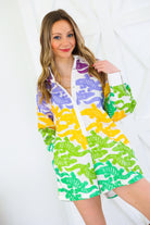 Hop into playful style with this vibrant alligator-themed button-up romper from Queen of Sparkles. Crafted from soft cotton, this charming piece features a bold color palette of white, purple, yellow, and green that brings instant personality to any outfit. The classic button-up design offers easy dressing, while the fun alligator print appeals to those who love whimsical, statement-making fashion. Perfect for casual outings, themed events, or anyone ready to embrace their fun side with confidence and comfort.