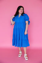 Make a statement in our Soft Skies Blue Gingham Midi Dress! With a playful blue gingham print and short puff sleeves with ties, this dress is both stylish and flattering. Perfect for spring, it's a must-have addition to any wardrobe!
