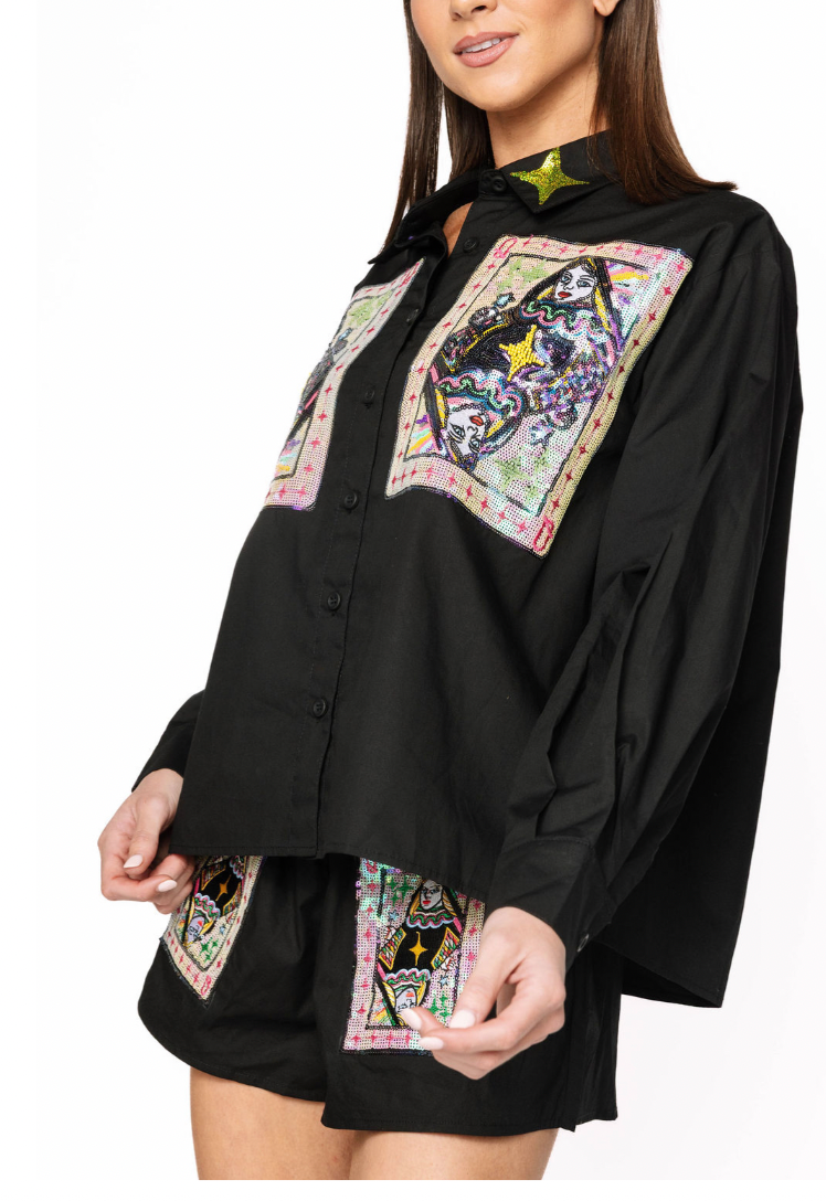 Black Queen Card & Sparkle Collar Button Up Cotton Shorts Queen of Sparkles