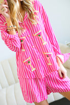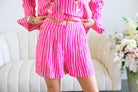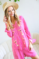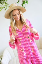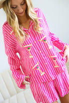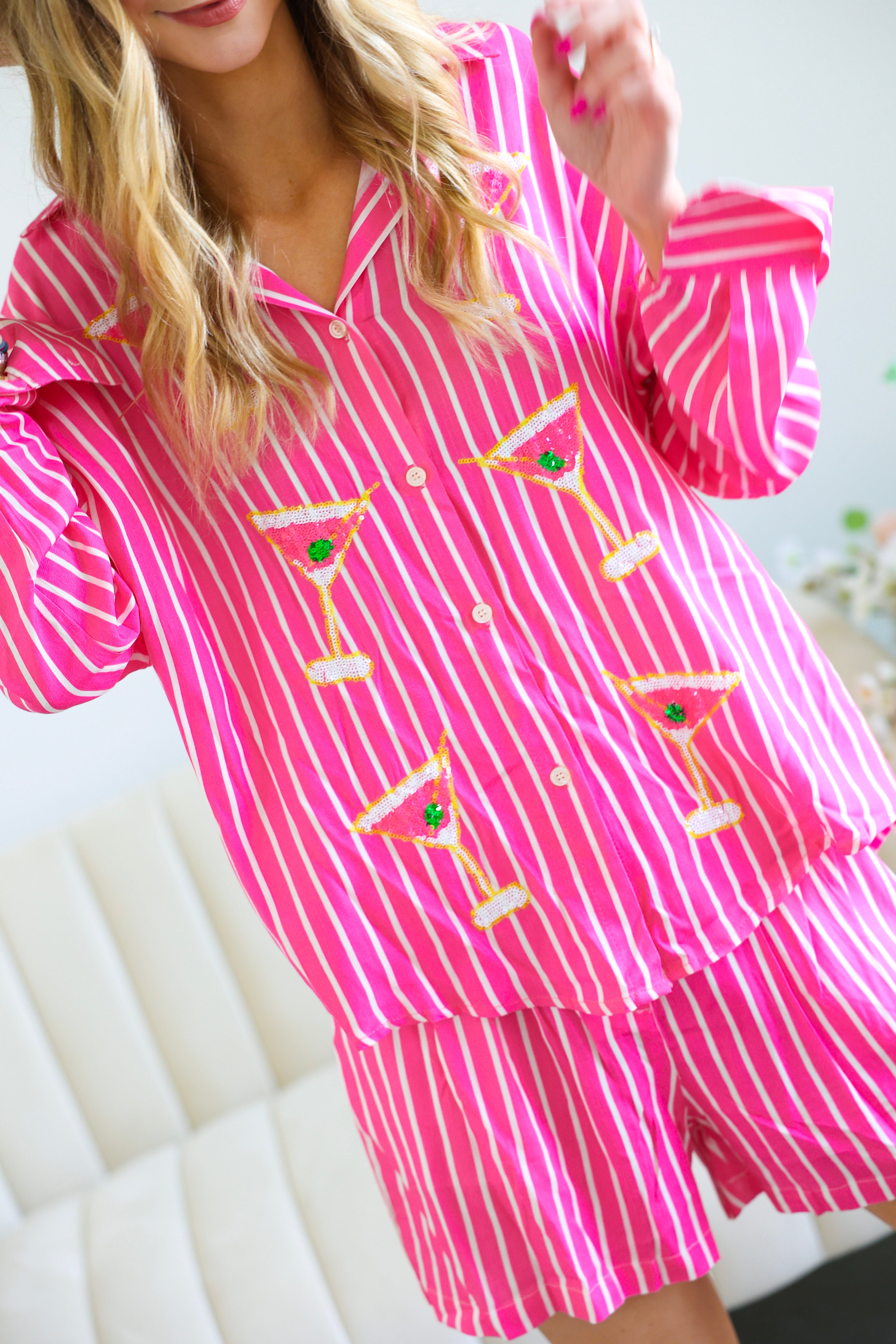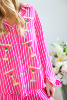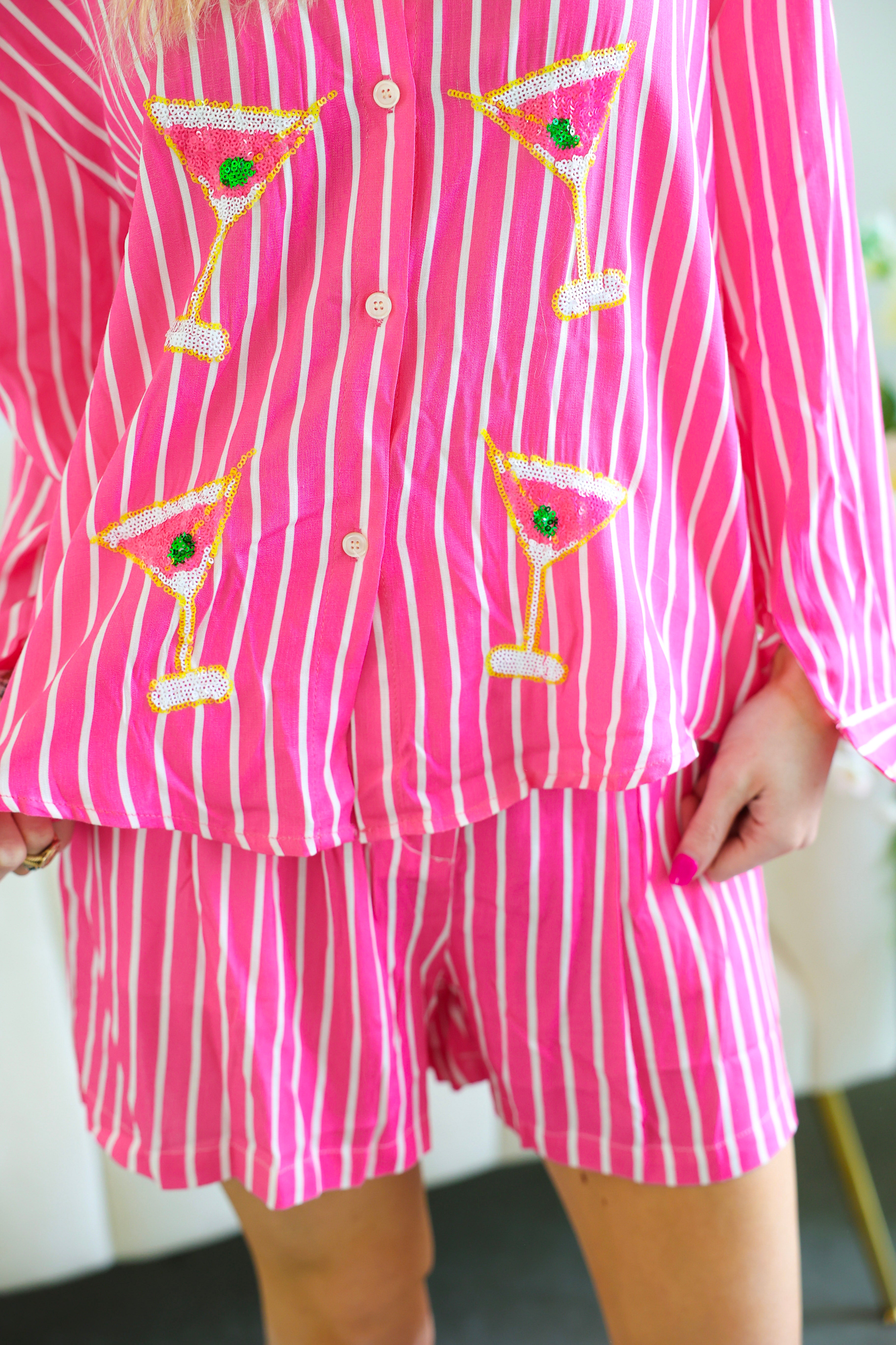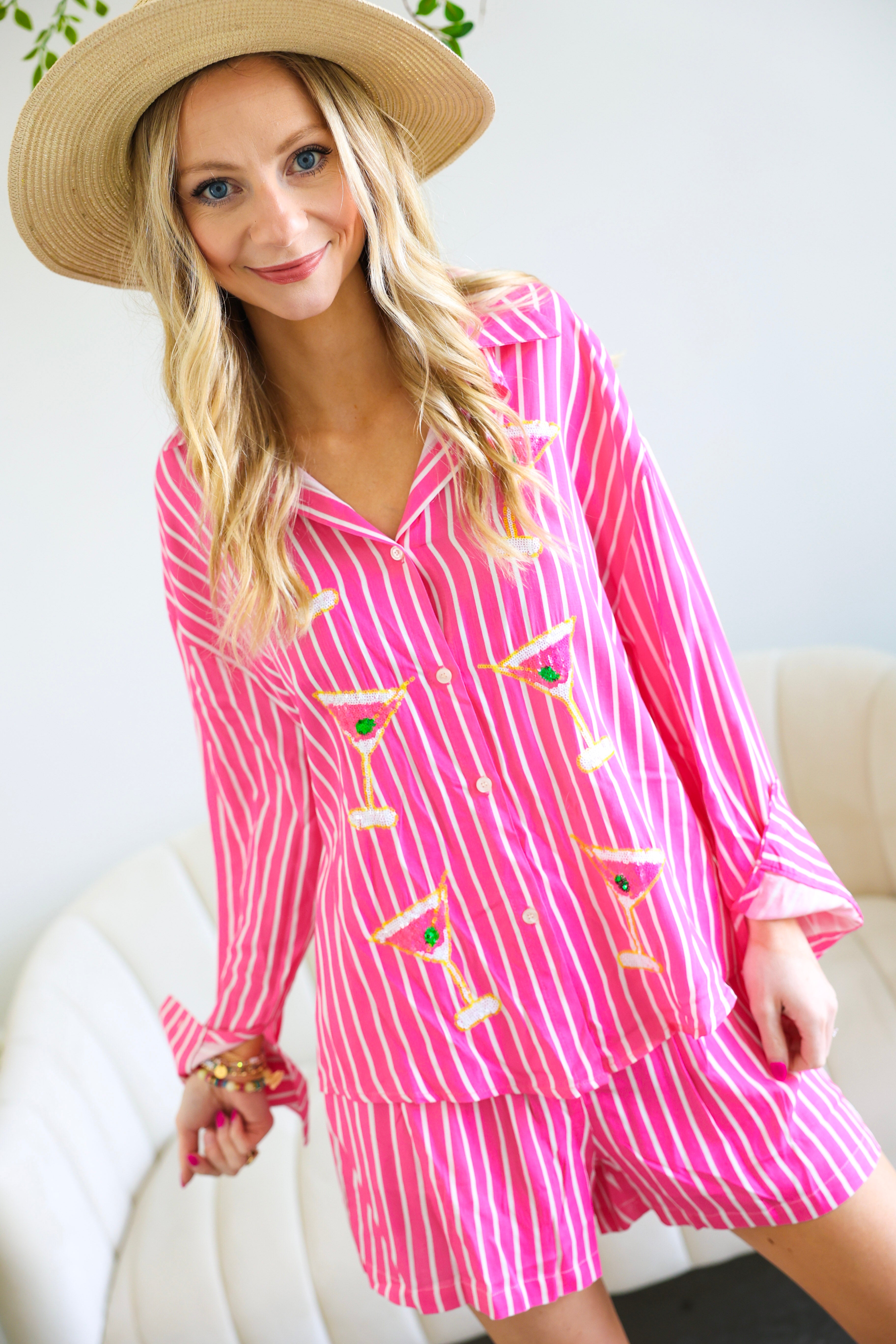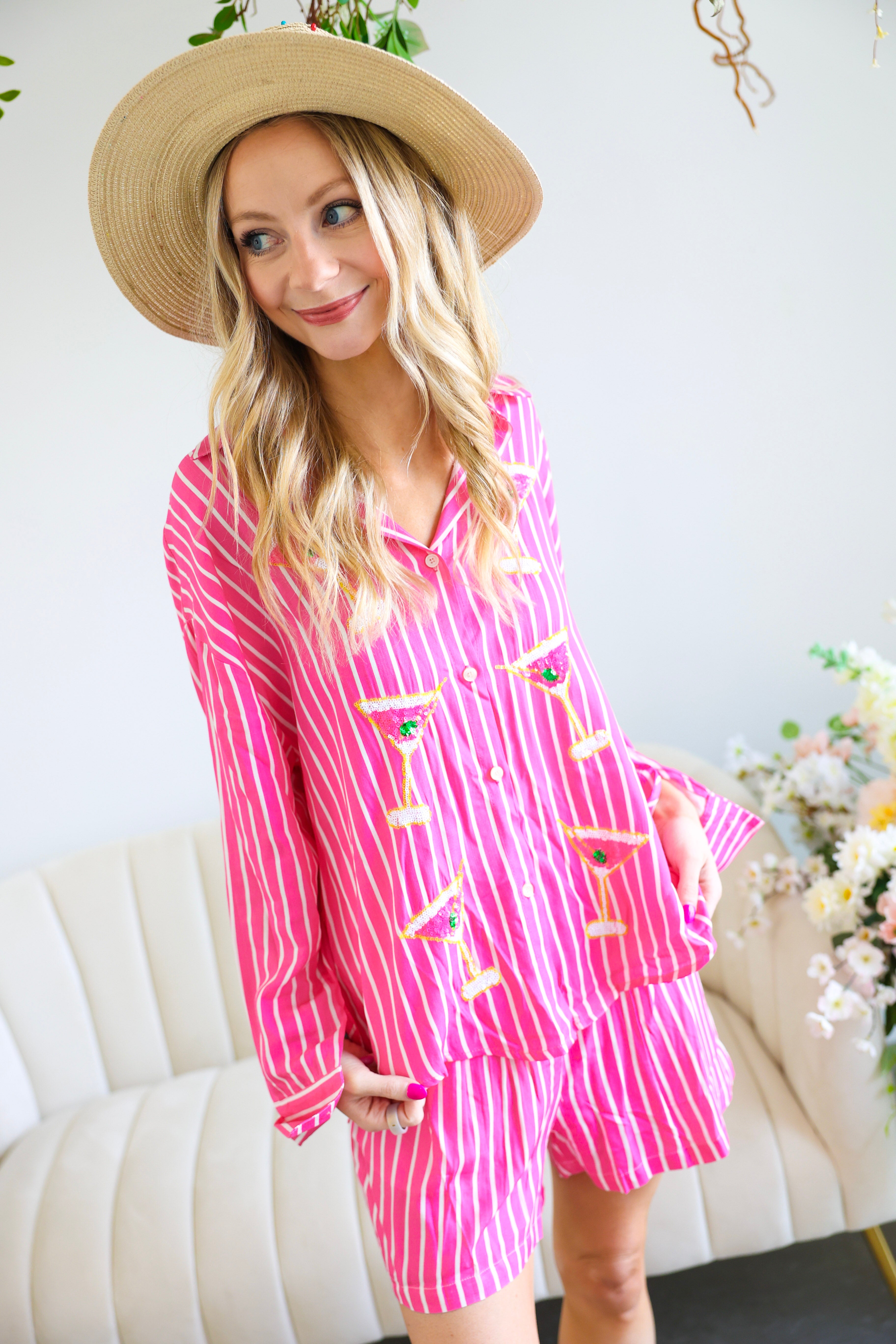 This Pink Button Down Shirt & Short Set is the ultimate statement summer matching set. Featuring bold pink and white stripes with sequin martini glass appliqué details 🍸, this two-piece look is playful, eye-catching, and made for celebrating.