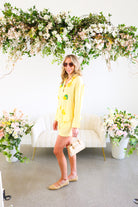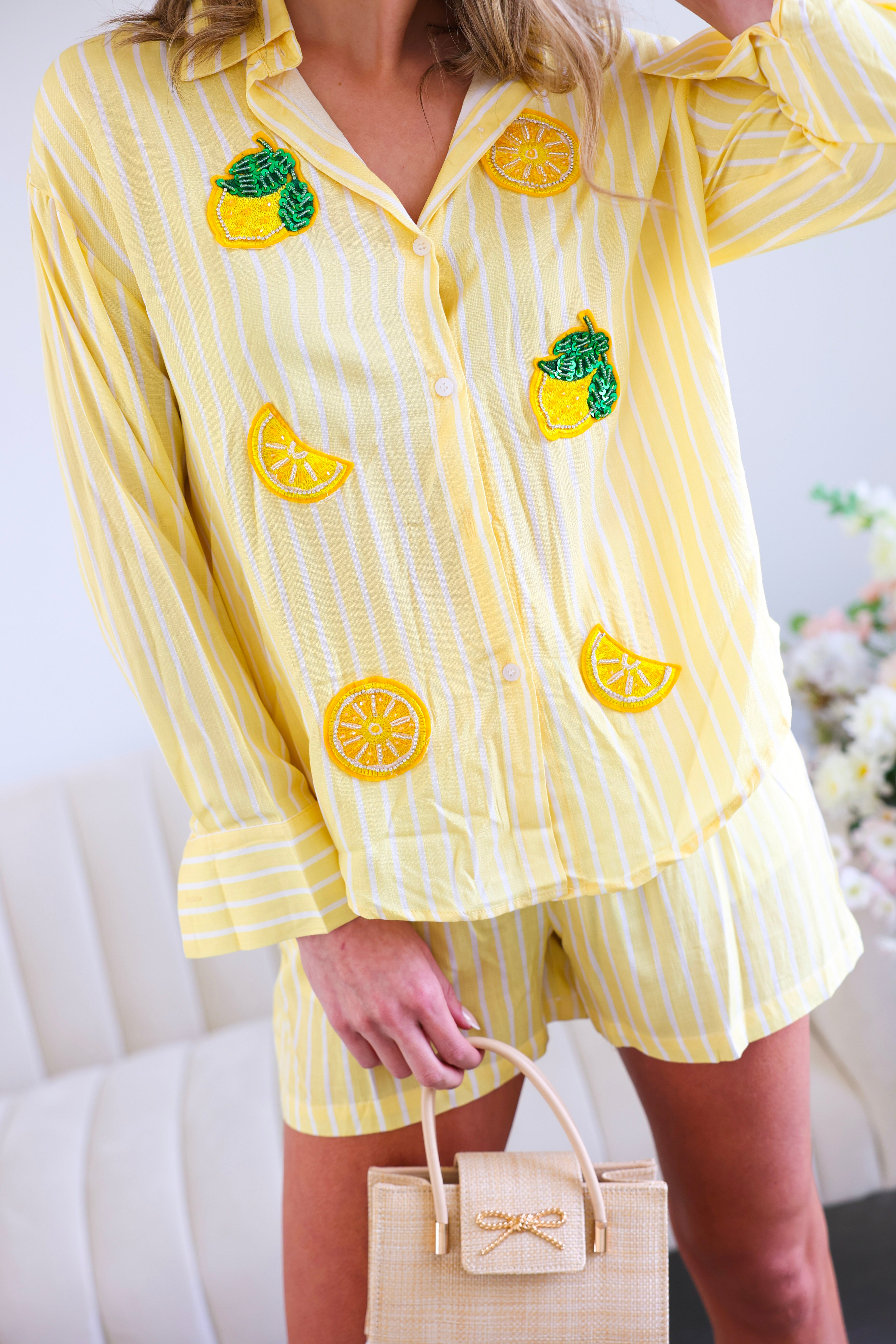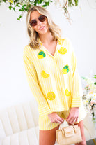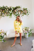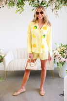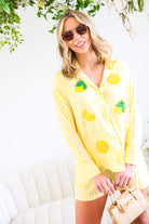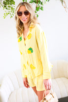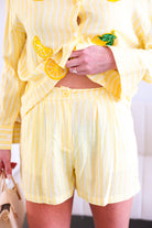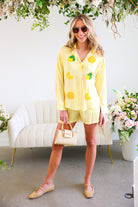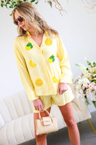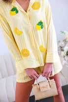 This Yellow Button Down Shirt & Short Set is the ultimate feel-good summer matching set. Featuring soft yellow and white stripes with playful embroidered lemon and citrus appliqué details 🍋, this two-piece look is equal parts polished and fun.