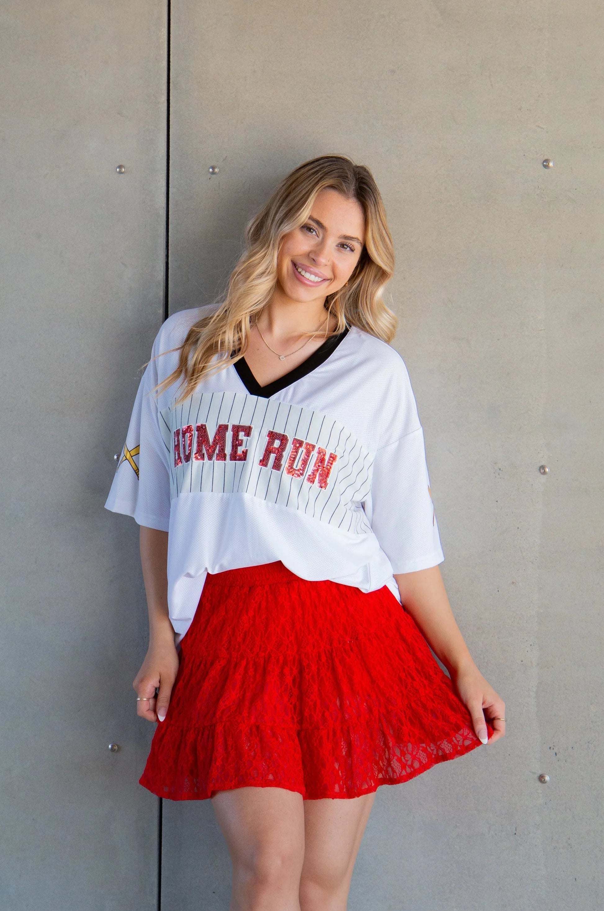 Game day, but glam. The Grand Slam Sequin Jersey Top brings sparkle to the stands with bold sequin lettering and a classic jersey silhouette.