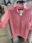Crisp, classic, and effortlessly chic. The Strawberry Stripe Shirt Dress features bold pink and white stripes in a timeless button-front silhouette that feels polished yet easy. With its tailored structure and relaxed fit, this dress transitions seamlessly from weekday errands to weekend brunch.
