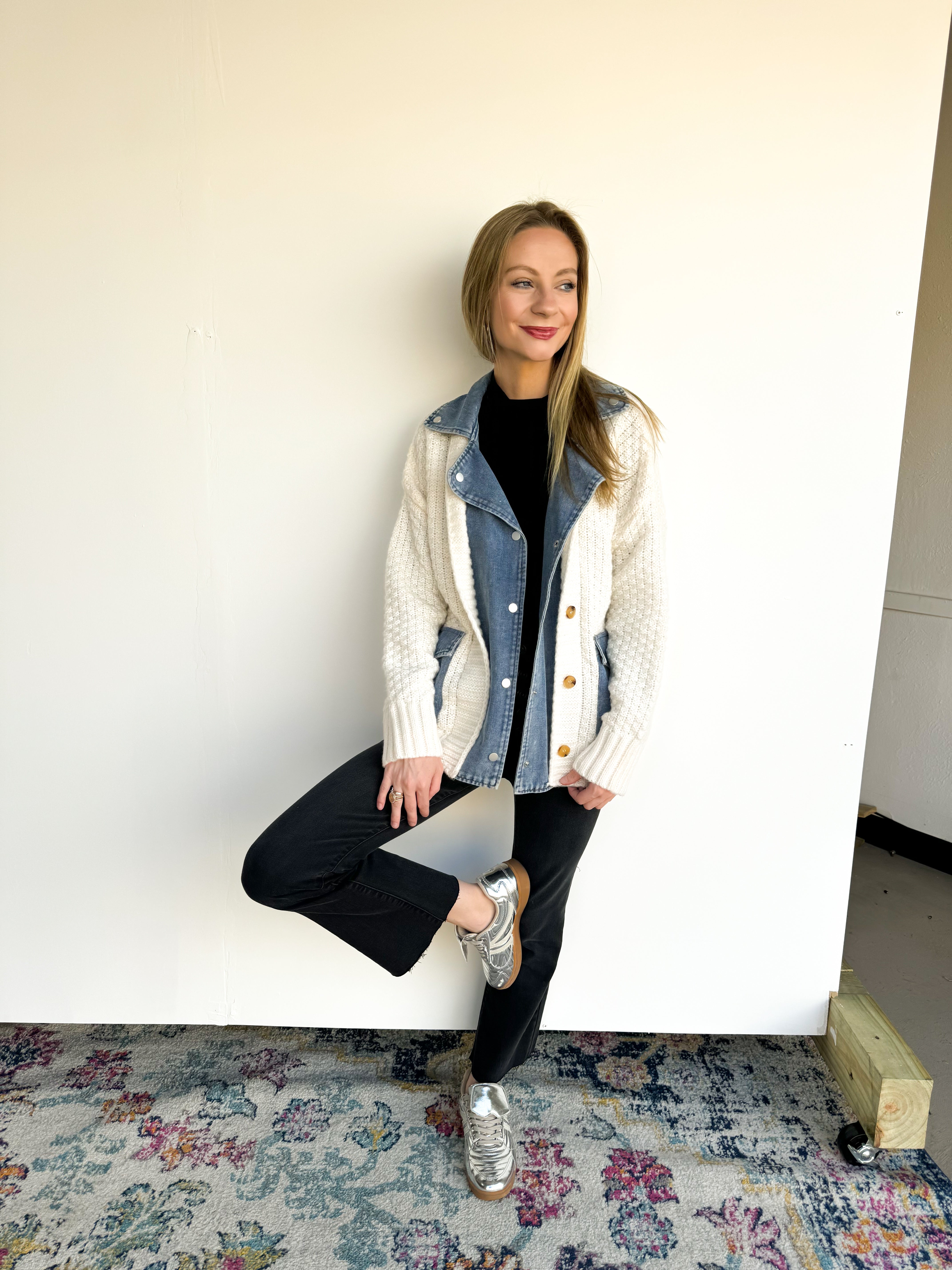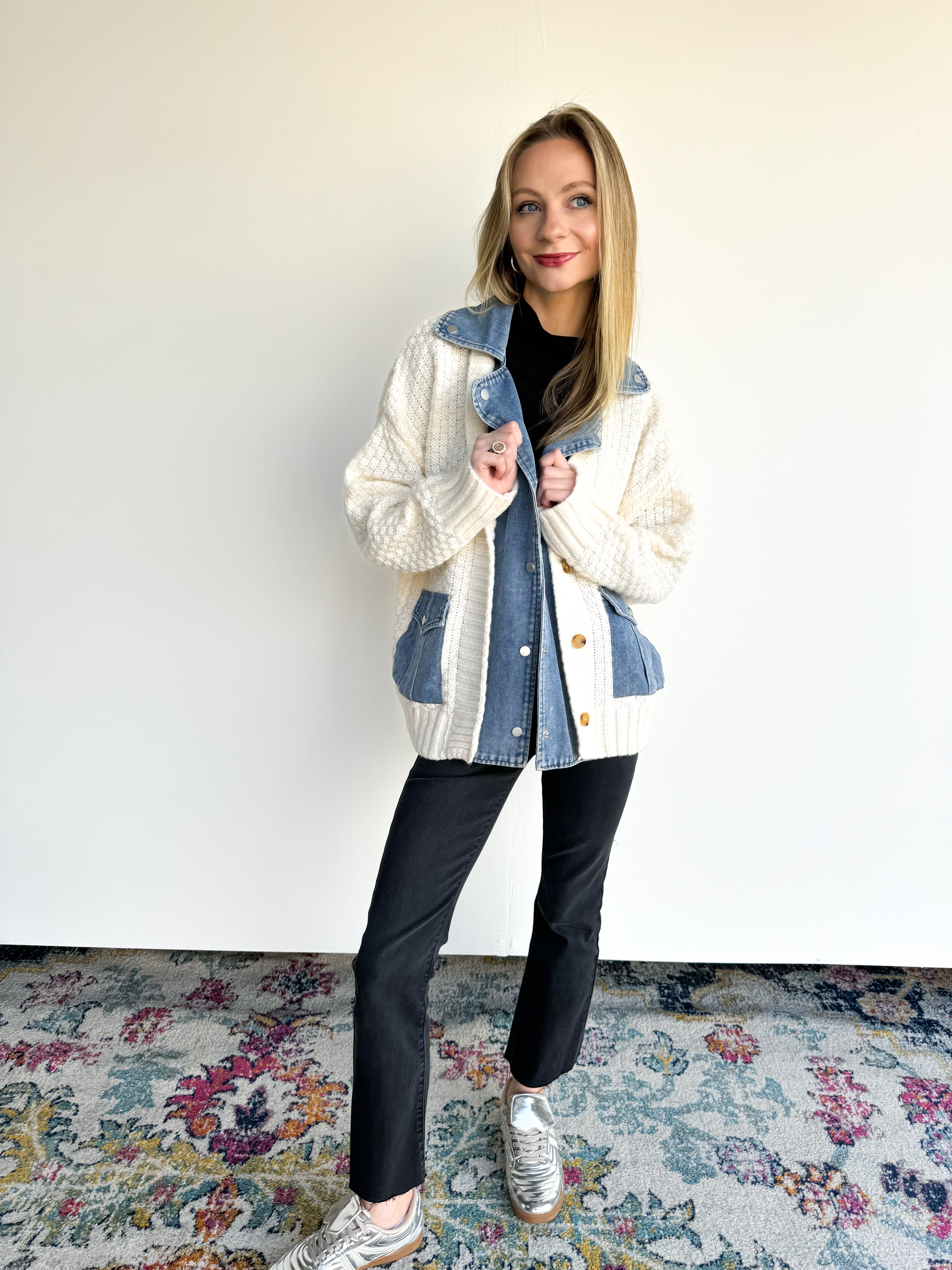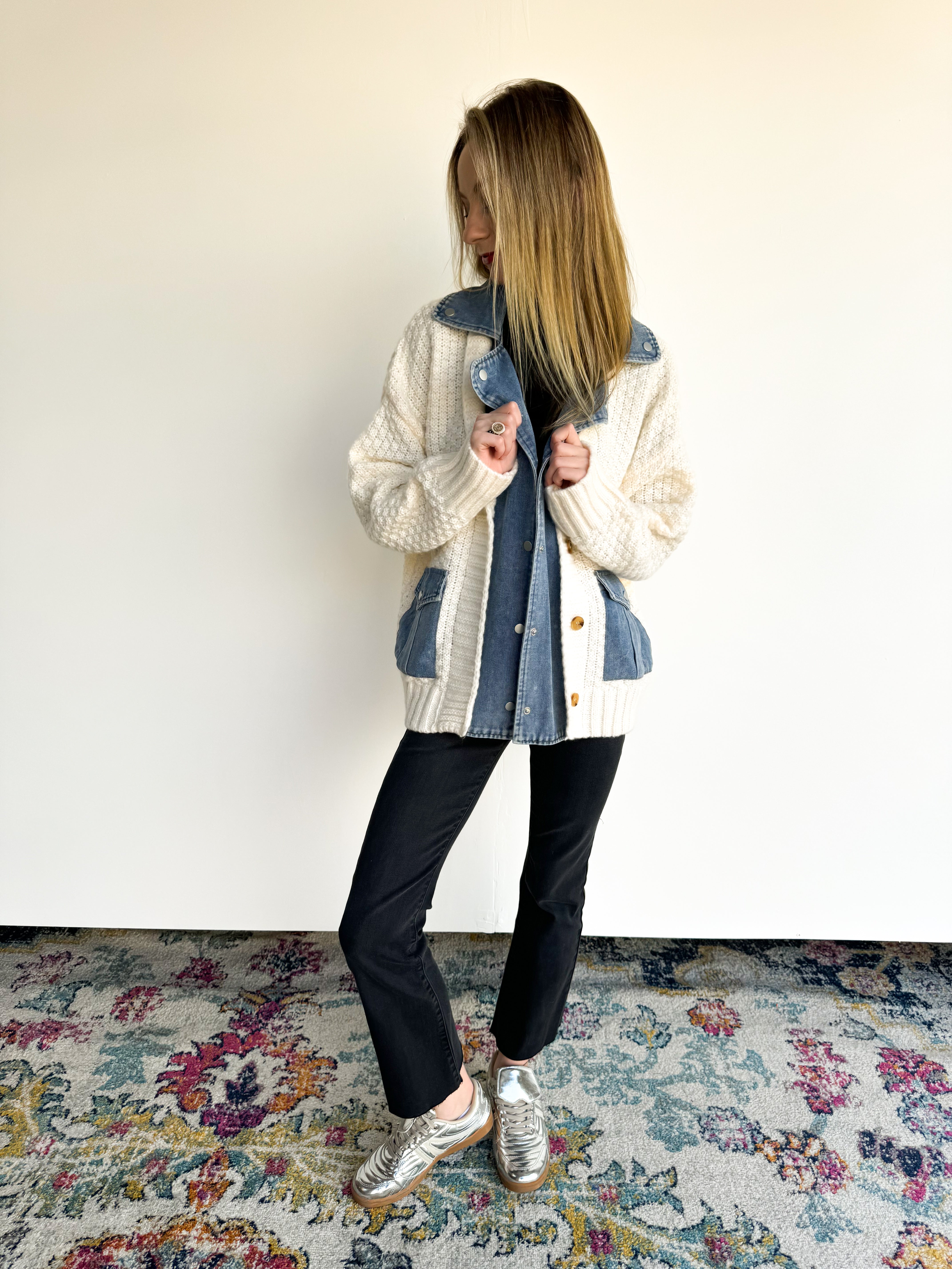 - Cardigan/denim combo
