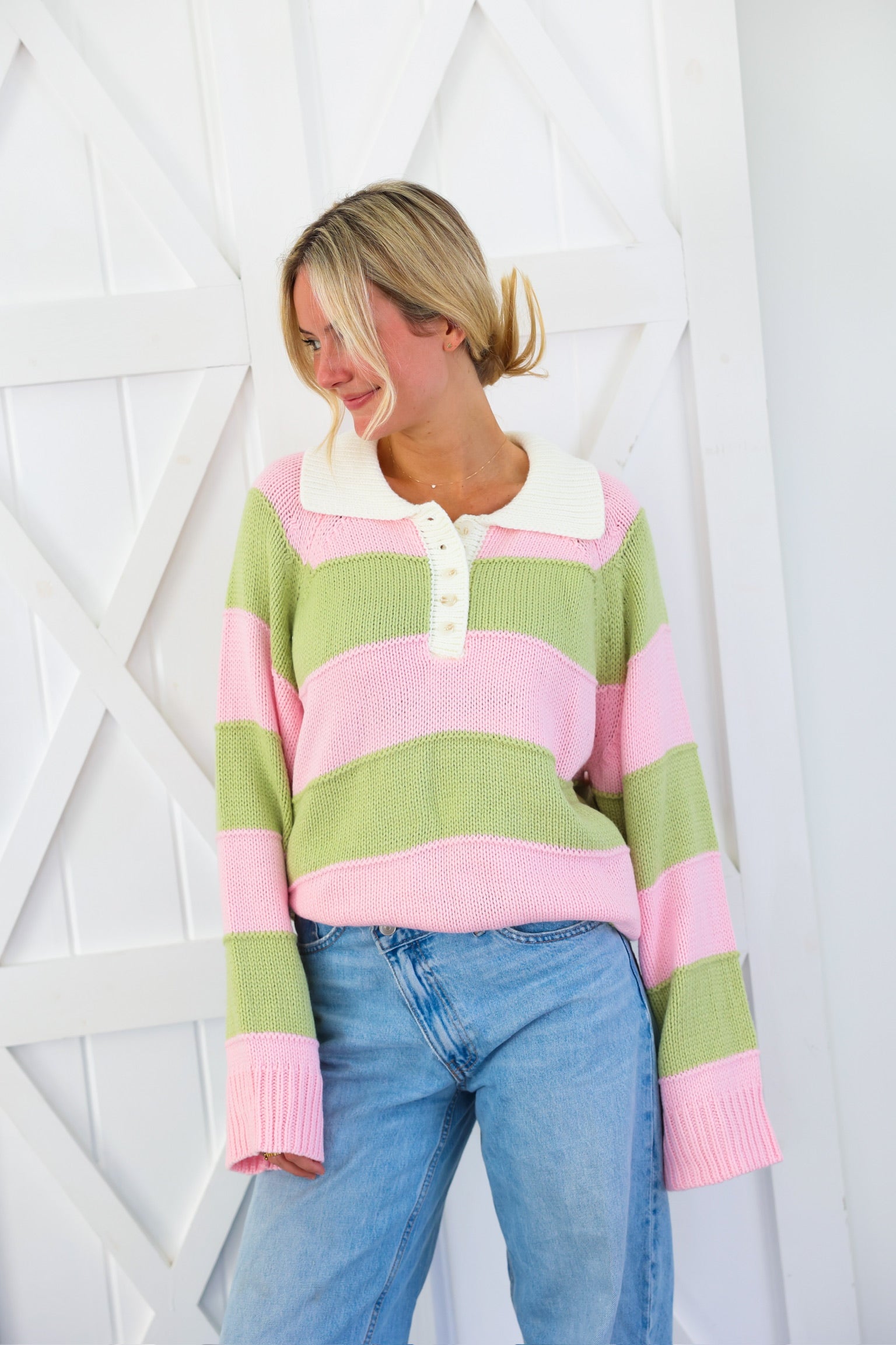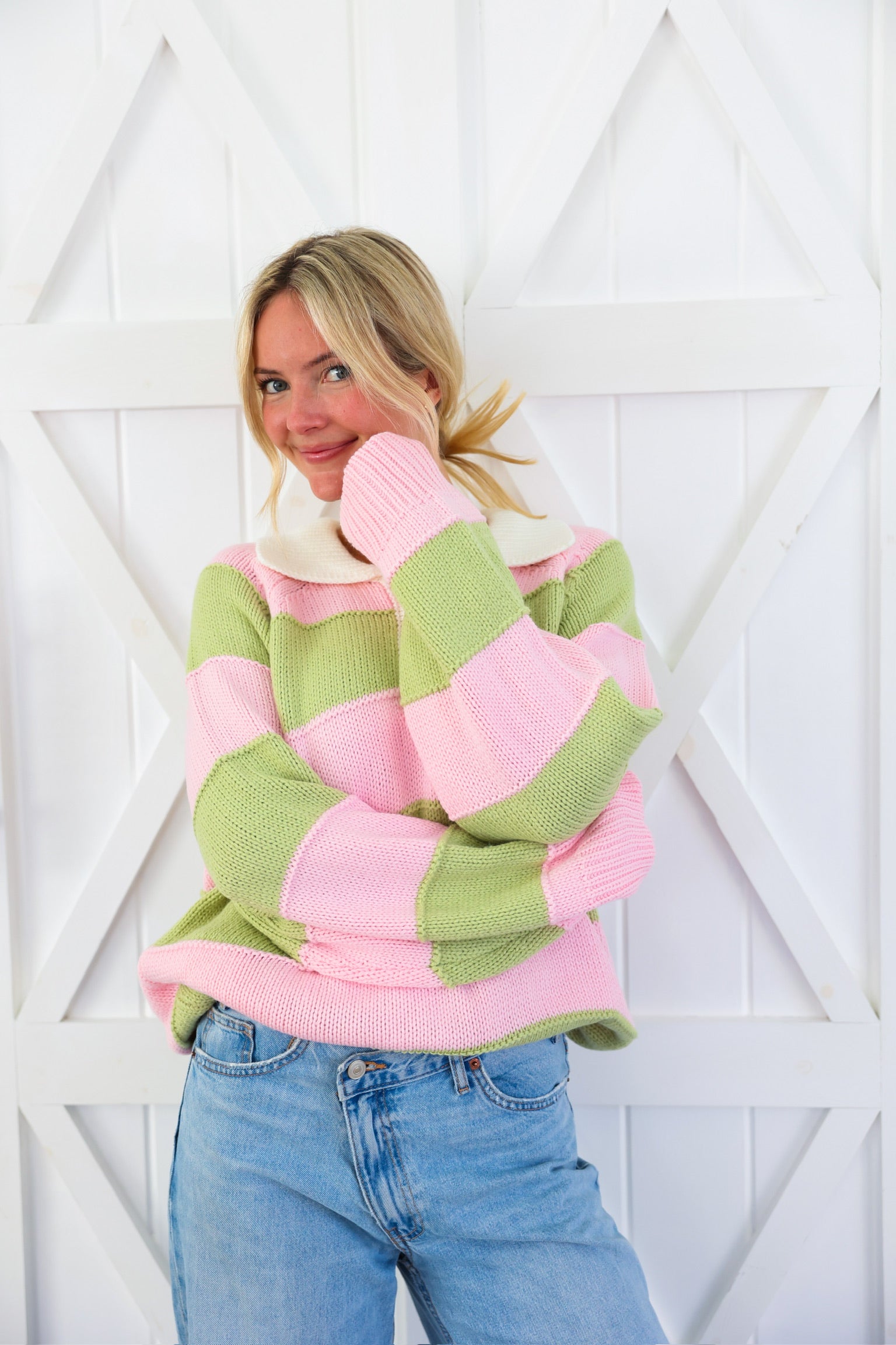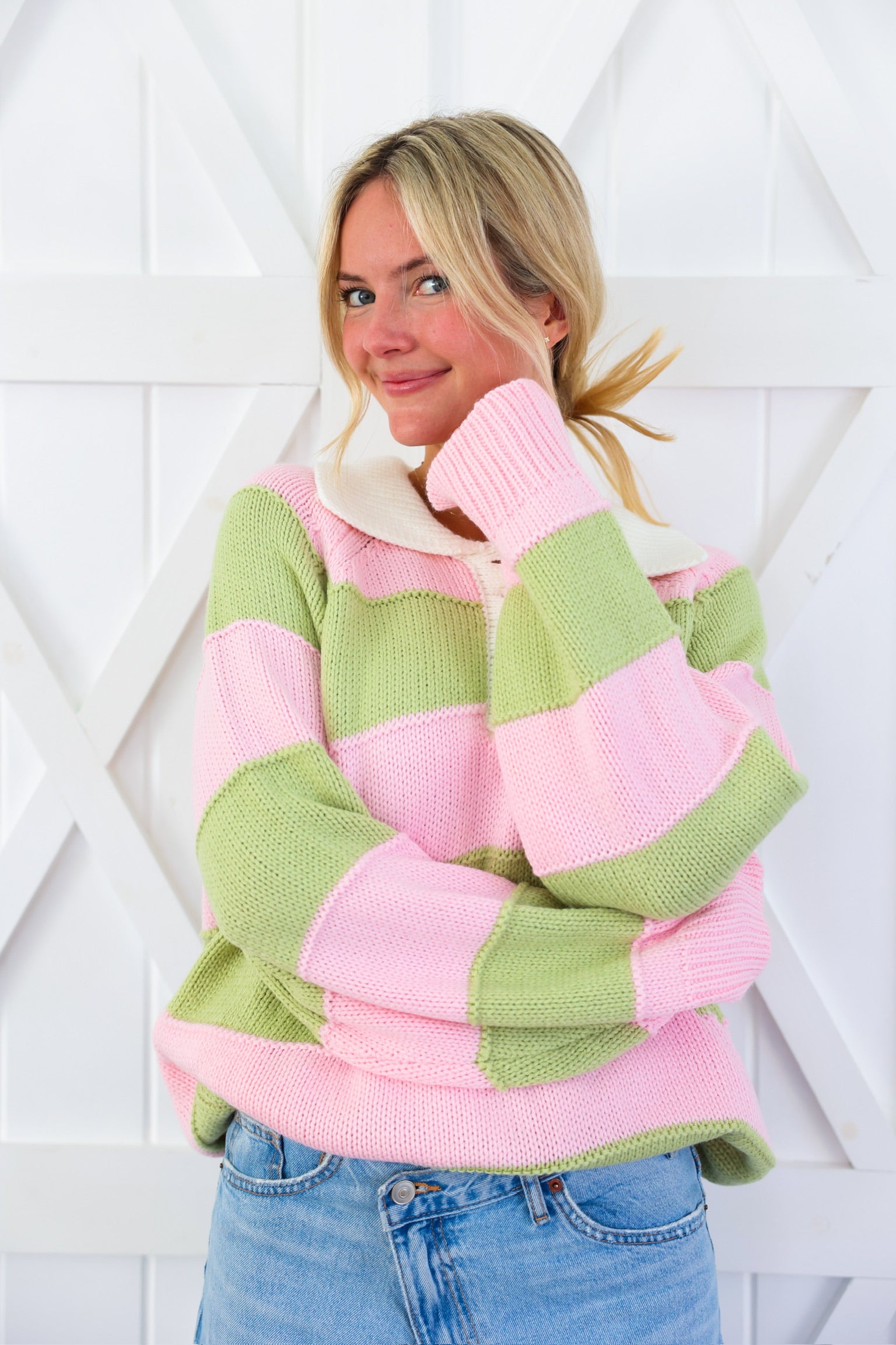 Cozy meets cute in this effortlessly charming striped knit sweater by Peach Love. Featuring soft pink and sage wide stripes, this relaxed pullover is finished with a crisp contrast collar and a partial button neckline for a playful, preppy touch. The textured knit gives it that lived-in, comfy feel while still looking put-together—perfect for everyday wear.