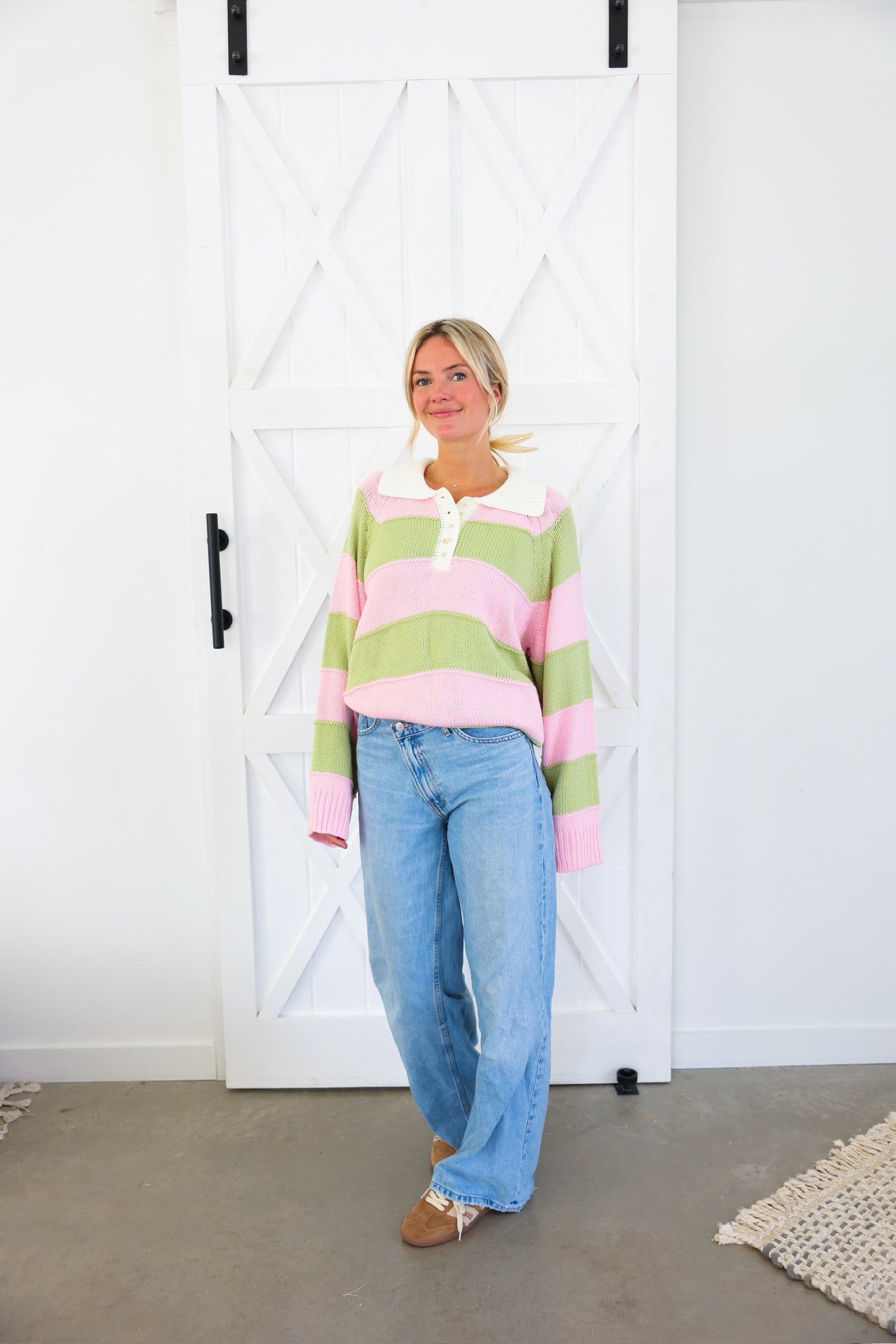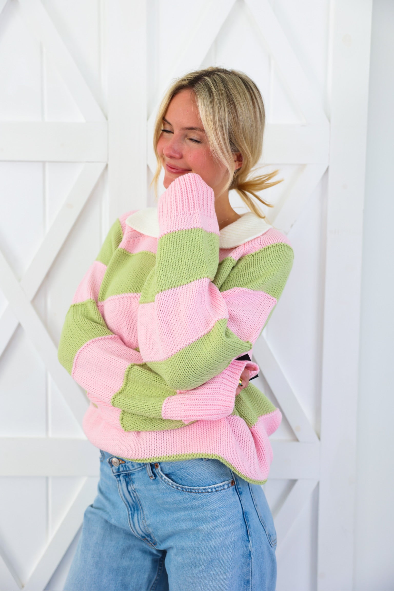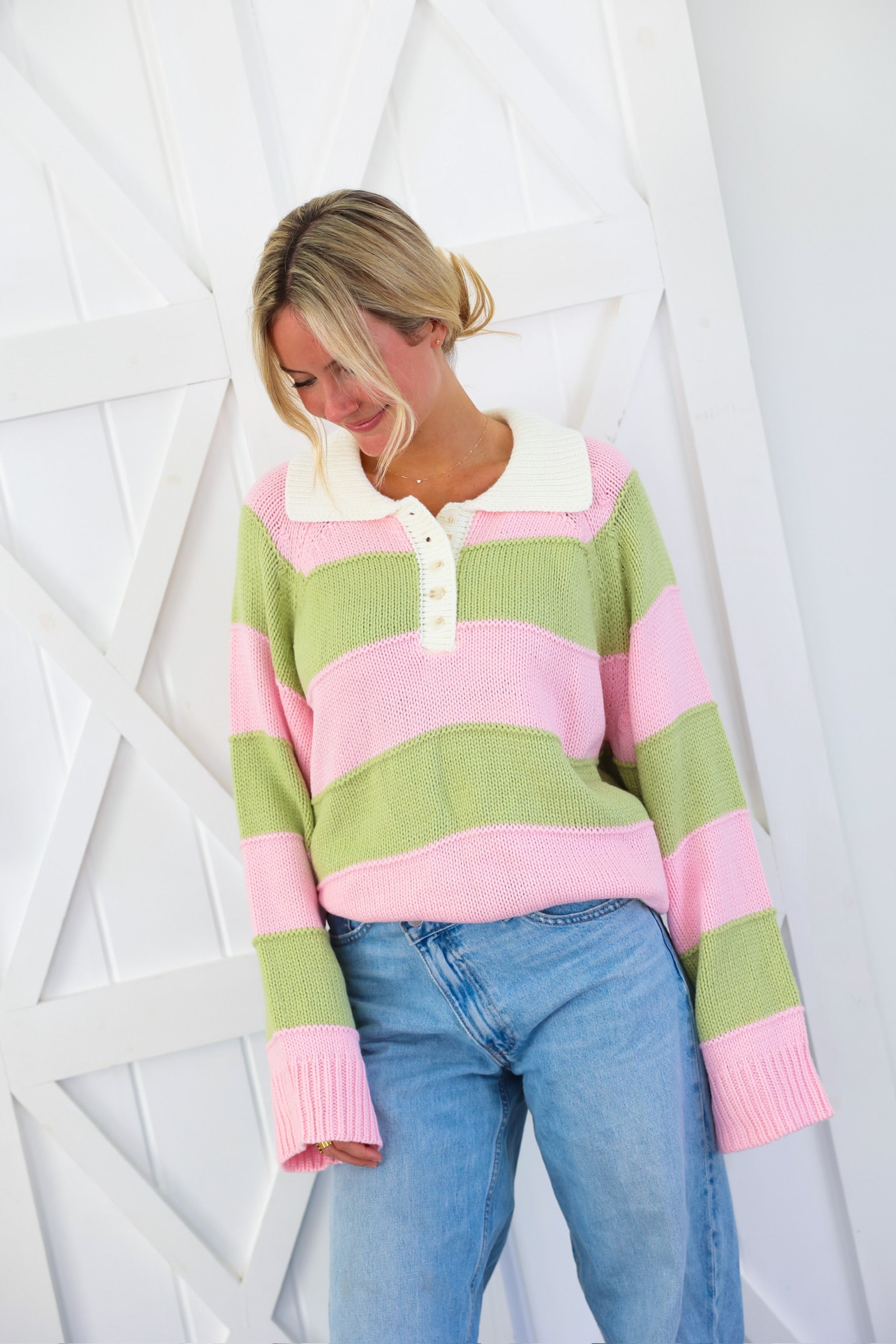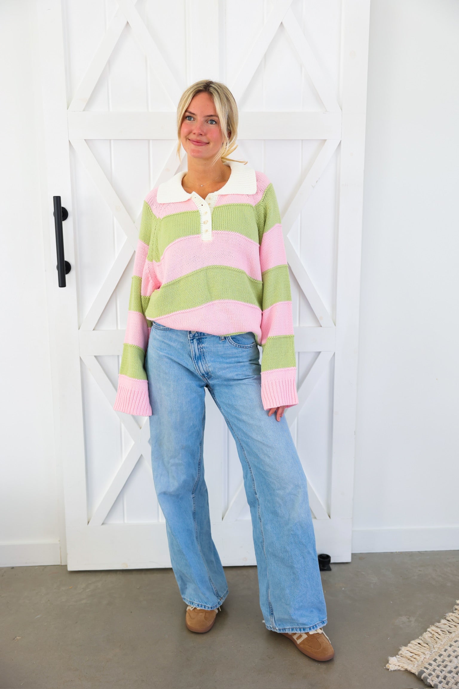 Cozy meets cute in this effortlessly charming striped knit sweater by Peach Love. Featuring soft pink and sage wide stripes, this relaxed pullover is finished with a crisp contrast collar and a partial button neckline for a playful, preppy touch. The textured knit gives it that lived-in, comfy feel while still looking put-together—perfect for everyday wear.