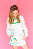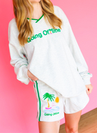 - Beach graphics on right thigh featuring palm tree, sun, bird, and the ocean in distressed screen print