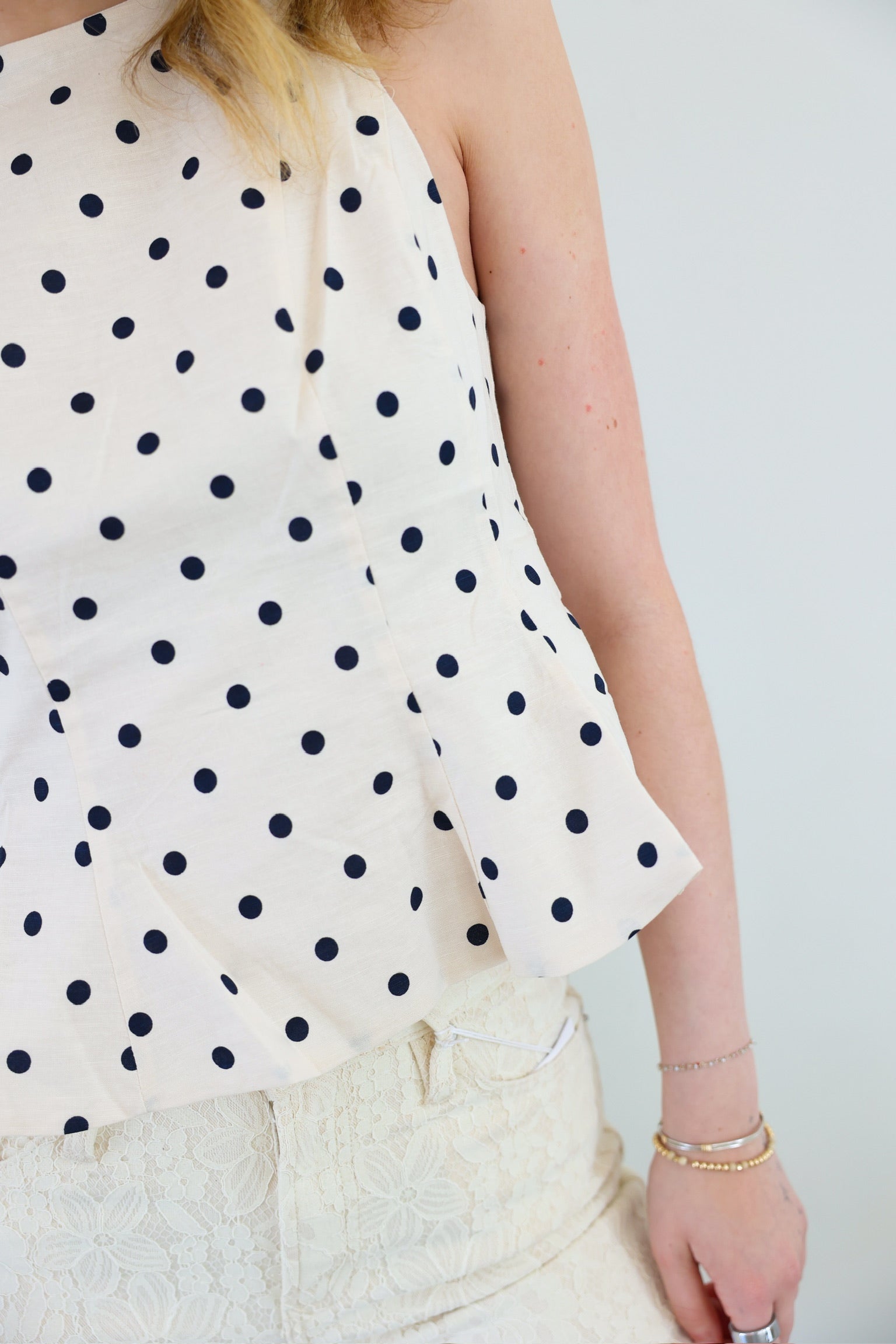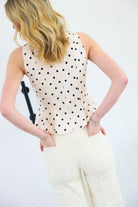 Classic meets charming in this effortlessly flattering peplum tank from THML. Featuring a timeless navy polka dot print on a soft cream base, this sleeveless top is designed with subtle tailoring through the bodice and a gentle peplum hem that adds shape without feeling fussy. The lightweight woven fabric makes it perfect for warm days, while the clean silhouette transitions beautifully from casual to dressed-up looks.