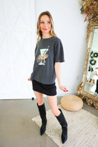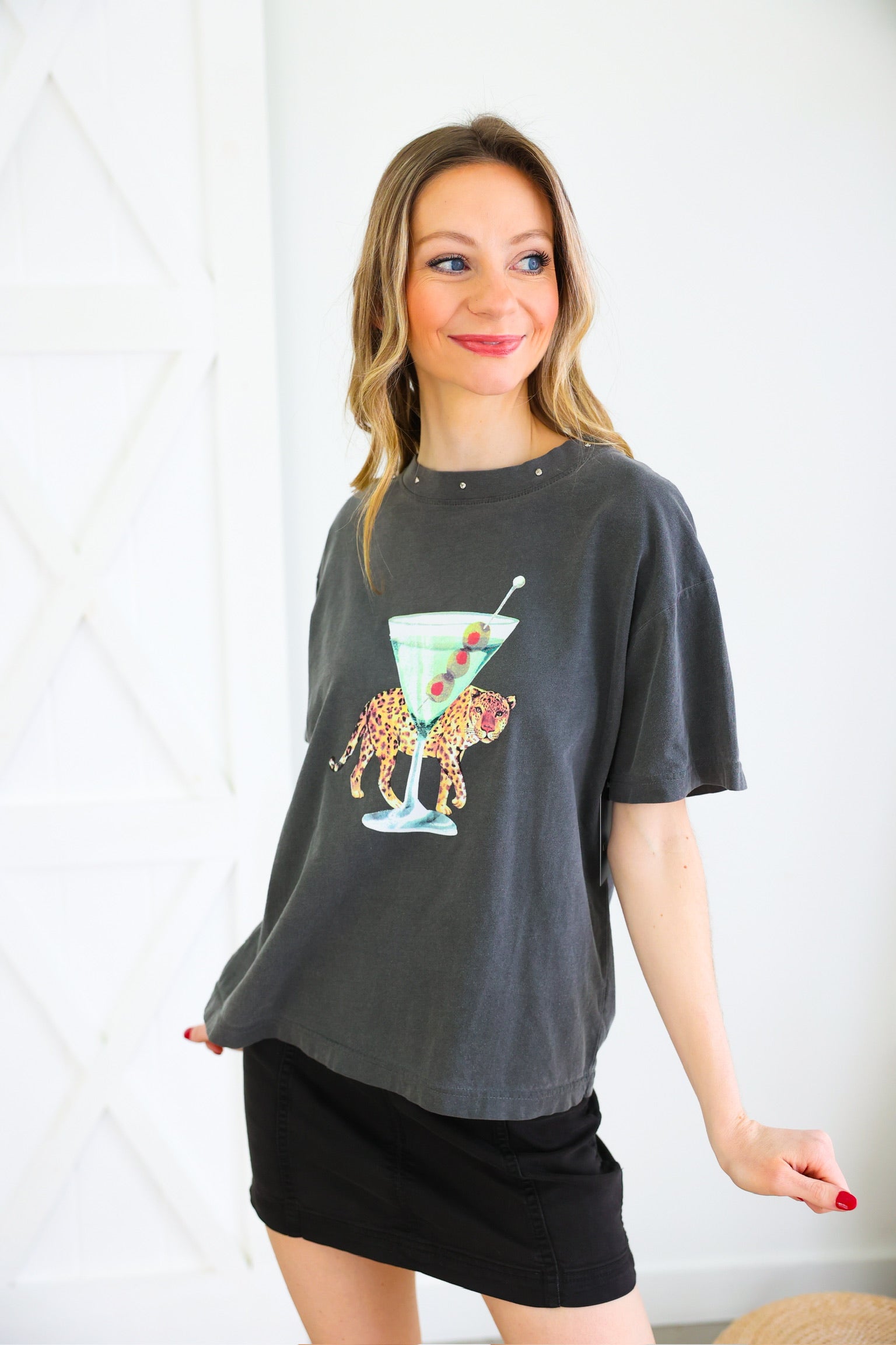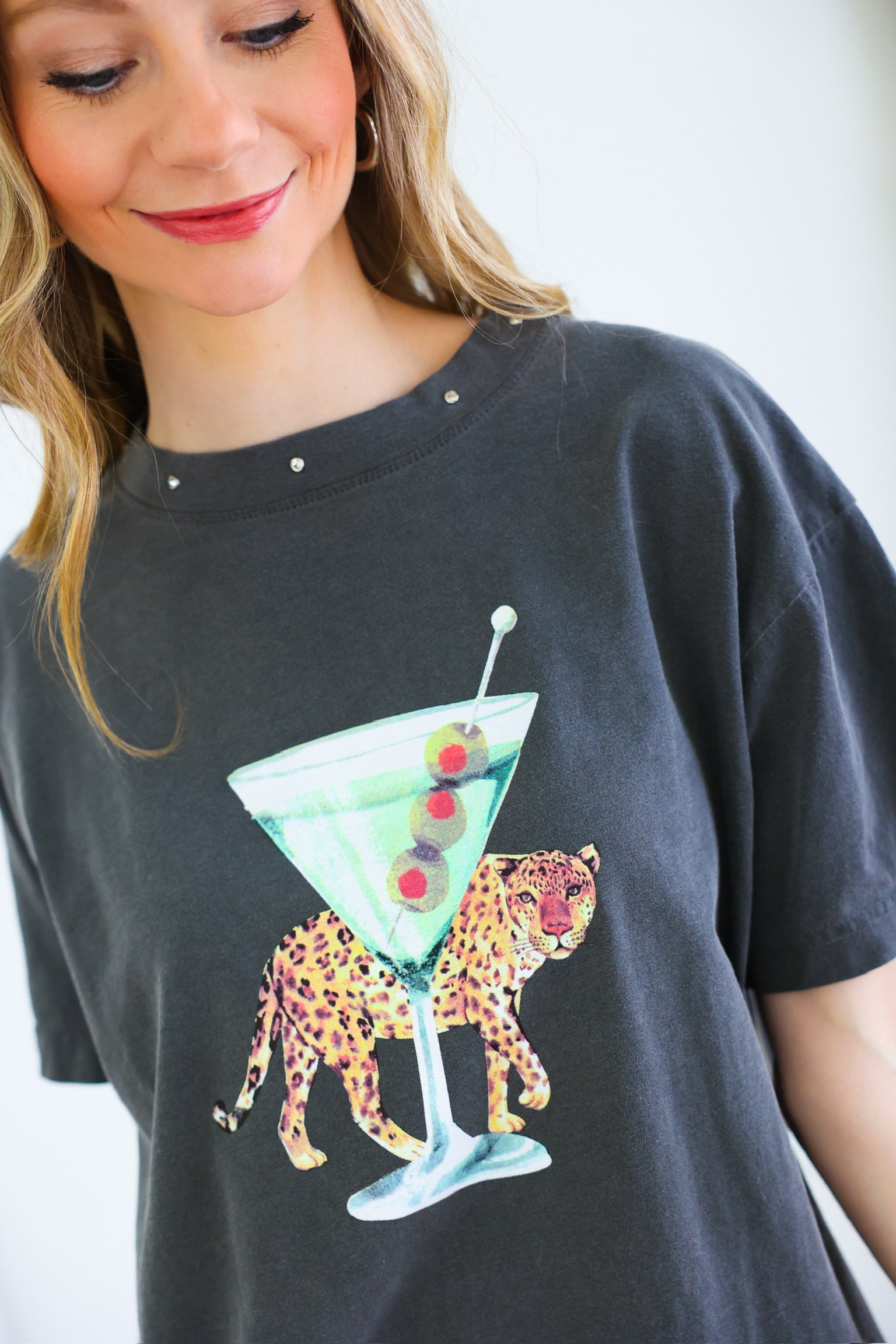 Unleash your wild side with the Leopard Martini Big Boy Tee. This charcoal grey tee features a fierce leopard and stylish martini glass, making you queen of the jungle. Whether you're out shopping with friends or dressing up for happy hour, this simple yet sophisticated tee is perfect for any occasion.