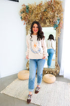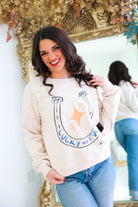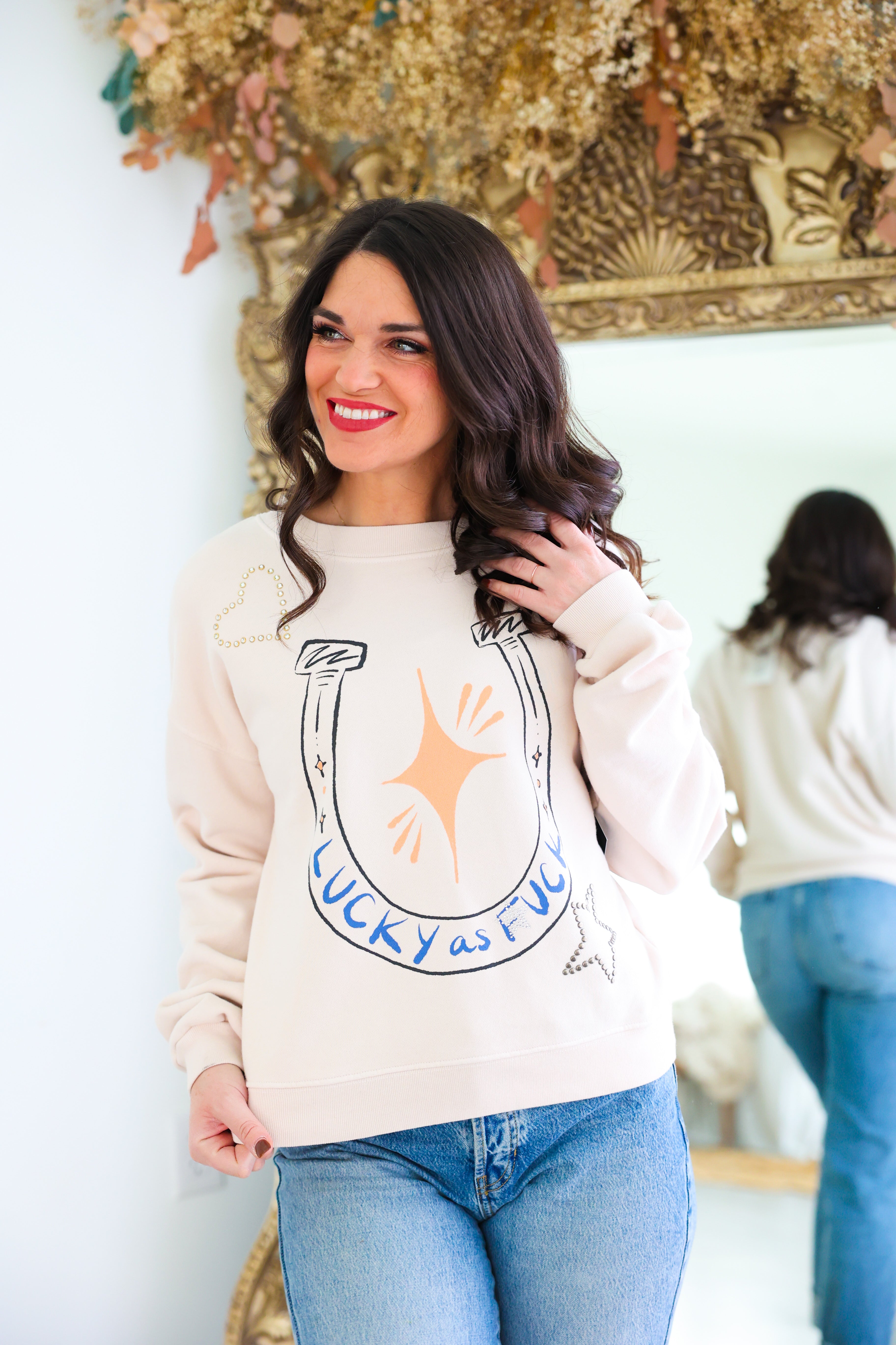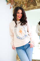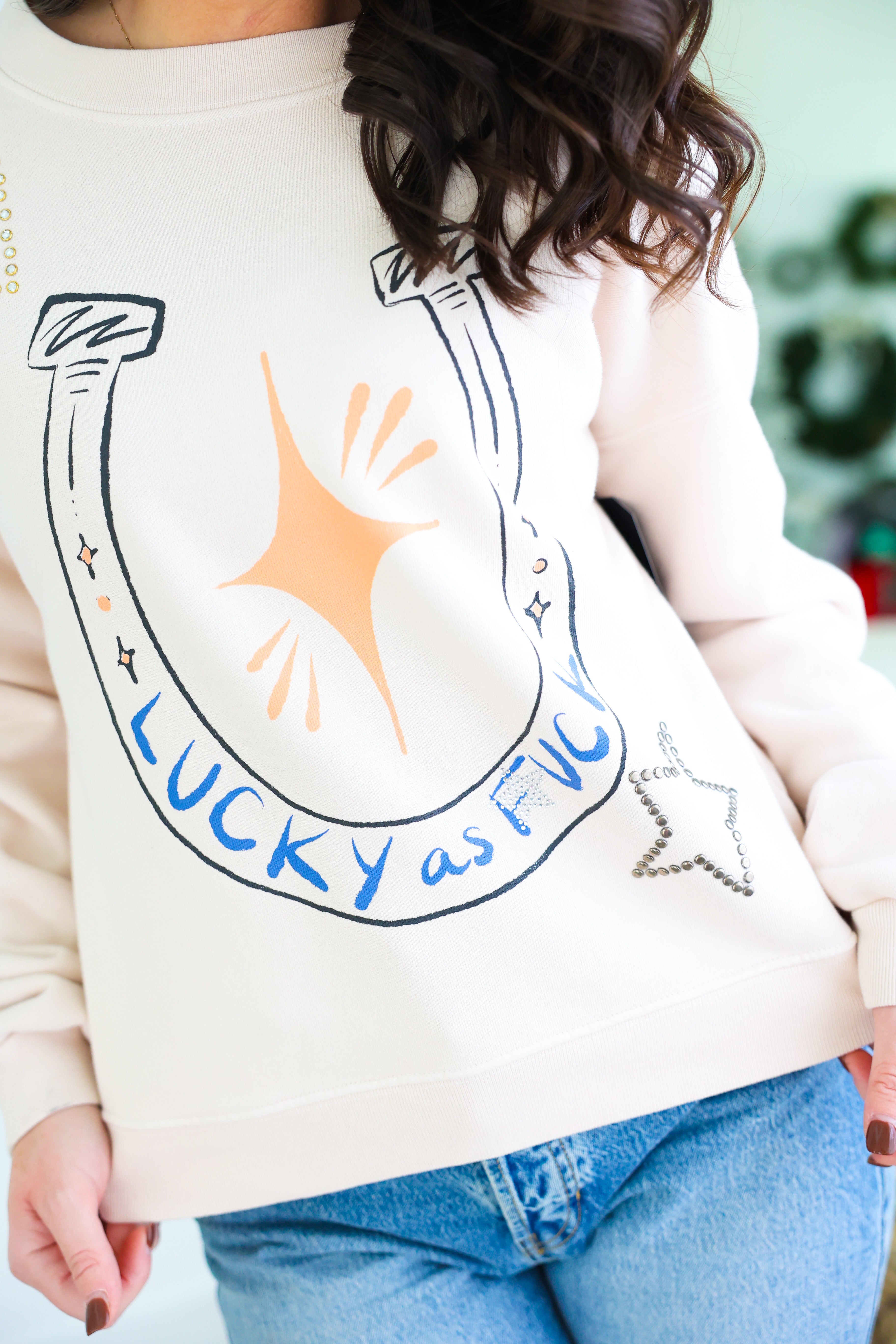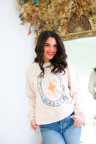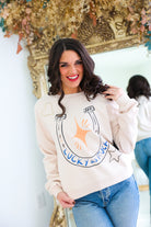 Embrace luck and style with our Lucky as F*ck Sweatshirt! A soft cream long sleeve sweatshirt features a horseshoe and star graphic for a rodeo twist. Perfect for lounging or dressing up at the stockyards. Be the lucky one in this comfy and chic sweatshirt!