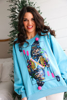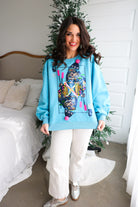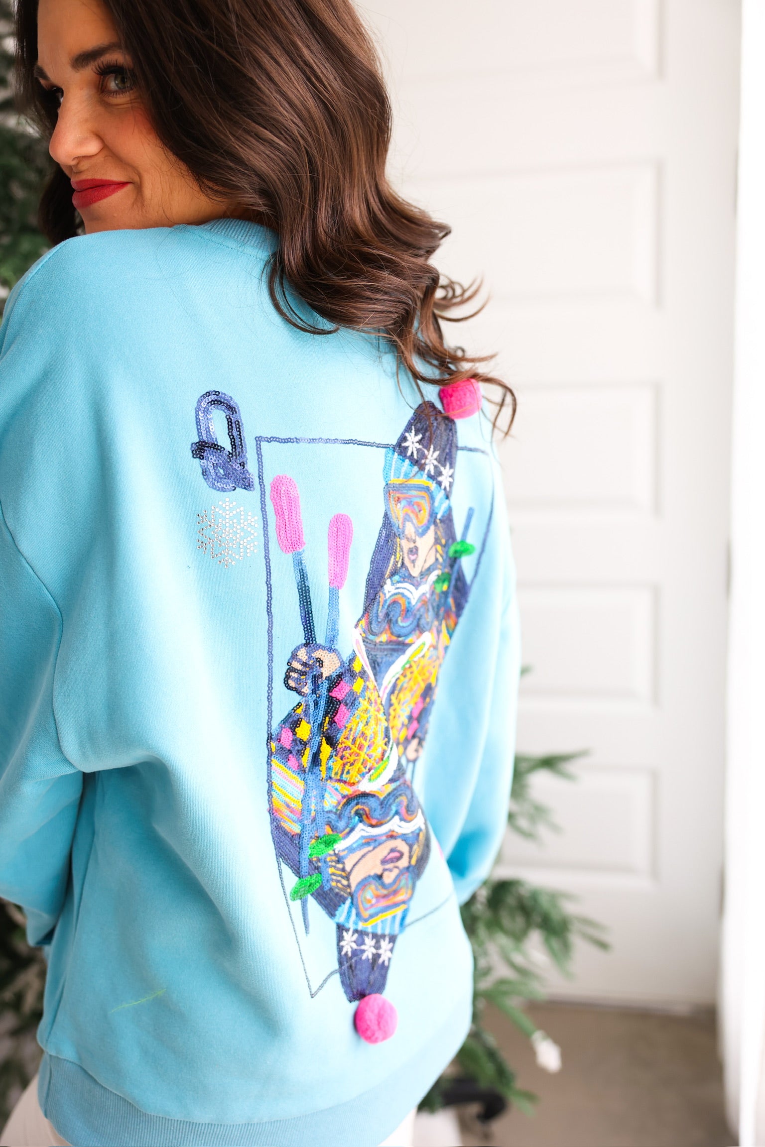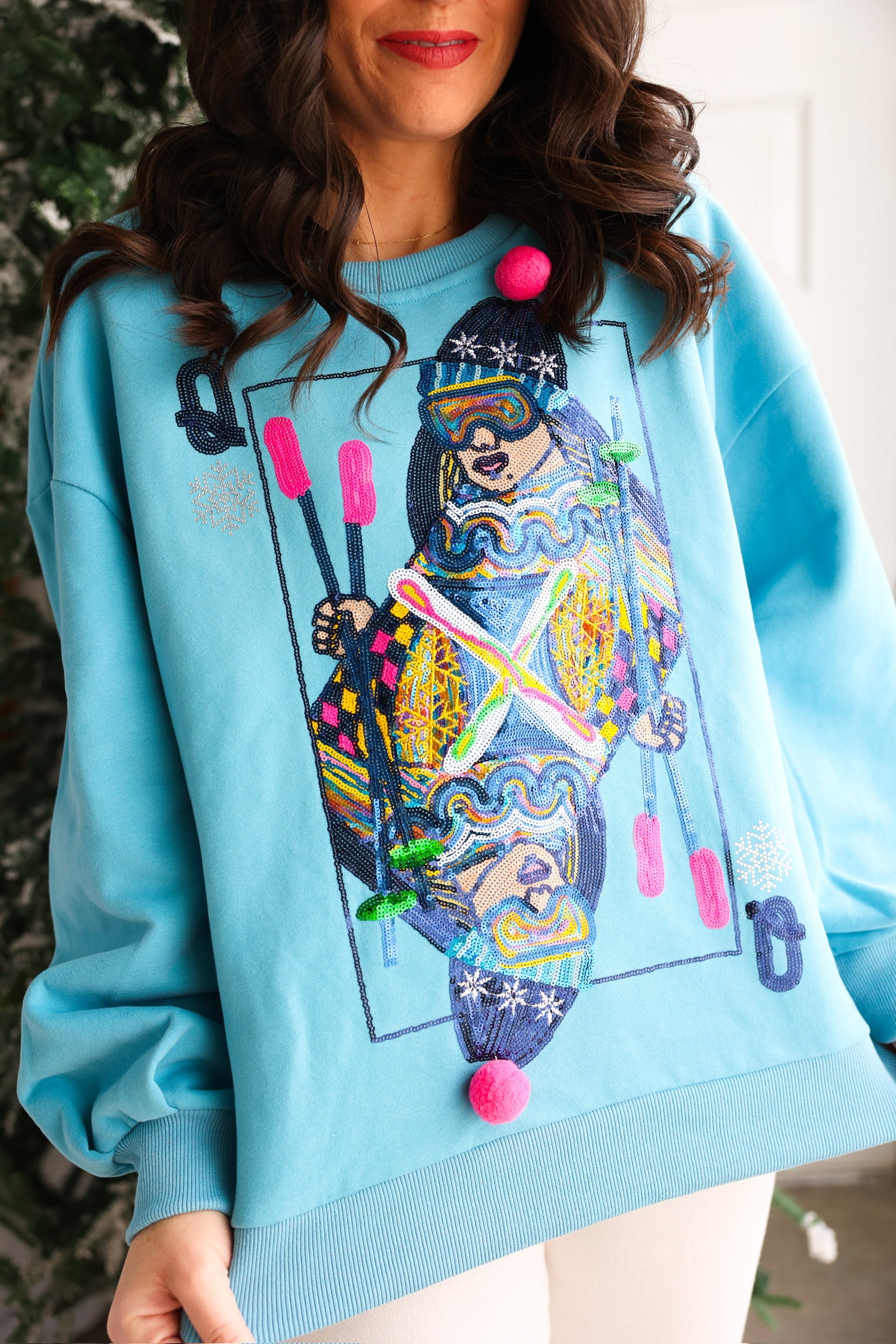 This playful sweatshirt features a bold, jeweled ski-themed Queen playing card graphic, complete with sparkly details and fun pom-poms for that signature QOS flair. The vibrant aqua color brightens up any cold-weather look, making it a must-have winter graphic sweatshirt for the girl who loves to stand out. ❄️💖
