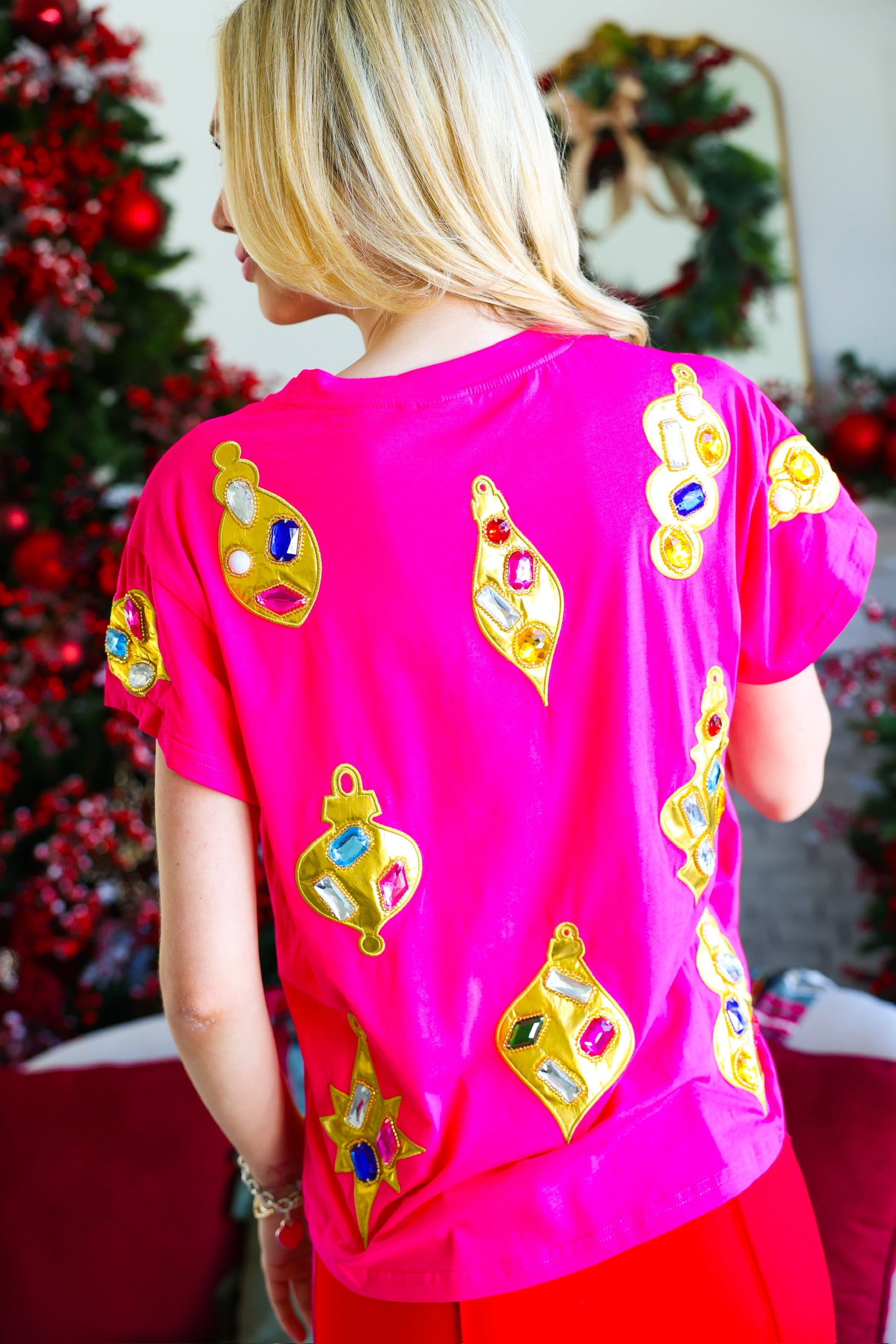 Shine bright this holiday season with the Hot Pink Multi Diamond Ornament Tee, designed for the Queen of Sparkles. Featuring a dazzling diamond ornament pattern on a vibrant hot pink background, this tee combines festive fun with everyday comfort. Perfect for layering or wearing solo, it adds a bold splash of sparkle to your seasonal wardrobe!