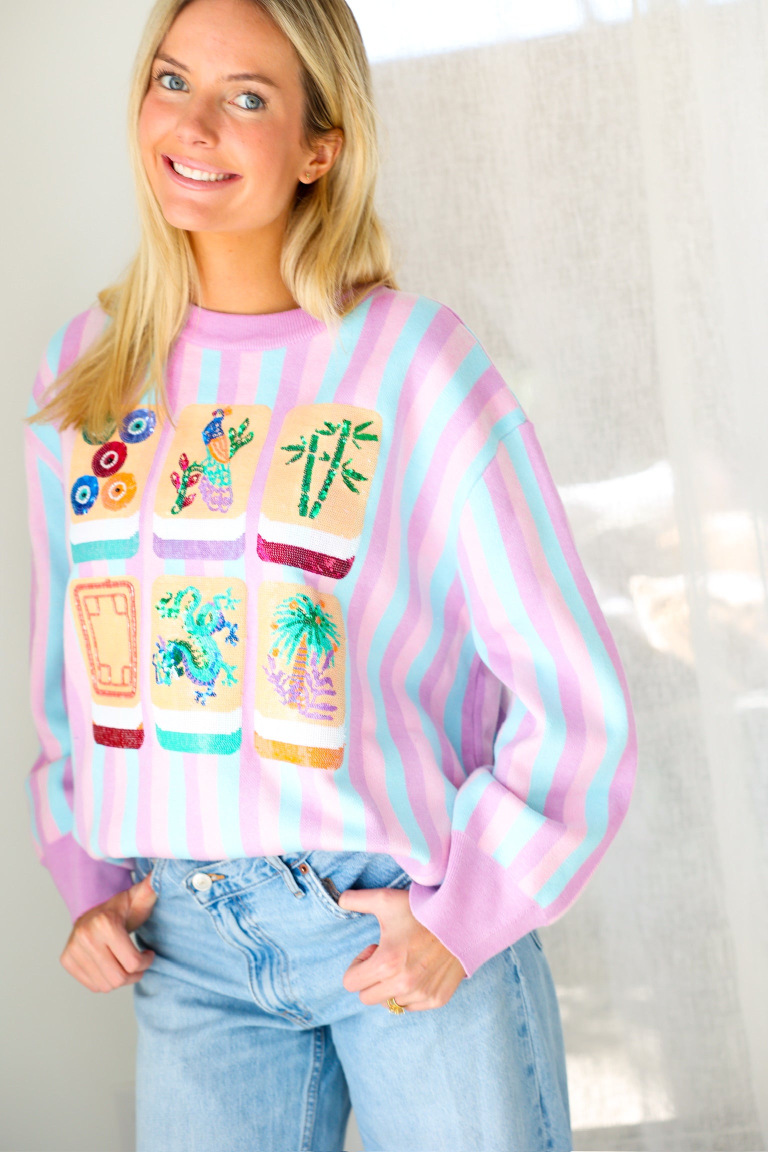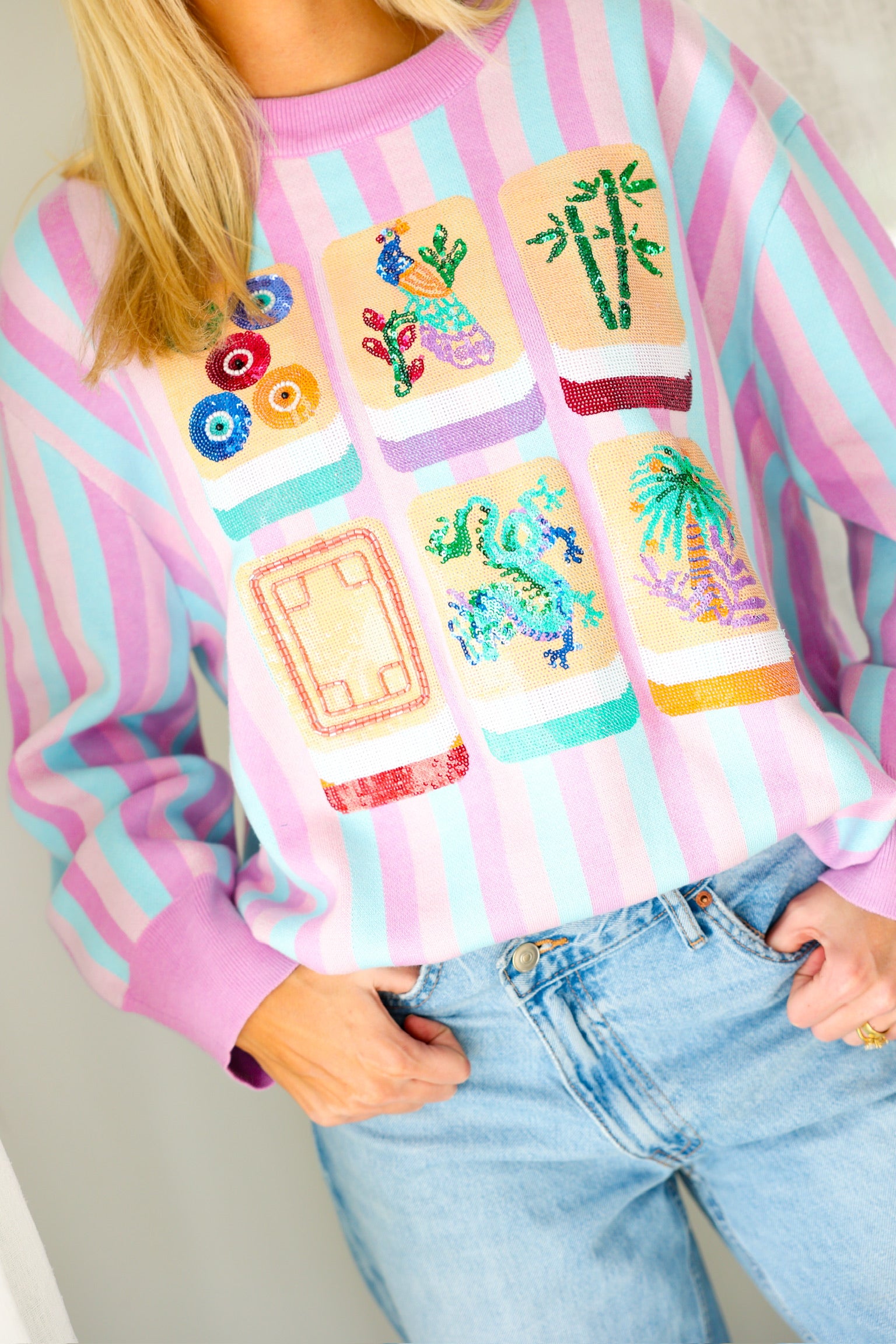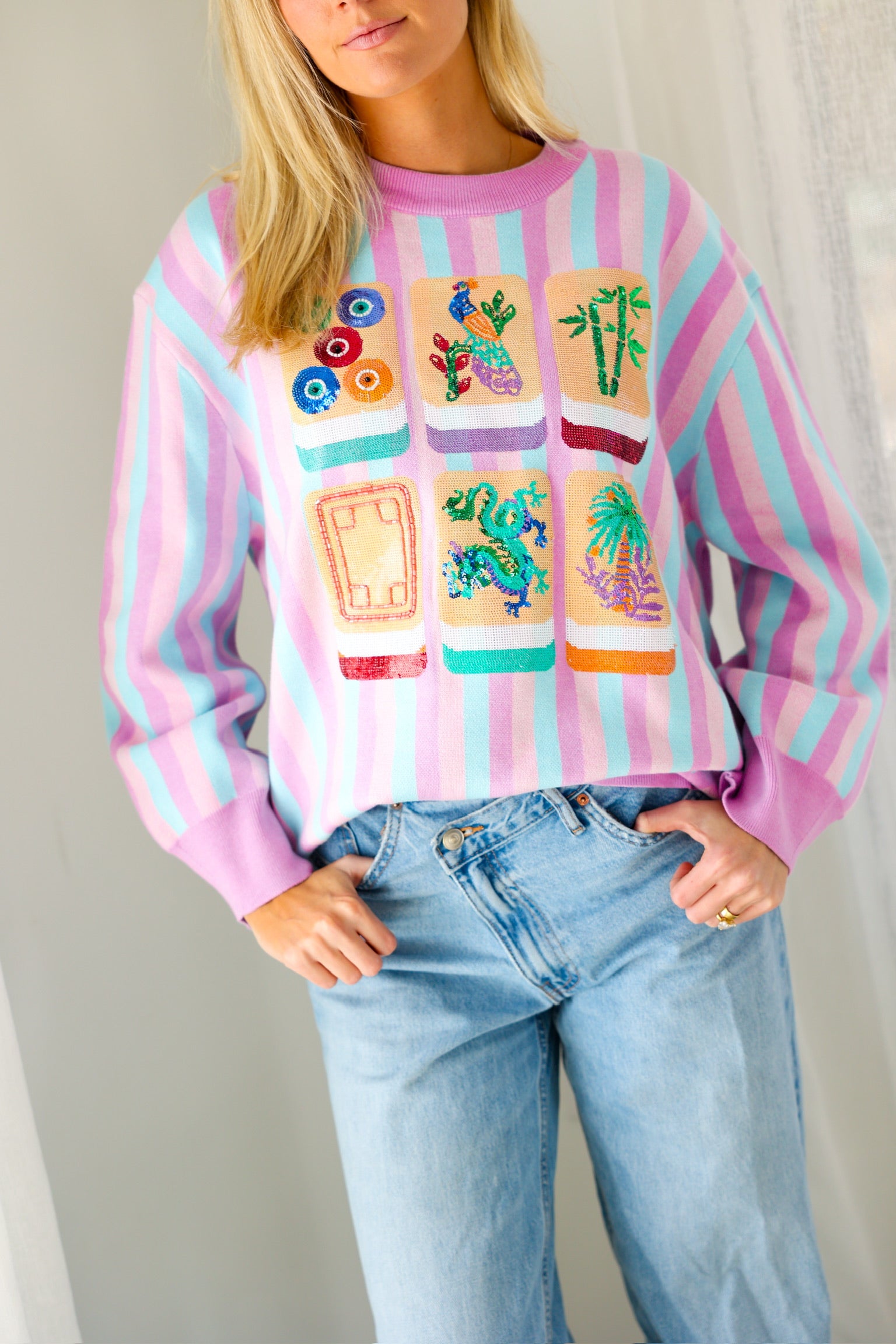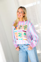 Fun, colorful, and SO iconic, the Queen of Sparkles Lavender, Blue & Pink Stripe Mahjong Tile Sweater is the ultimate statement knit for your mahjong era 💖🀄️ With dreamy pastel stripes and bold embroidered tile details, this sweater is a total showstopper—cute, cozy, and guaranteed compliments.
