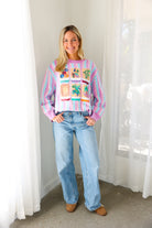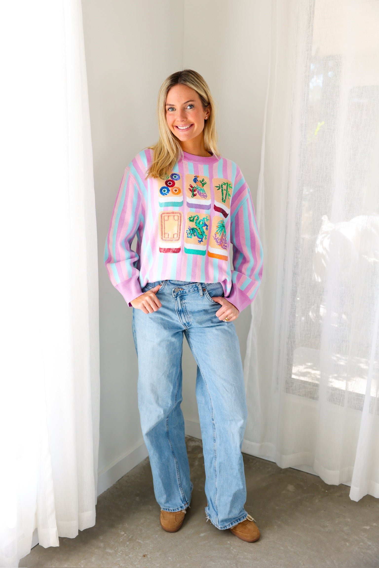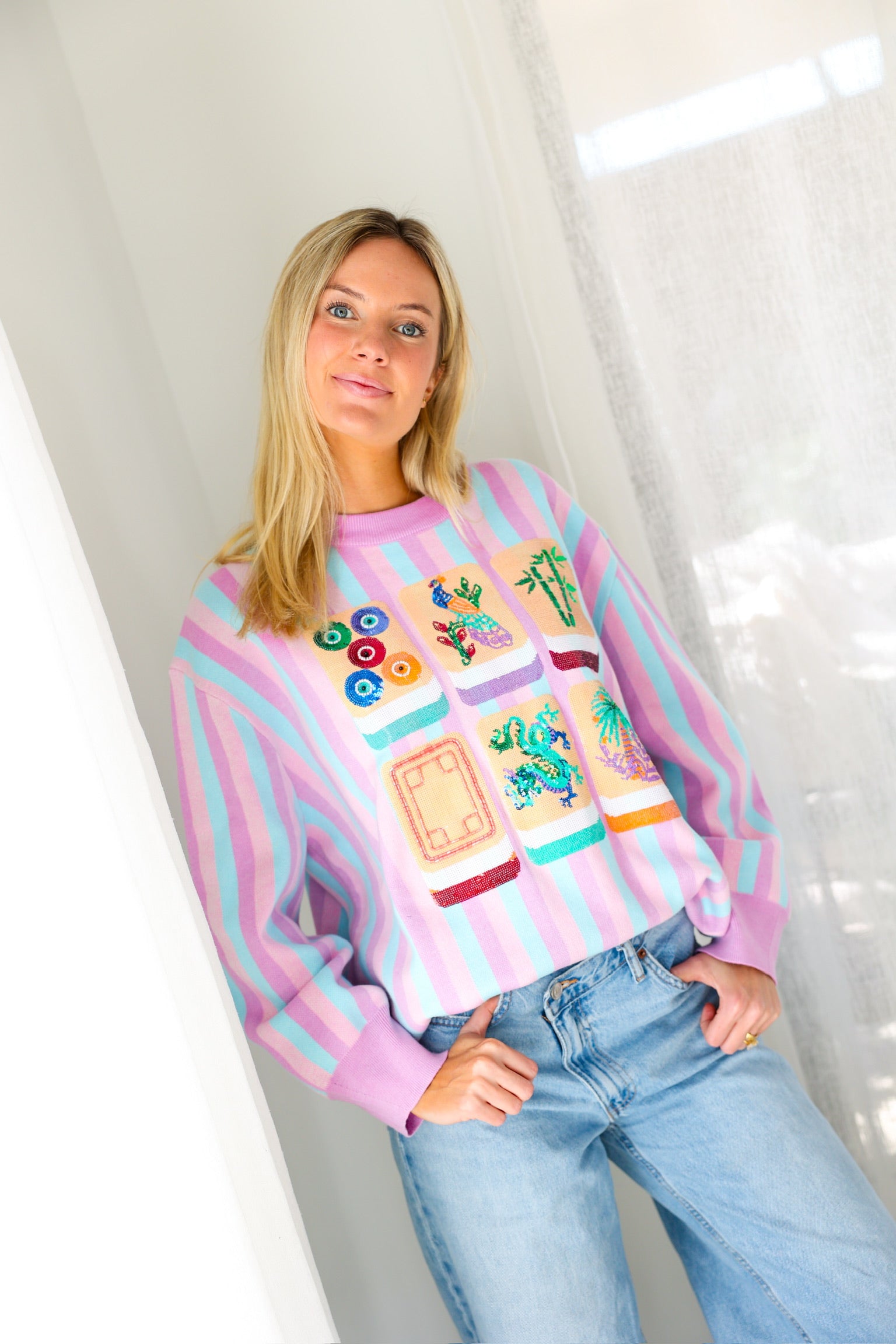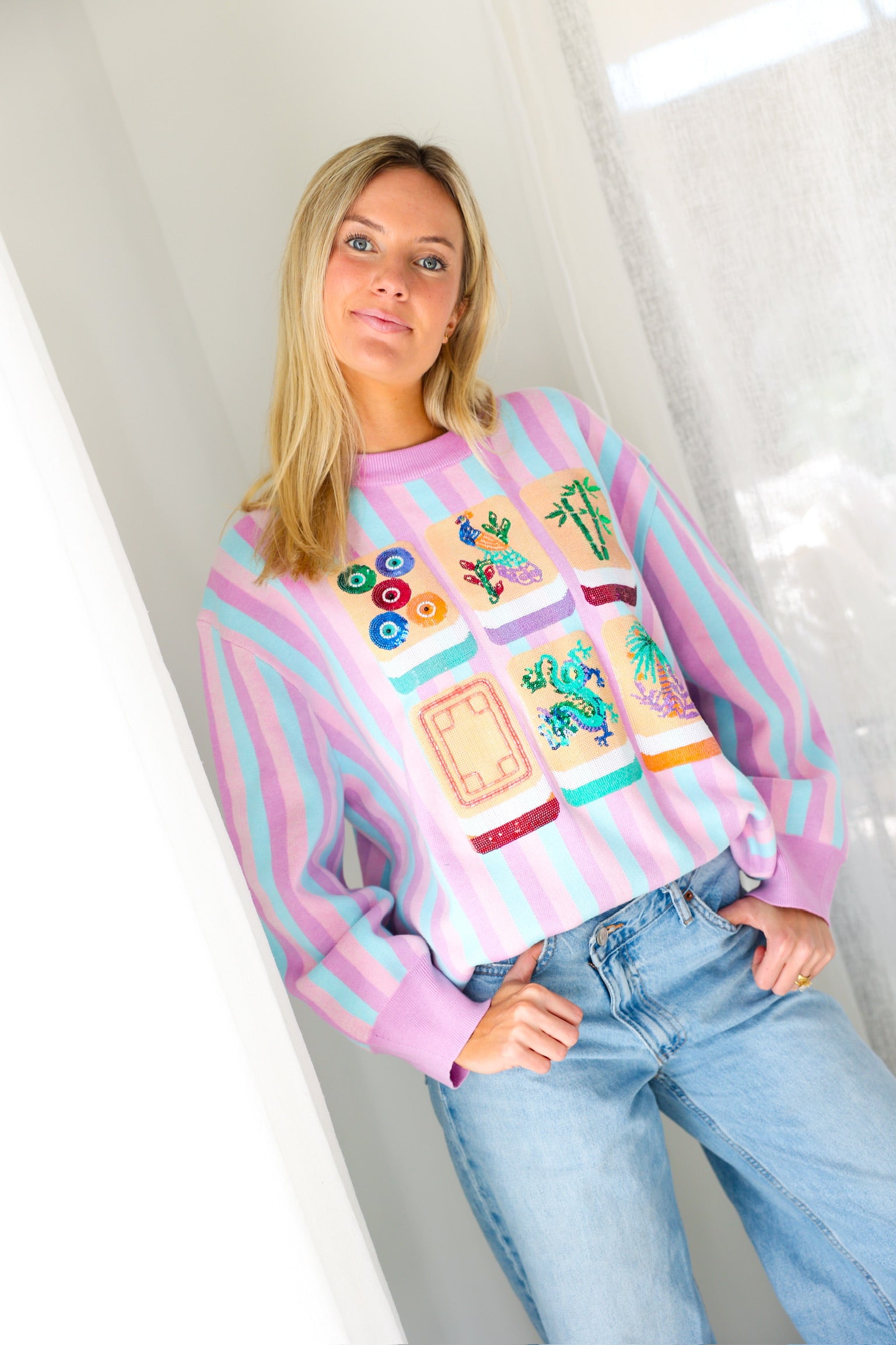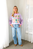 Fun, colorful, and SO iconic, the Queen of Sparkles Lavender, Blue & Pink Stripe Mahjong Tile Sweater is the ultimate statement knit for your mahjong era 💖🀄️ With dreamy pastel stripes and bold embroidered tile details, this sweater is a total showstopper—cute, cozy, and guaranteed compliments.