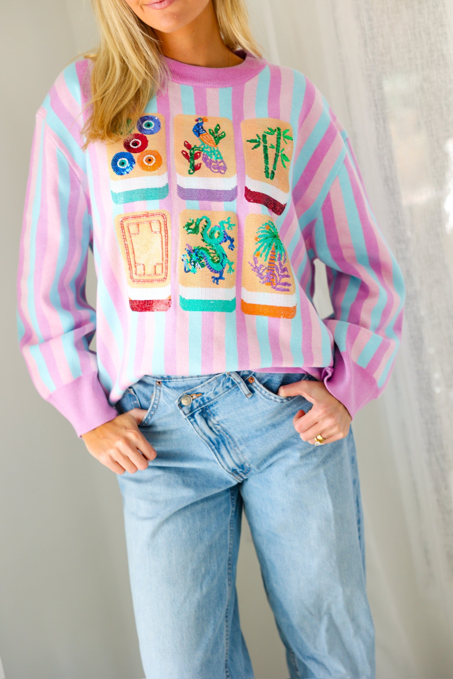 The Lavender, Blue & Pink Stripe Mahjong Tile Sweater by Queen of Sparkles is a must-have statement piece—pastel, playful, and perfect for bringing fun to your wardrobe all season long 🎀🀄️