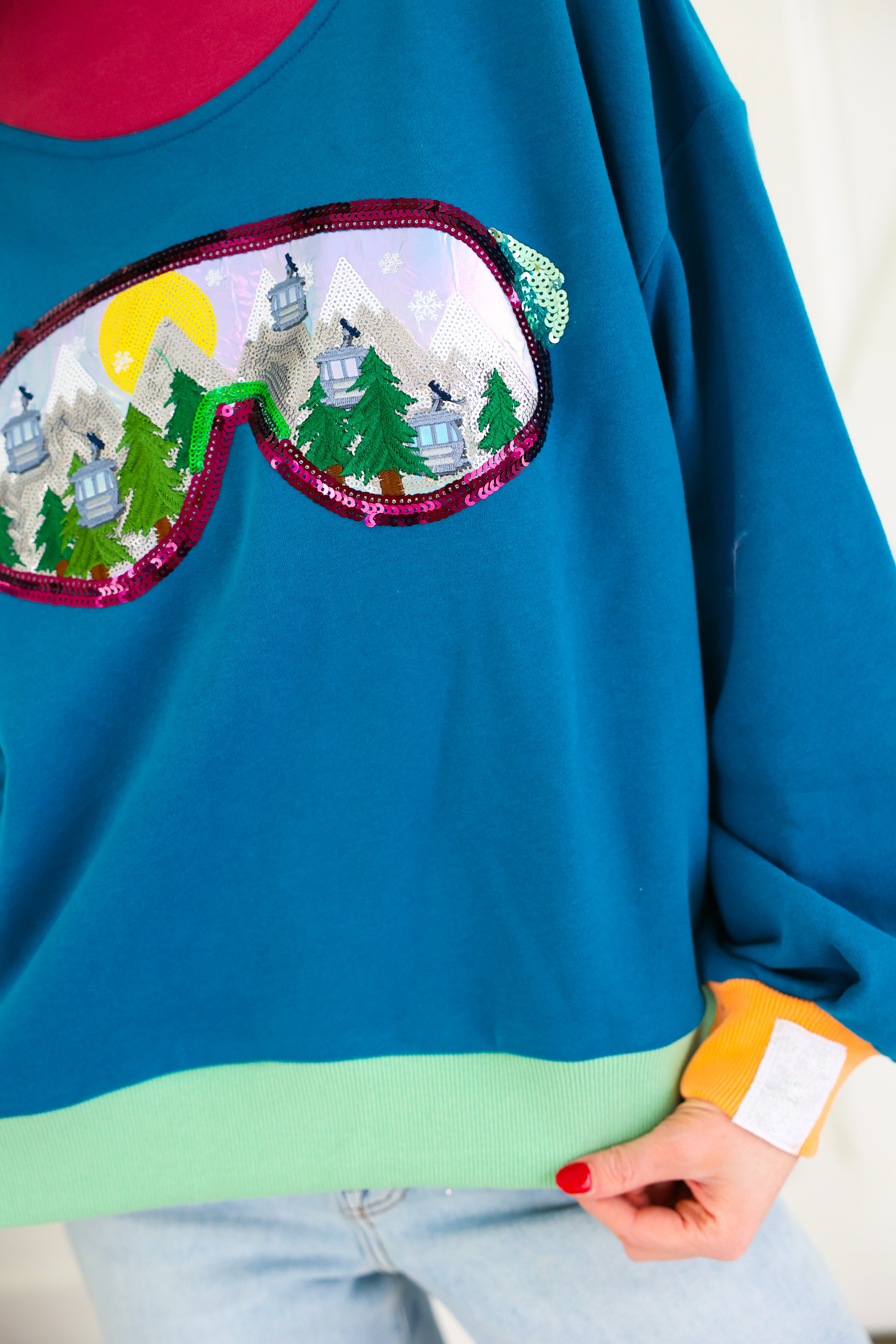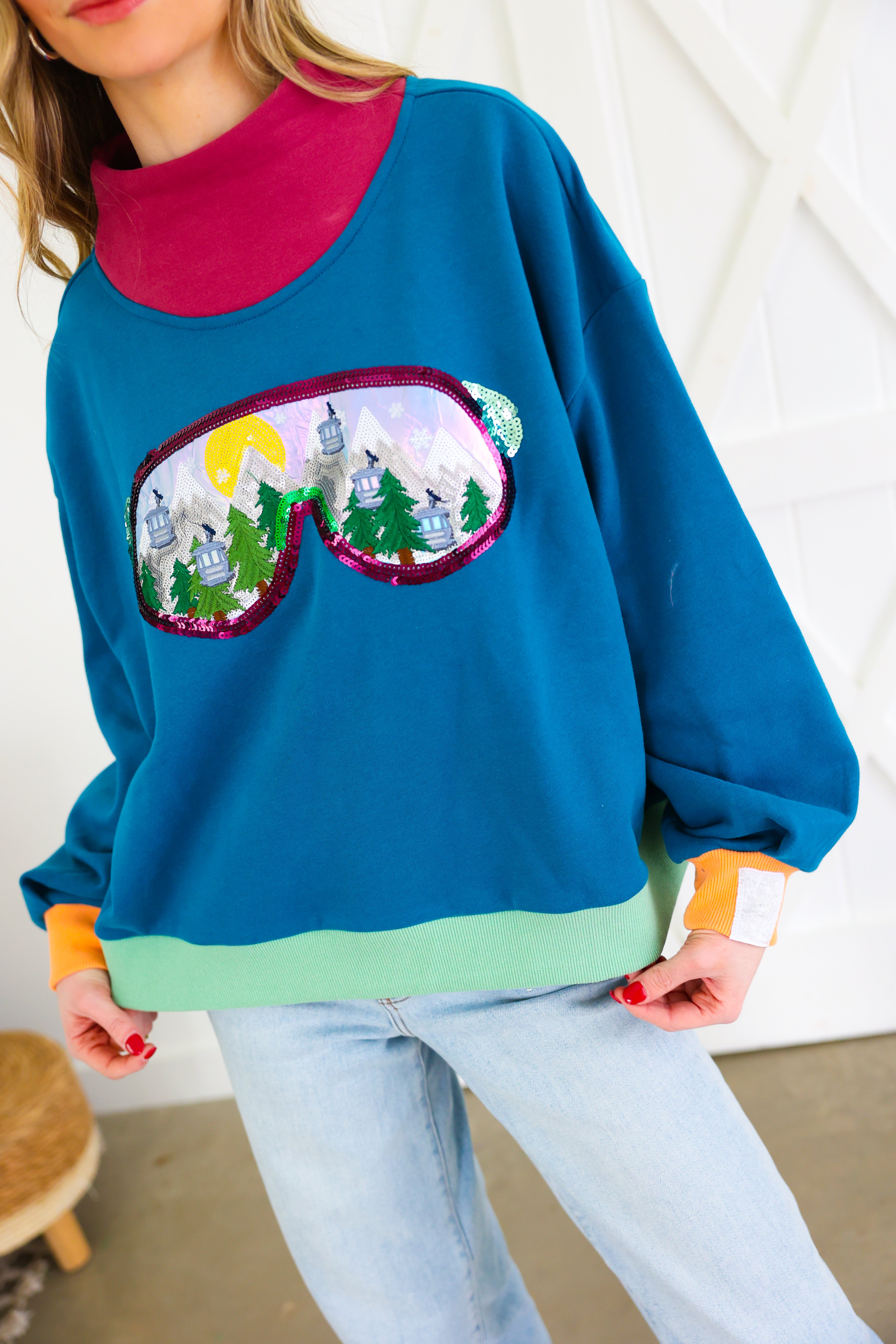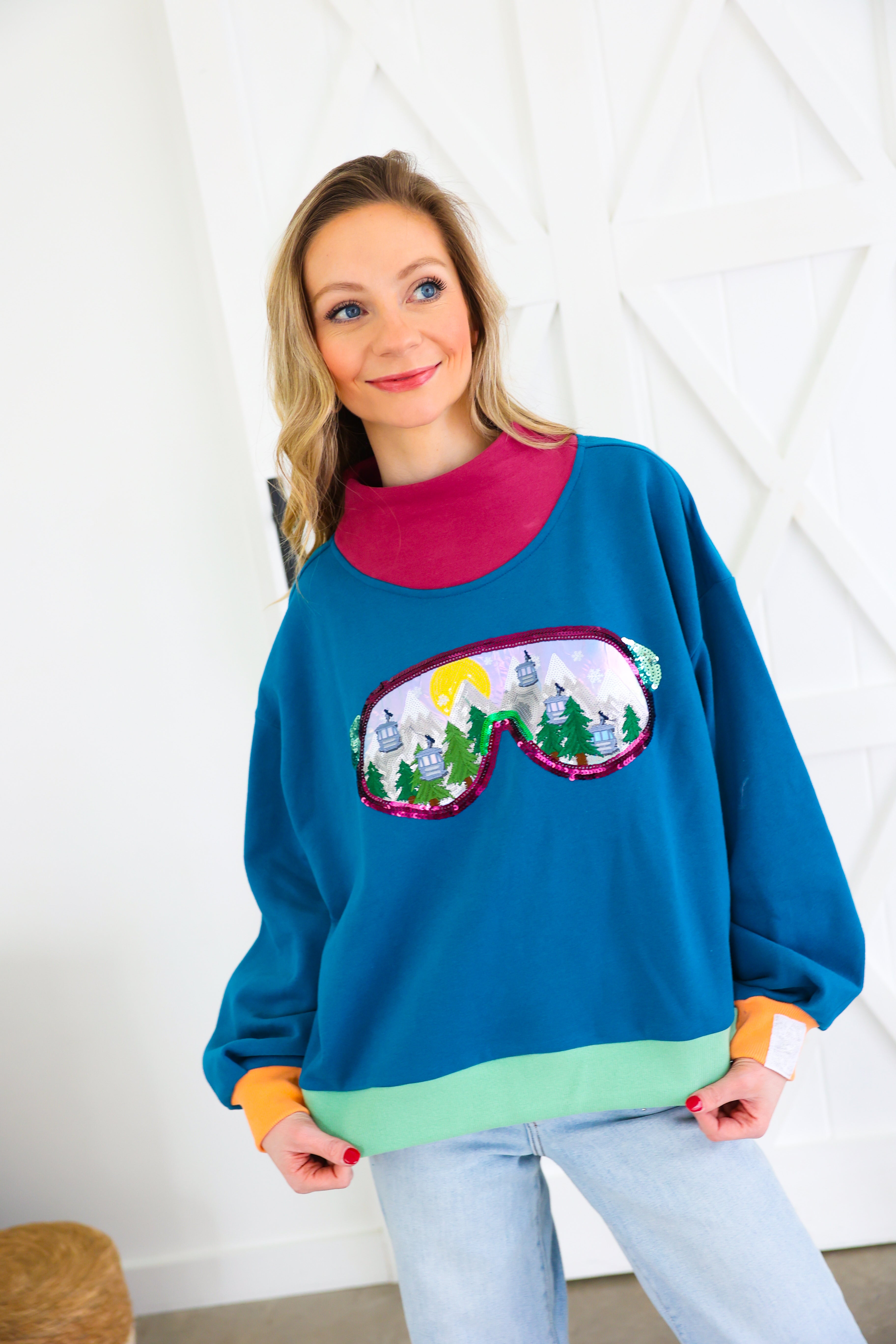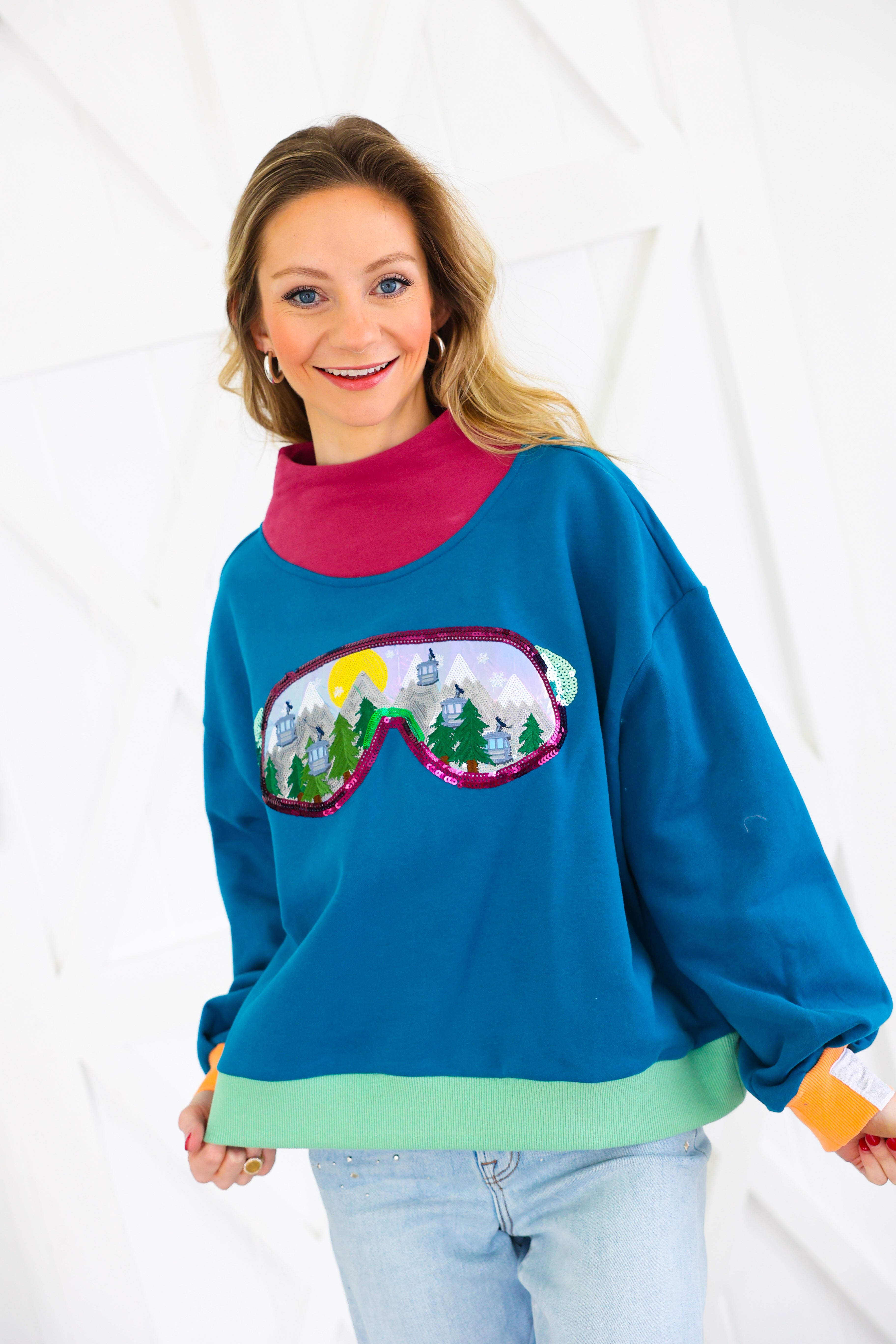 Colorblock Ski Goggle With Reflection Mock Neck Sweatshirt Queen of Sparkles