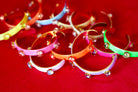 Indulge in the bold and stunning TOVA Kennedy Cuff in Purple! Handcrafted in Canada, this cuff features an eye-catching candy crush pink color and is accented with gold and light blue Swarovski crystals. Adjustable to fit your wrist, it's the perfect accessory to amp up any outfit. Elevate your style with TOVA!
