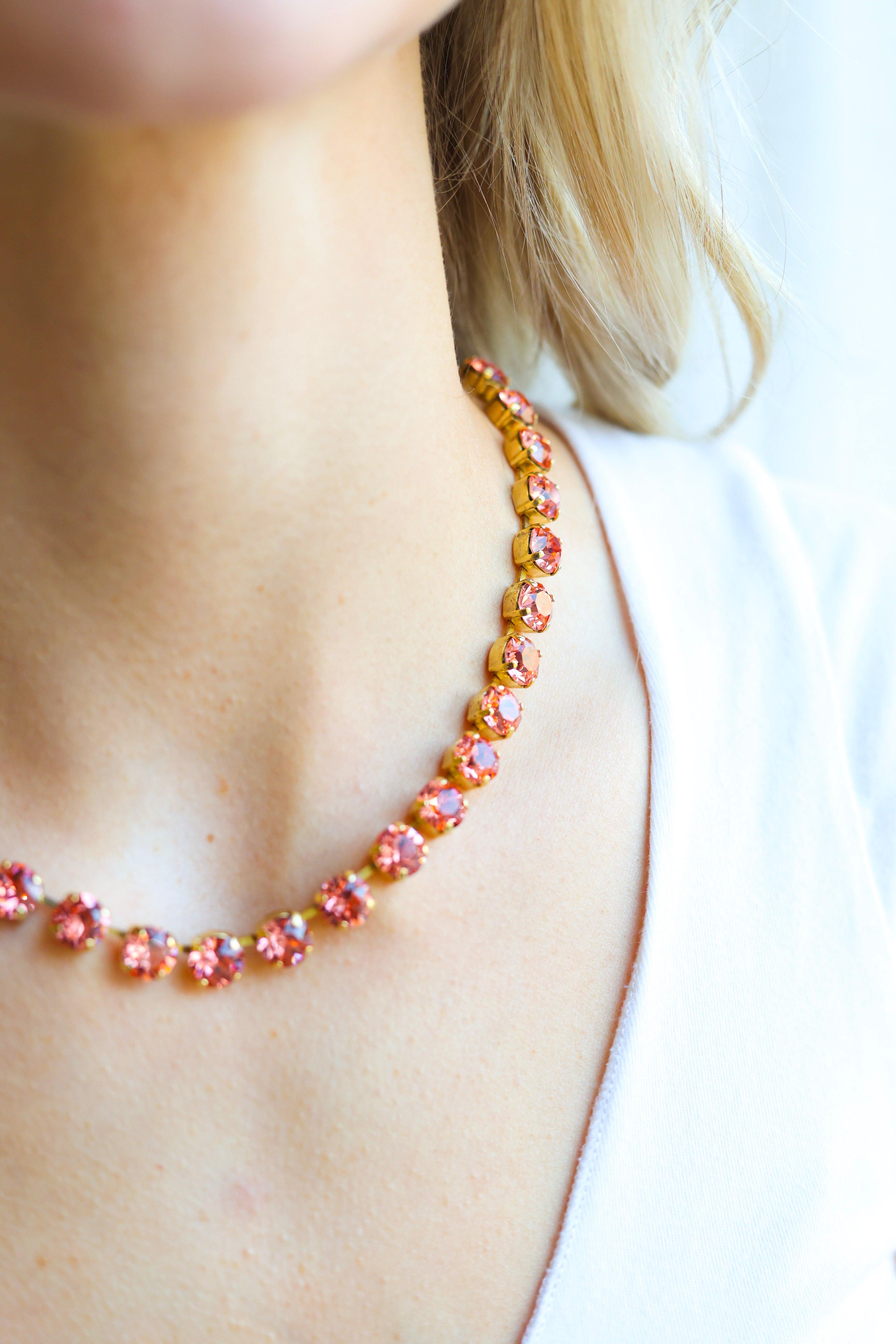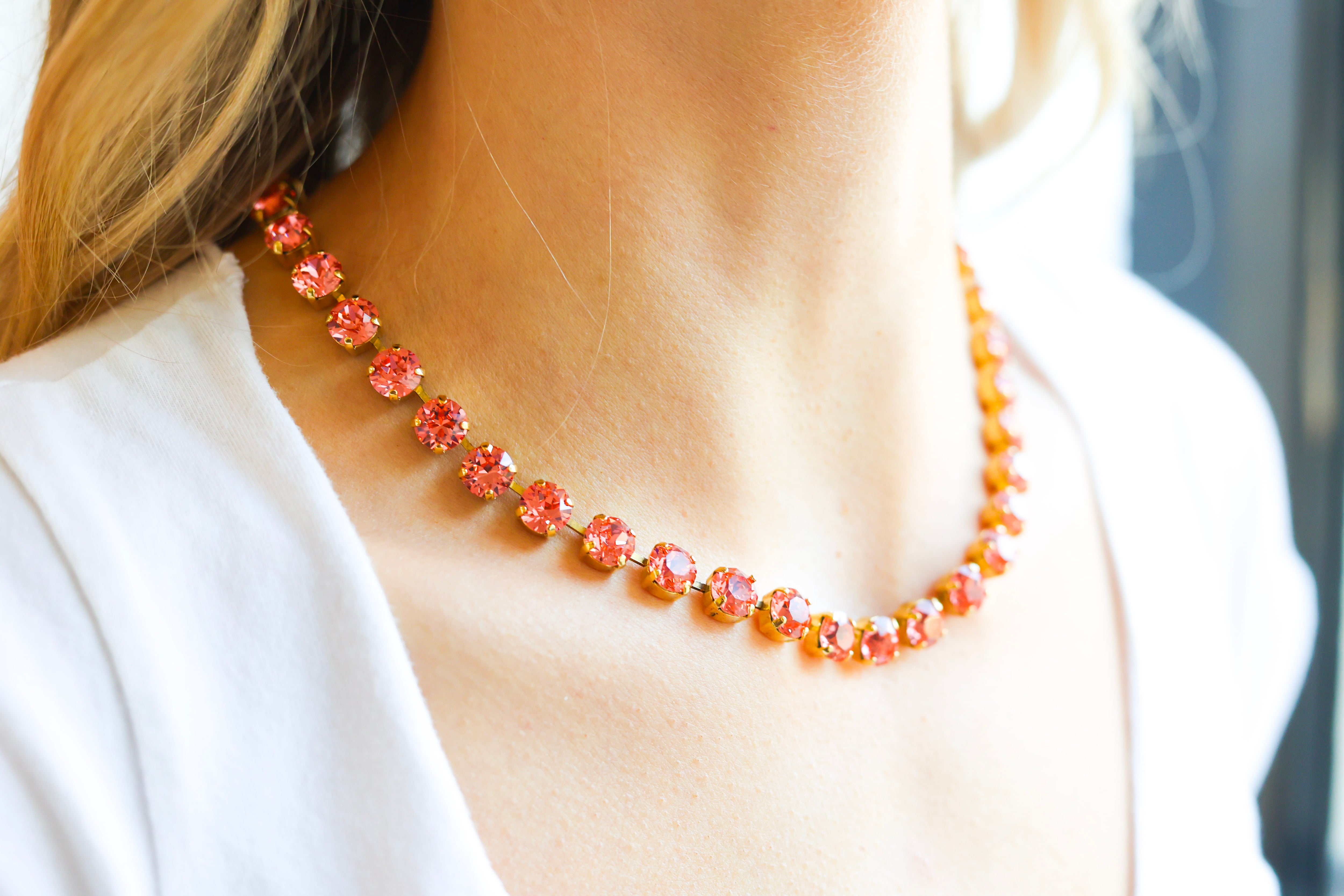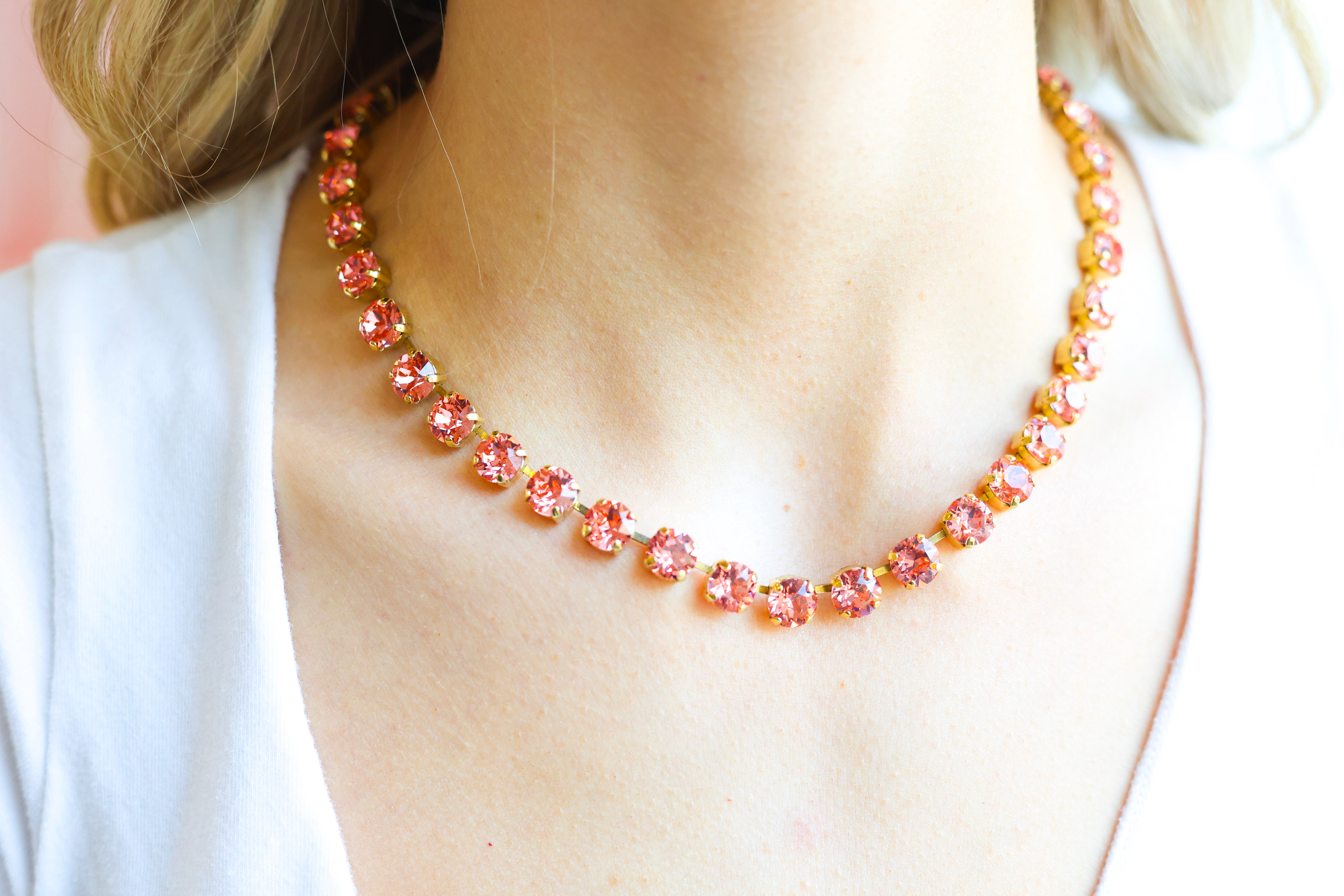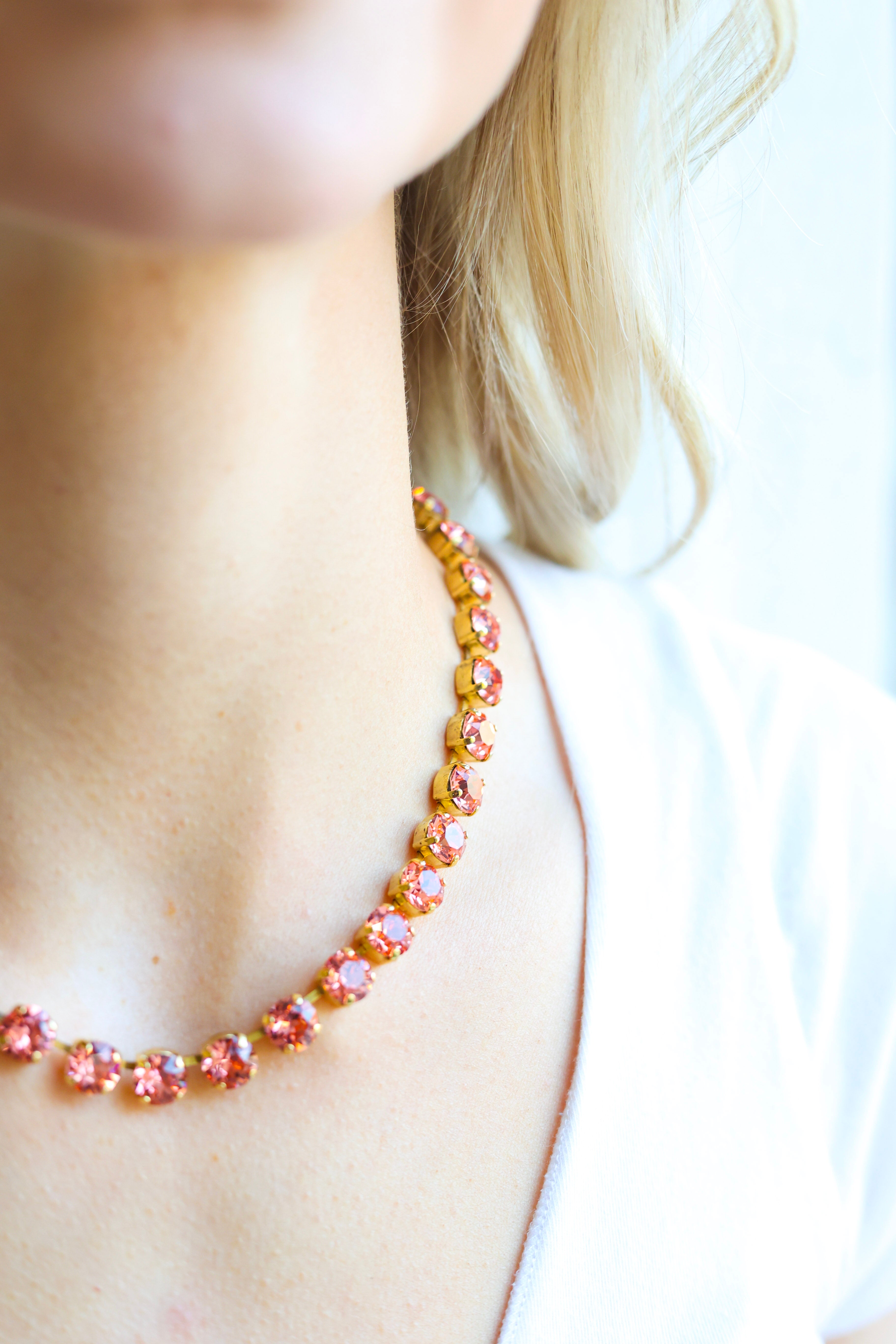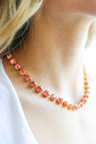 Perfect for women who love TOVA jewelry, crystal statement necklaces, feminine boutique jewelry, luxury accessories, and designer-inspired pieces, the Oakland Necklace in Rose Peach Glimmer brings warmth, elegance, and standout sparkle to your jewelry collection. The soft peach tones reflect beautifully against any skin tone for a radiant, compliment-worthy finish.