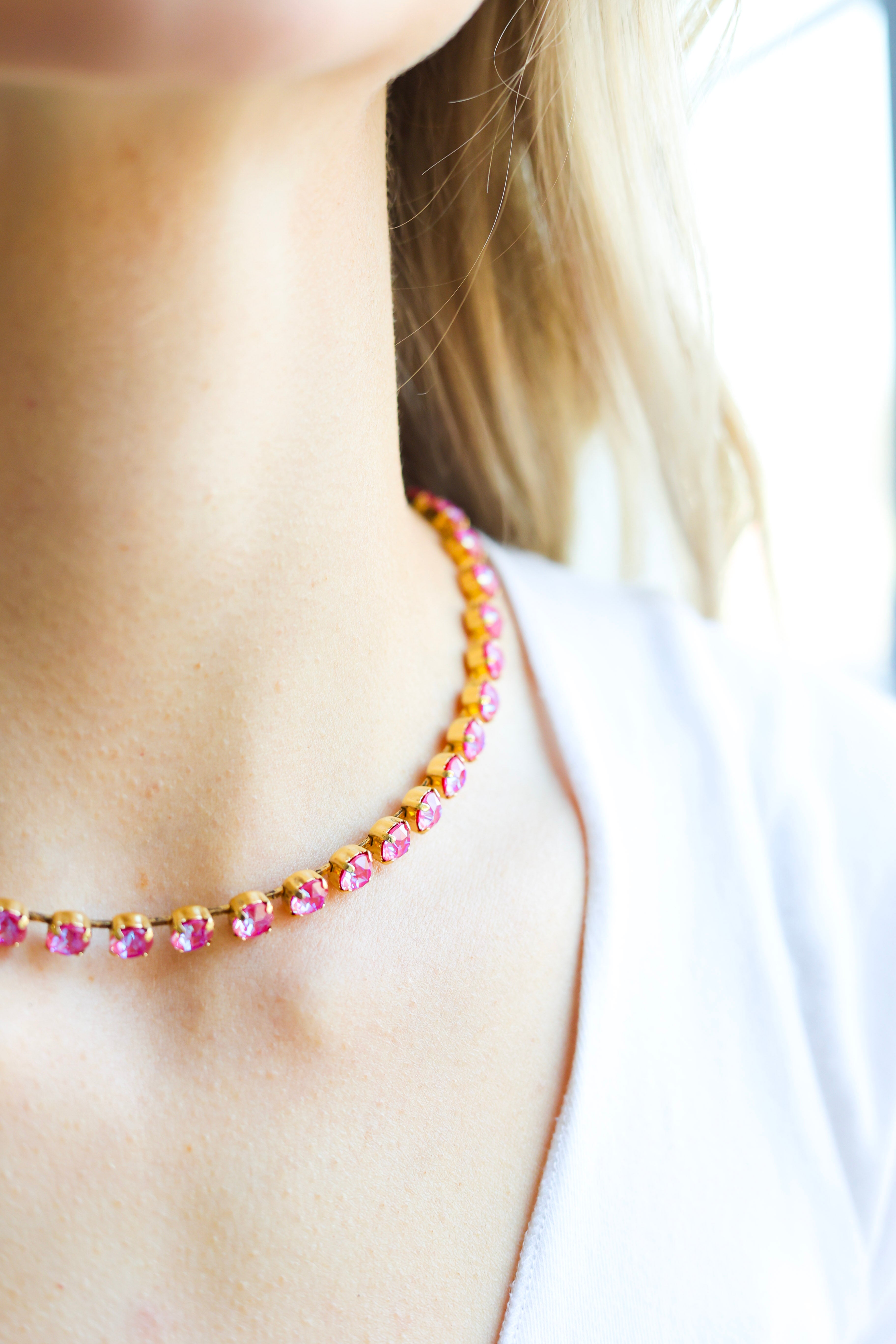 Pair this pink statement necklace with a crisp white blouse, dressy top, or blazer to let the vibrant crystals pop 🤍. It looks stunning layered with delicate gold chains or worn solo as your statement piece. Perfect with dresses, denim, holiday looks, or any outfit that needs a pop of color and sparkle. 💕✨
