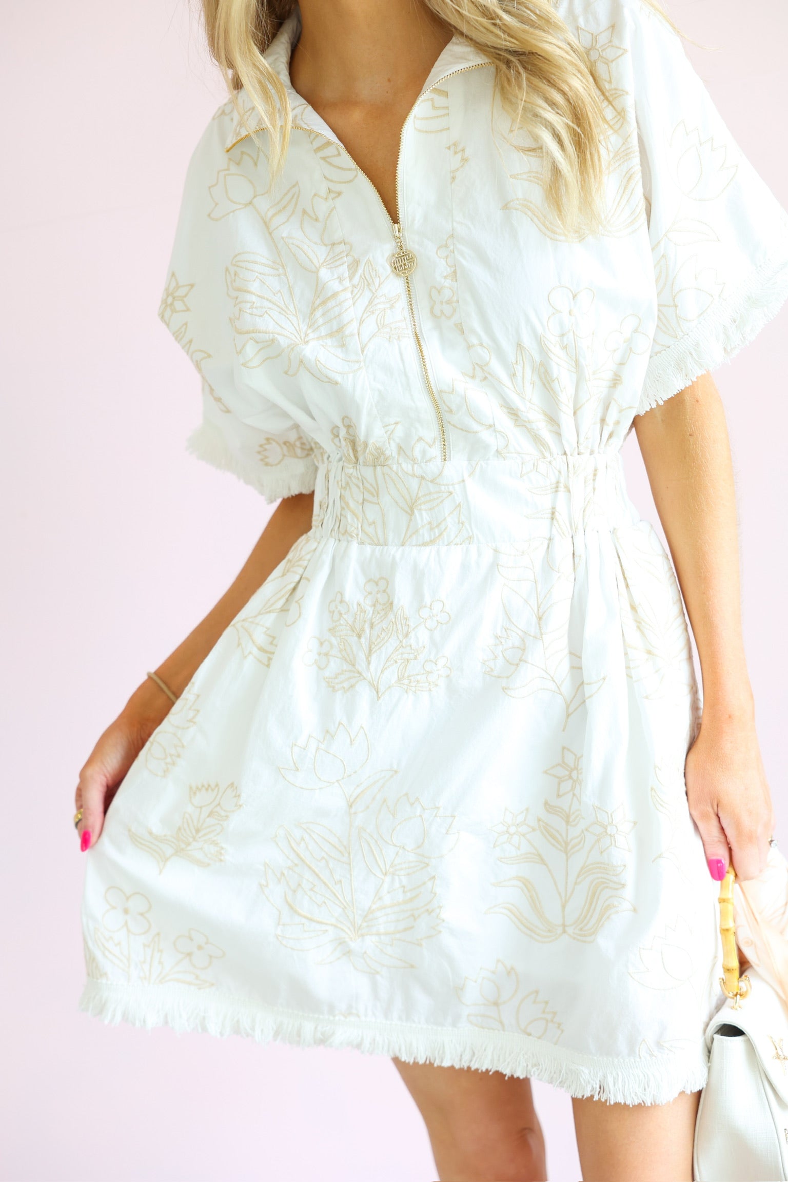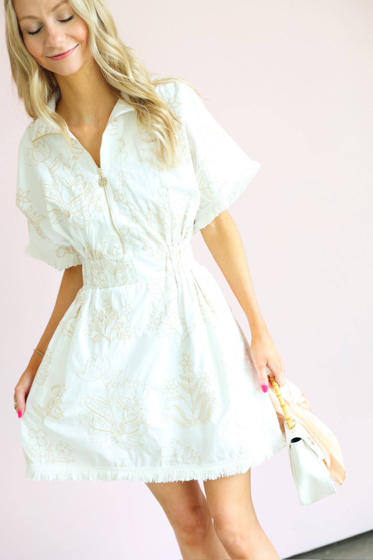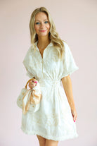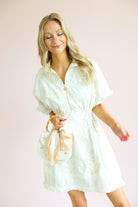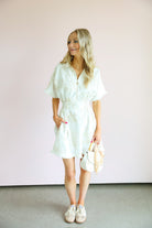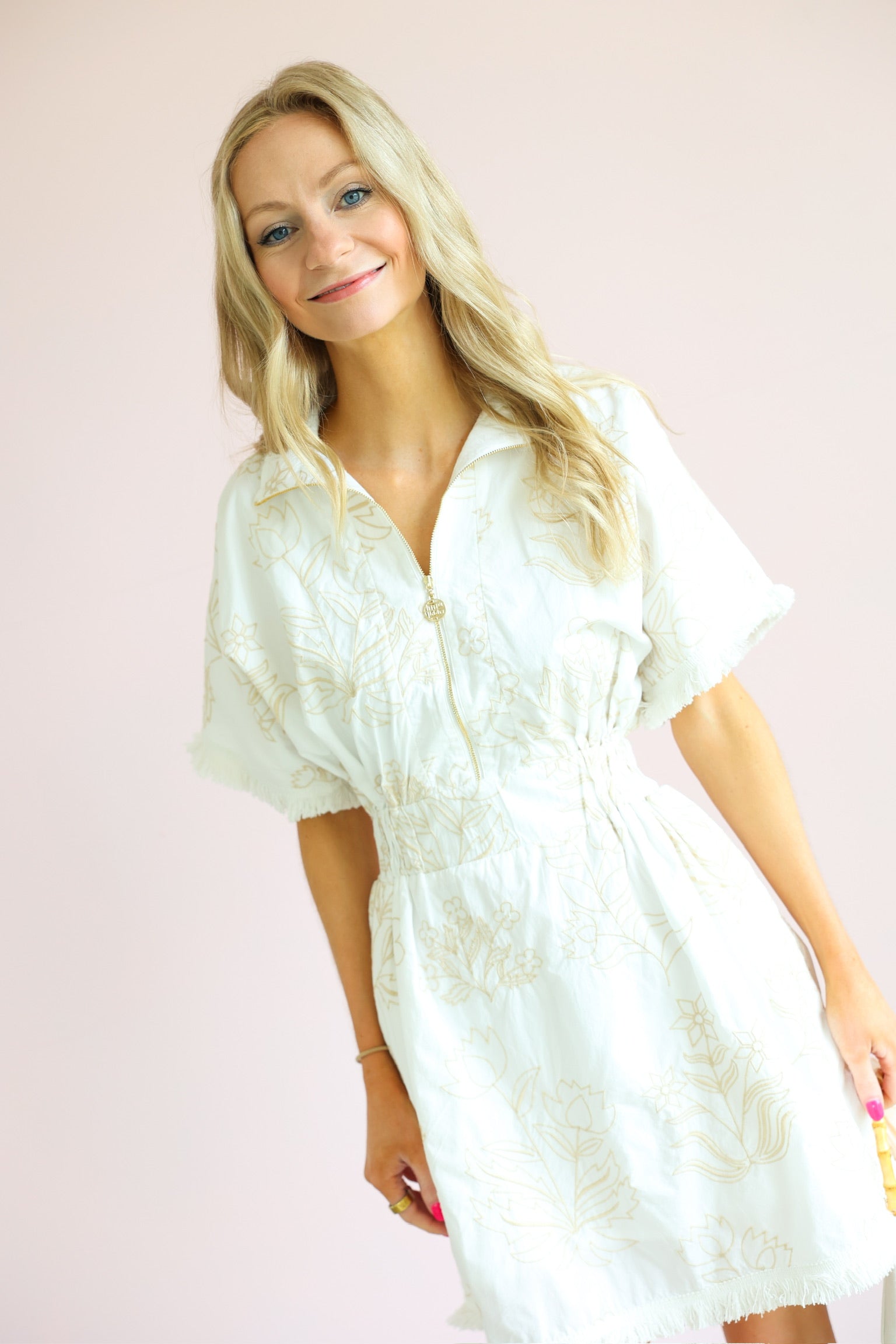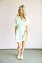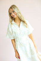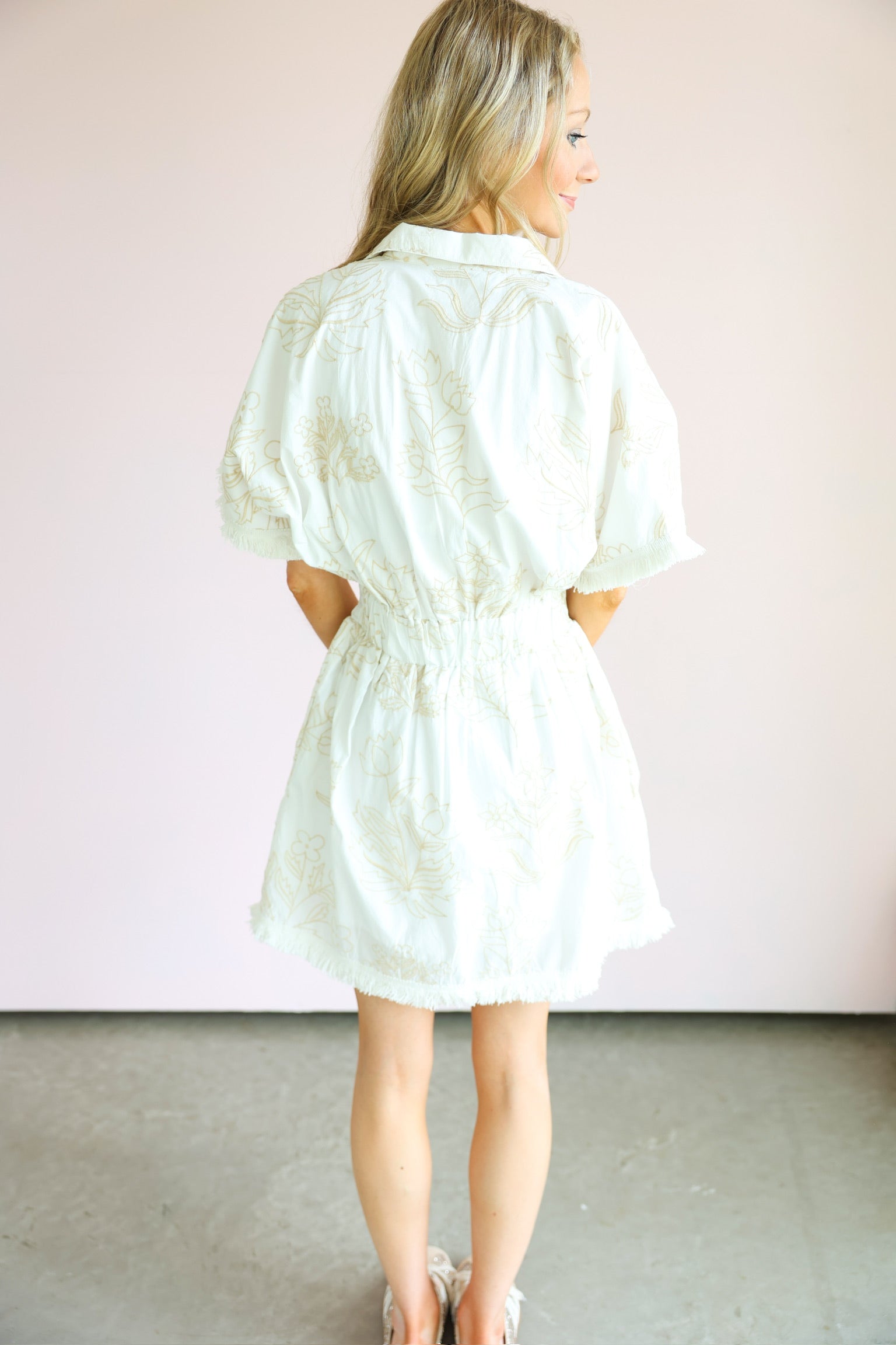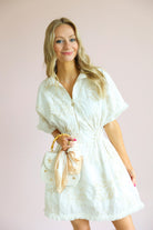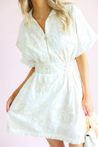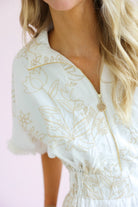 This dress is the perfect mix of effortless comfort and elevated detail. Featuring a soft blanc base with subtle petal-inspired patterns, it brings a fresh, feminine feel with a hint of texture and interest.
