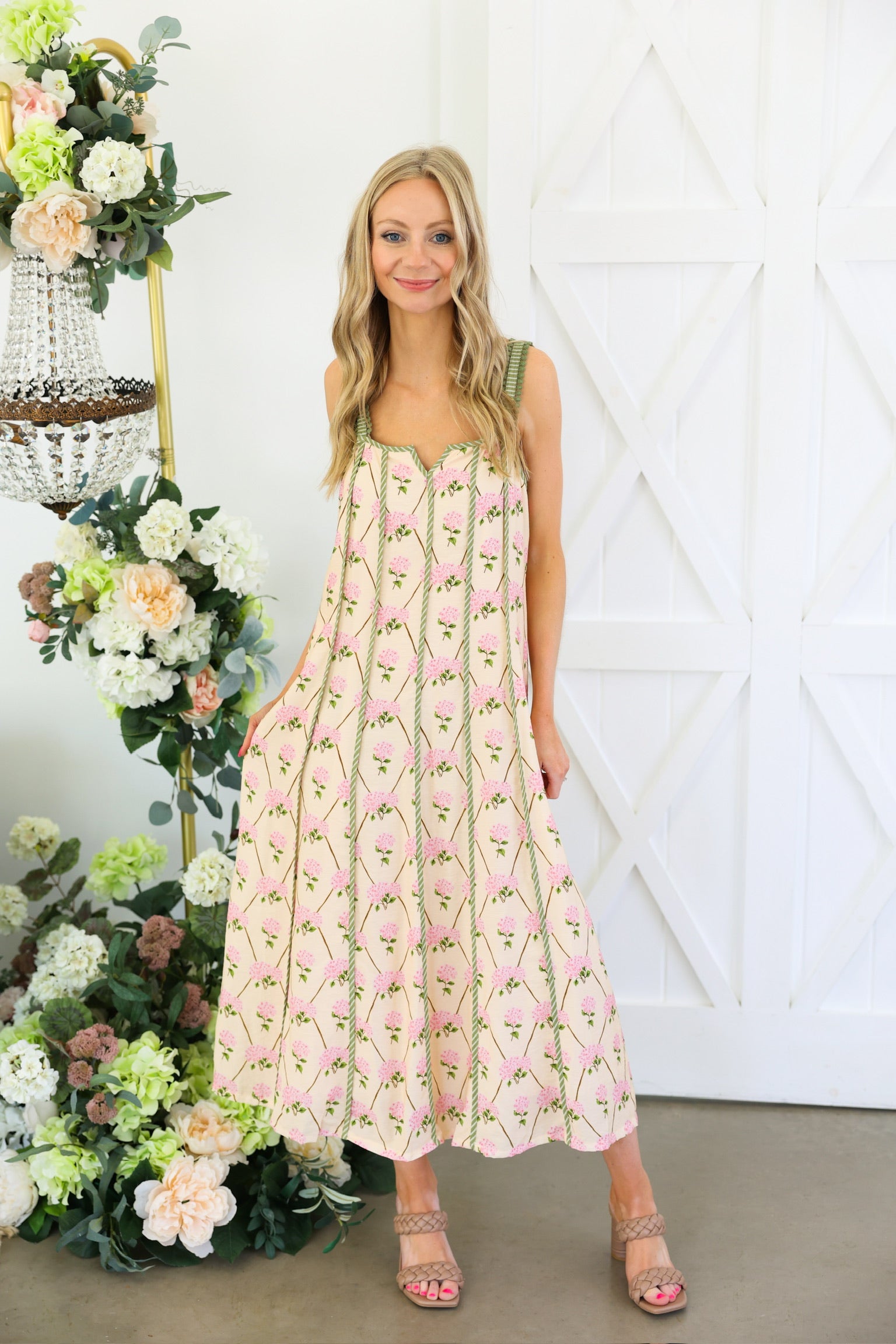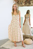 This dress is a soft, feminine staple with an effortlessly romantic feel. Featuring a delicate floral print on a light, airy base, it brings a fresh, garden-inspired charm thatās perfect for warm days and easy styling.