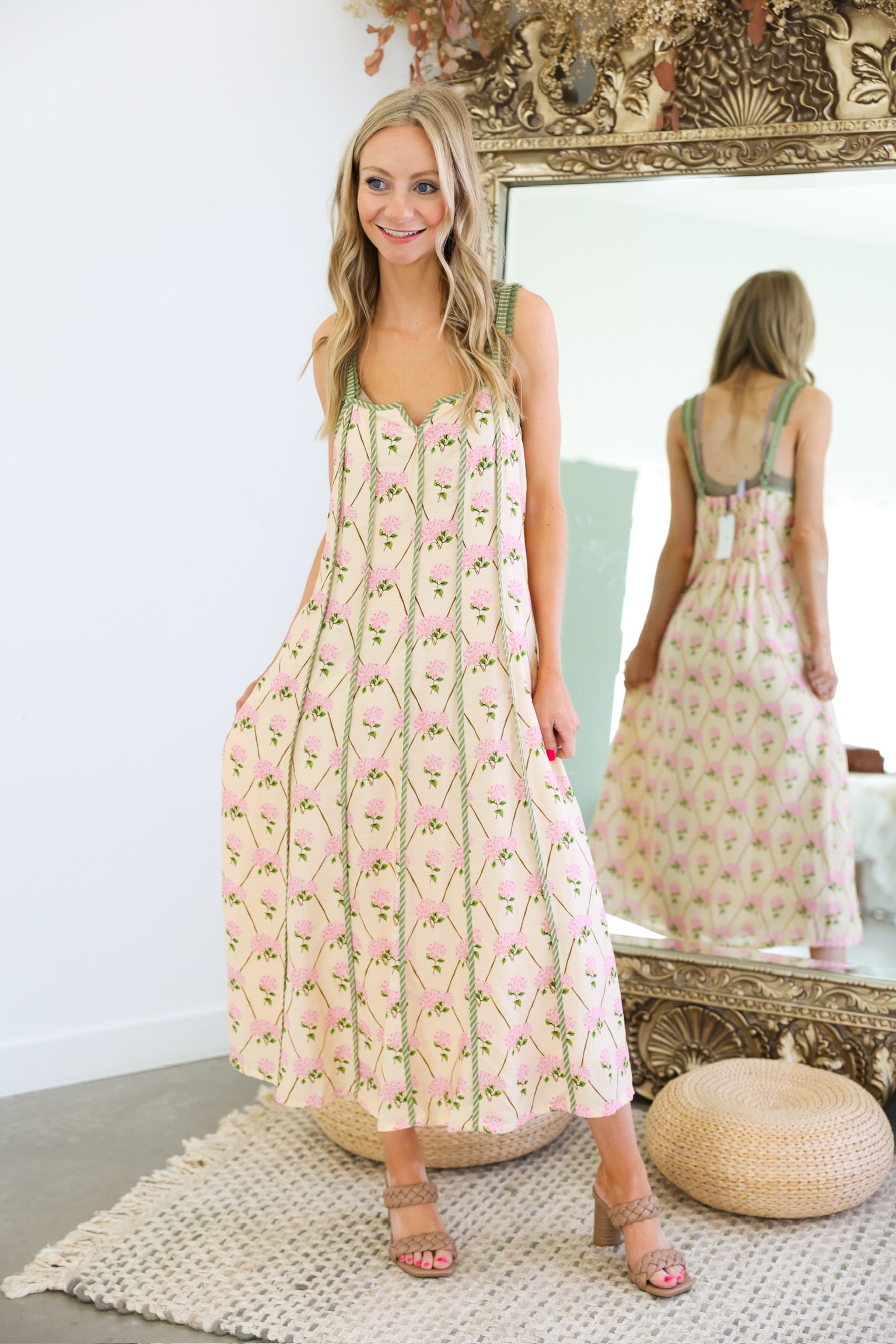 The flowy midi silhouette creates beautiful movement, while the thin straps and subtle neckline detail add a delicate, flattering touch. Itās the kind of piece youāll reach for again and againācomfortable, pretty, and effortlessly put together.