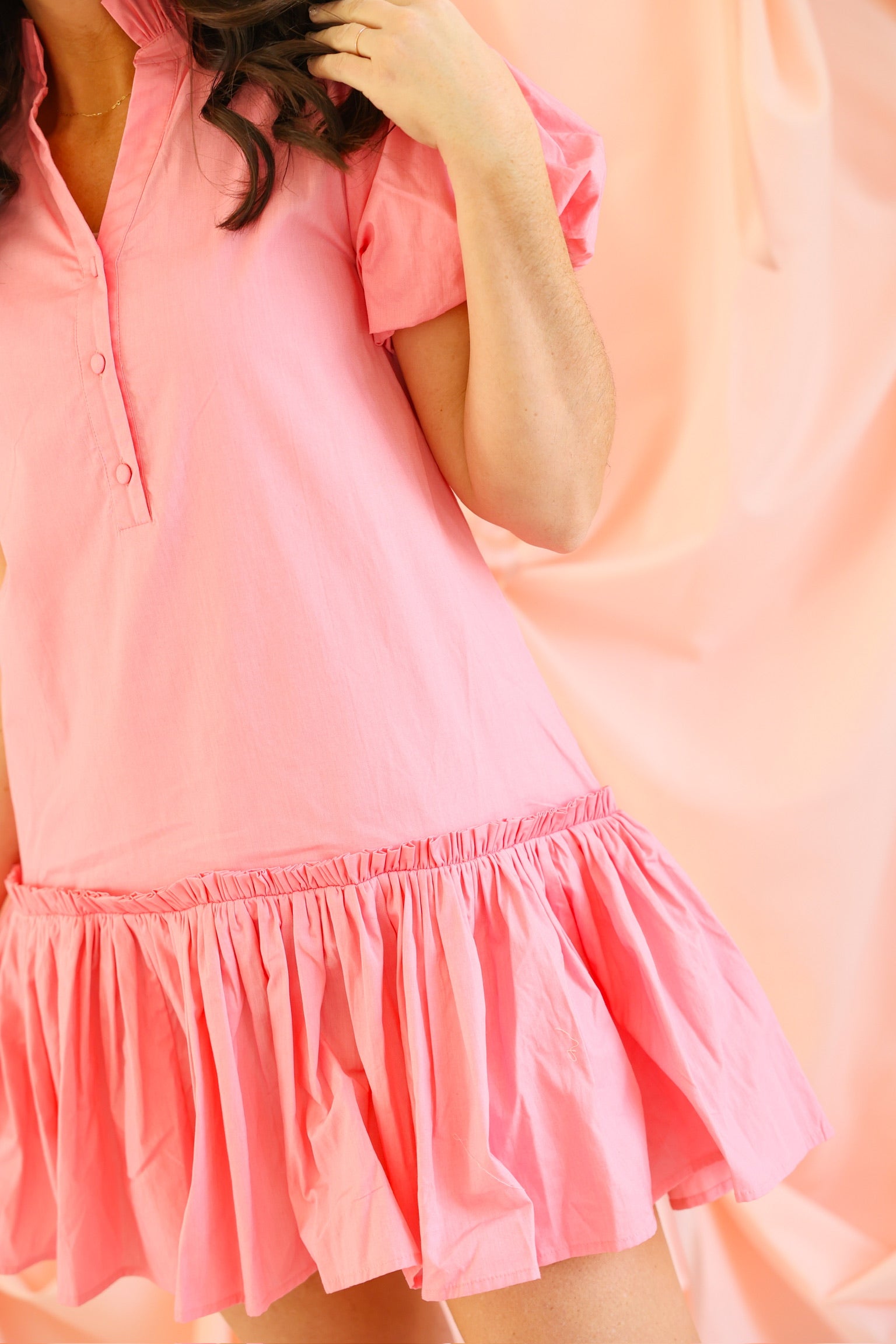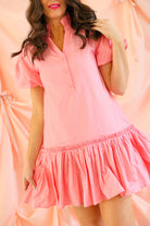 The Gia Dress is a perfect blend of timeless charm and modern style. This short puff sleeve dress features a ruffled mock neck with button-front detailing, and a drop waist ruffled skirt for an additional touch of flare.