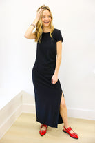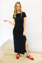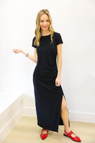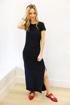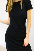 Featuring a crew neckline and short sleeves, this fitted midi dress offers a lightweight feel with a luxurious soft wash. Crafted from a blend of 90% rayon and 10% spandex, it ensures both comfort and flexibility. With a length of 48 inches from the shoulder, it perfectly balances style and ease for any occasion!