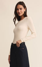 Crew neck, Long sleeve, Lightweight, Heavy soft wash, Regular fit, Second Skin 1X1 Baby Rib: 92% Rayon 8% Spandex, Length from shoulder is 22in
