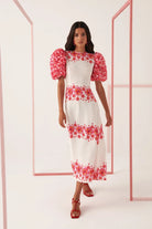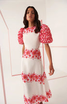 Our Natura Floral dress will make you a show-stopper for sure. It's elegant and timeless. White, with a delicate red flower pattern throughout the piece. Stunning puffed red flower sleeves that will leave no one indifferent. Figure fitting and closed neckline, zipped at the back and pocket-less.