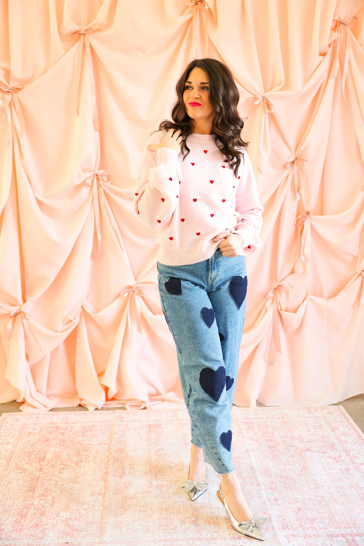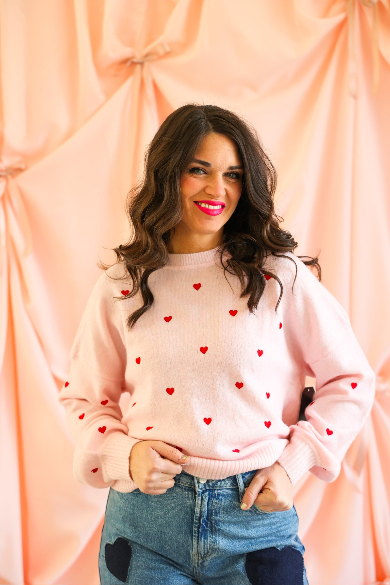 • Soft blush knit with allover red embroidered heart details ❤️