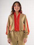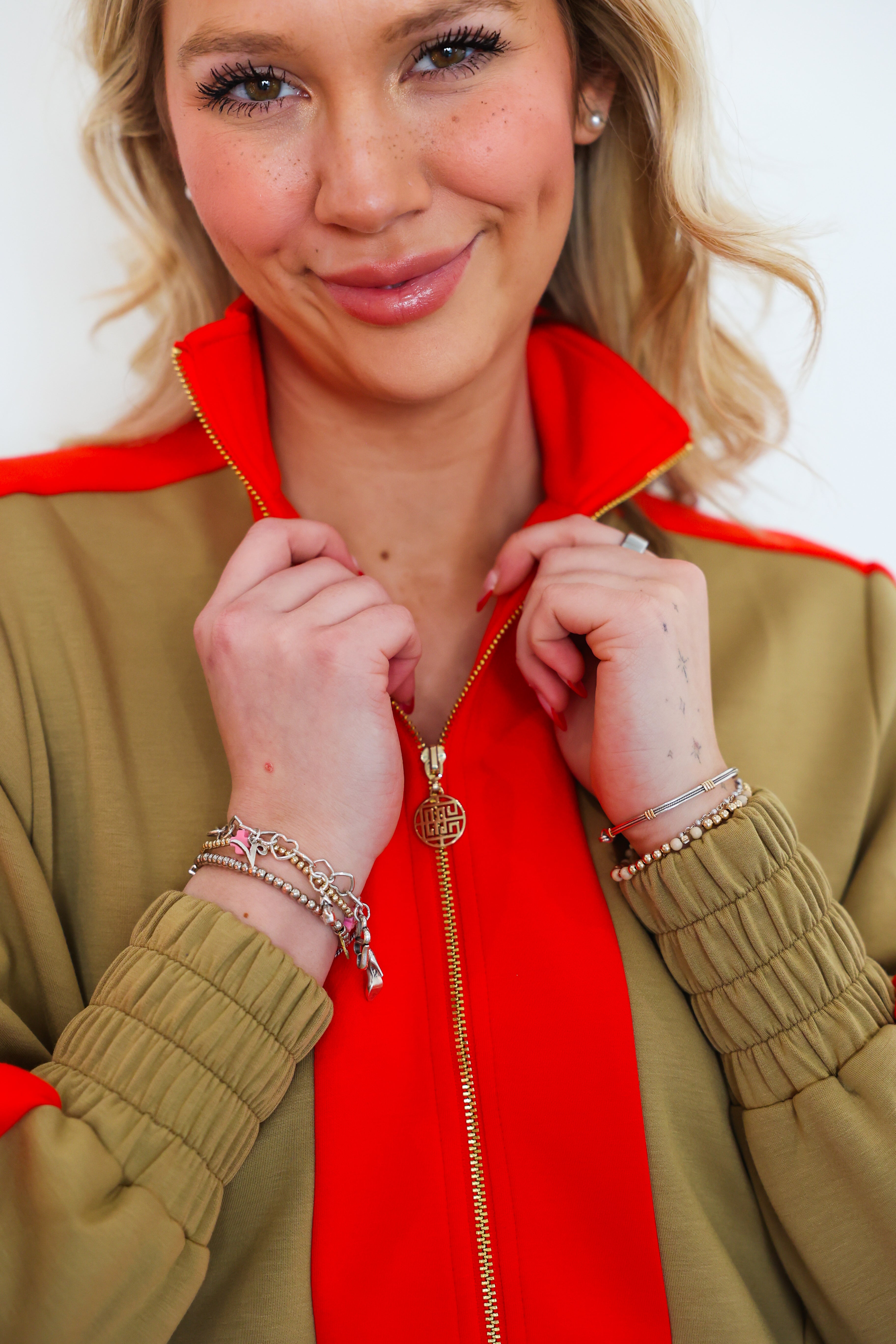 Sporty polish meets statement style in the Emily McCarthy Bailey Bomber in Cherry Spice 🍒✨ Designed to move with you while still looking effortlessly put-together, this standout layer features a warm caramel base accented with bold cherry red details for a fresh, modern contrast. The classic bomber silhouette is elevated with luxe finishes like a stand collar, elastic cuffs, and a two-way zip with a signature gold logo pull. An adjustable hem allows you to customize the fit, making this the perfect throw-on-and-go piece for everyday wear.