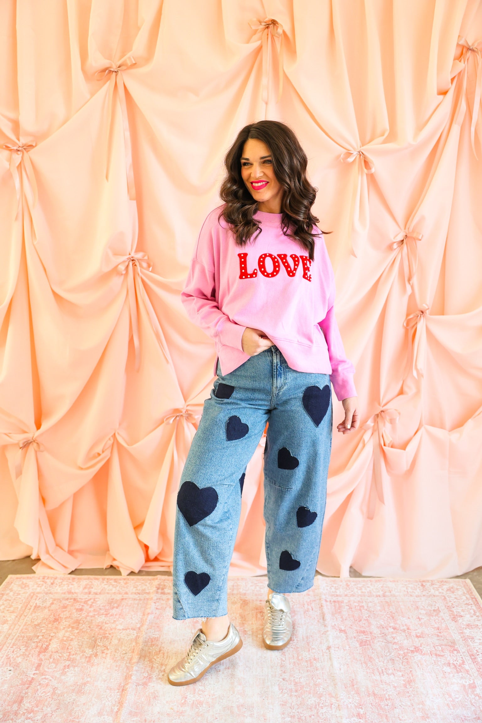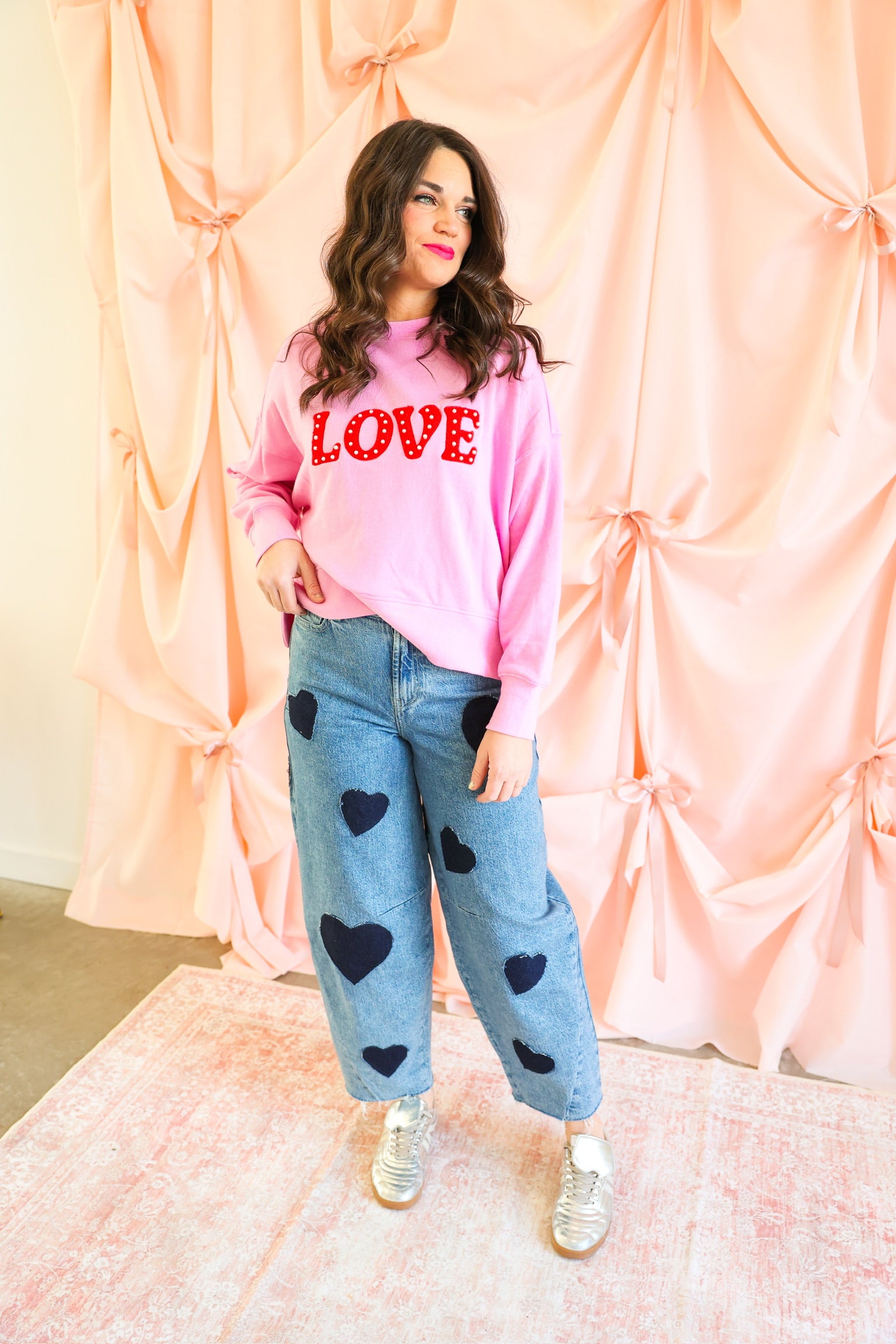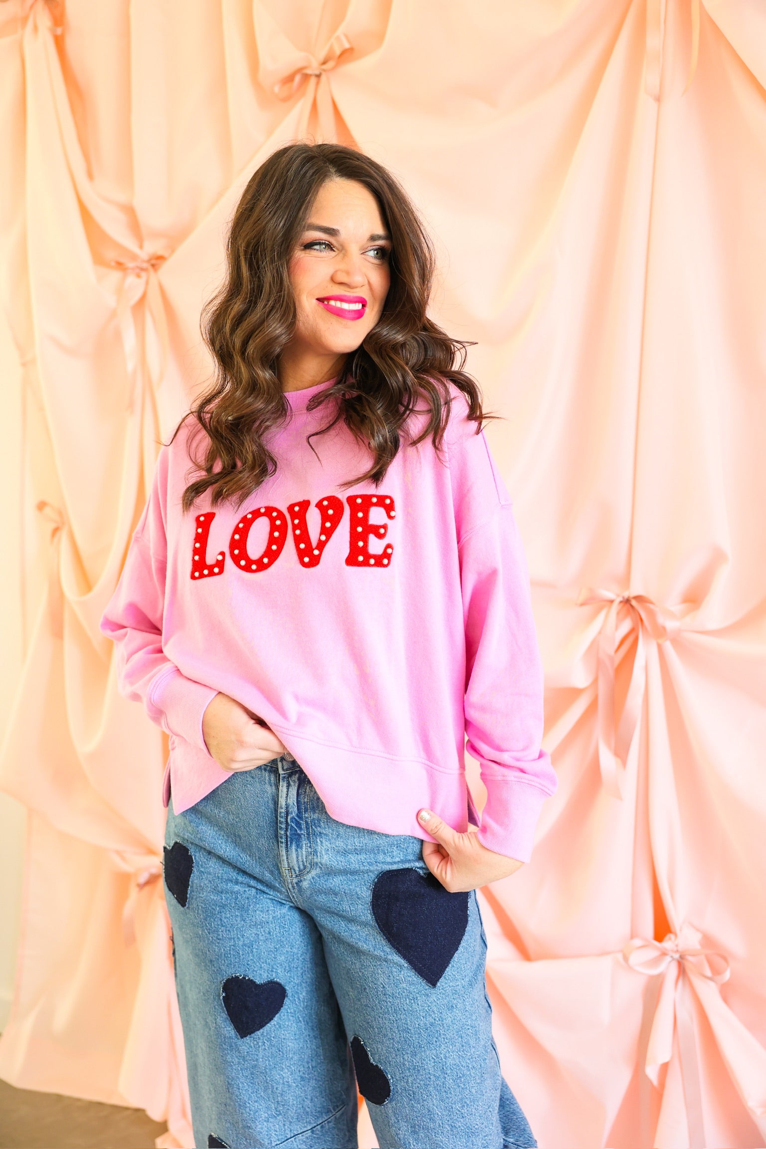 Effortlessly cozy with a bold pop of personality, the “Love” Relaxed Sweatshirt in Candy Pink is made to say it loud and proud 💕✨ Crafted from soft cotton, this feel-good pullover features statement red chenille “LOVE” lettering accented with faux pearl studs for a touch of sparkle. Designed with a relaxed drop-shoulder silhouette and a slightly cropped hem, it’s the perfect blend of comfort and playful style—ideal for casual days, coffee runs, or cozy nights in.