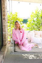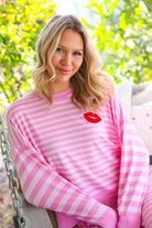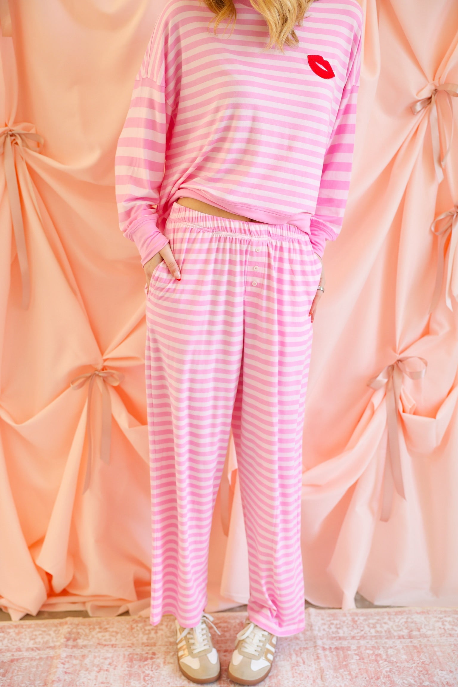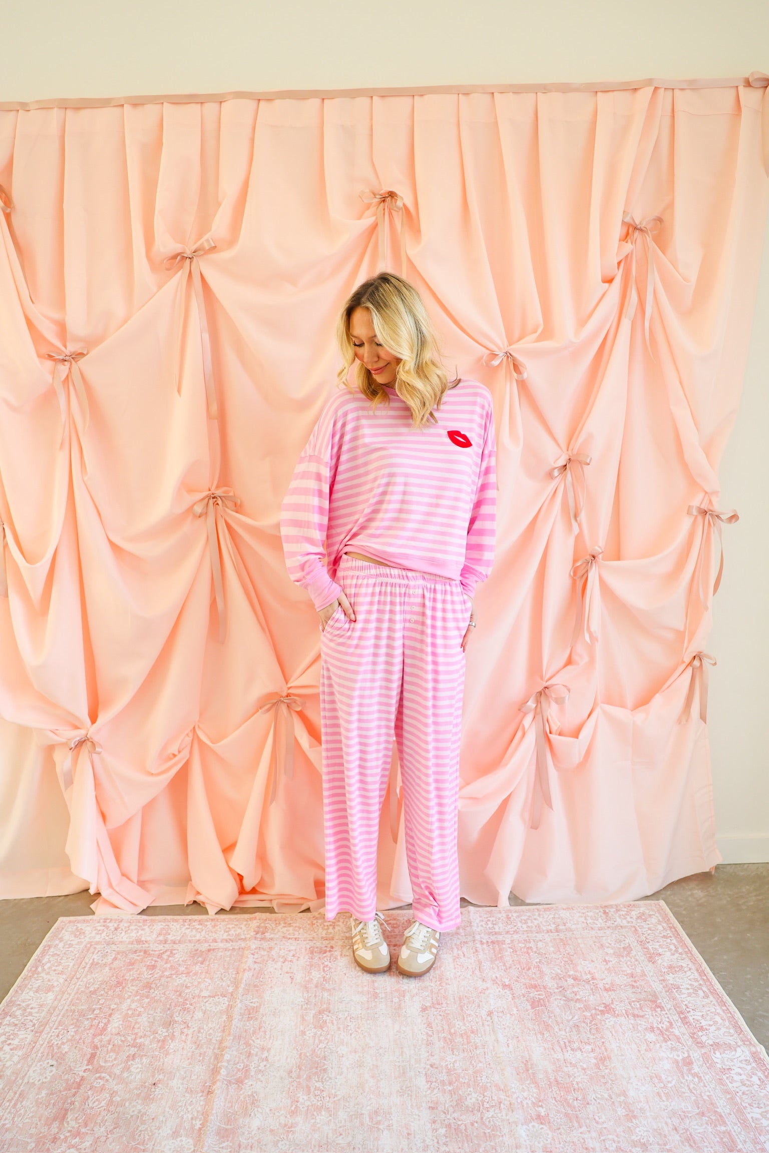 Effortlessly cozy with a playful pop, the Shiraleah Stripe Ultra-Soft Jersey Knit PJ Set is made for lounging in total comfort and style 💕✨ This relaxed two-piece set features a long-sleeve pullover top with soft ribbed trim and coordinating striped pants, all crafted from a buttery-soft jersey knit. Light pink stripes, contrast cuffs, and a flirty red lip accent at the chest add a fun, feminine touch—making this your go-to set for cozy nights and slow mornings.