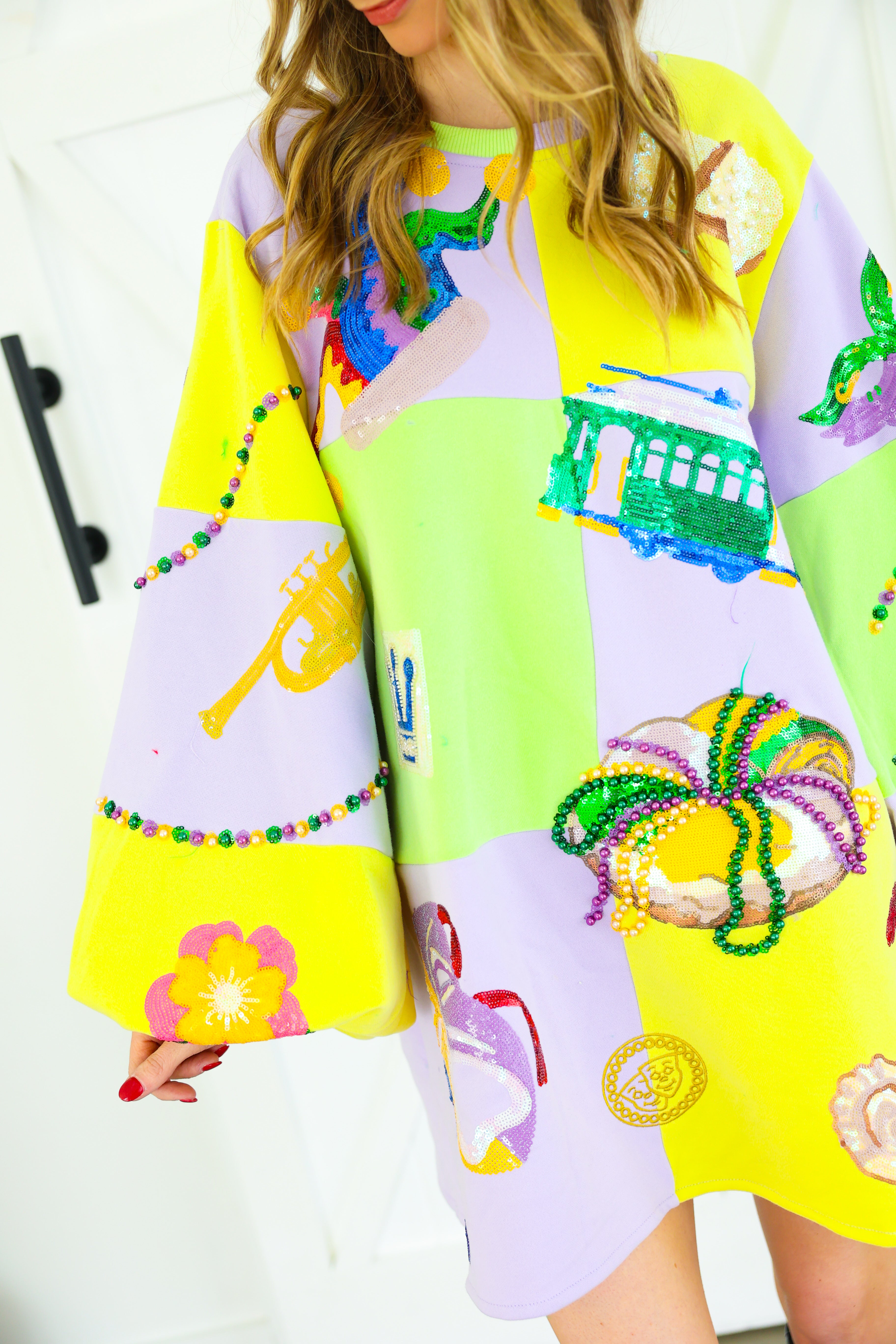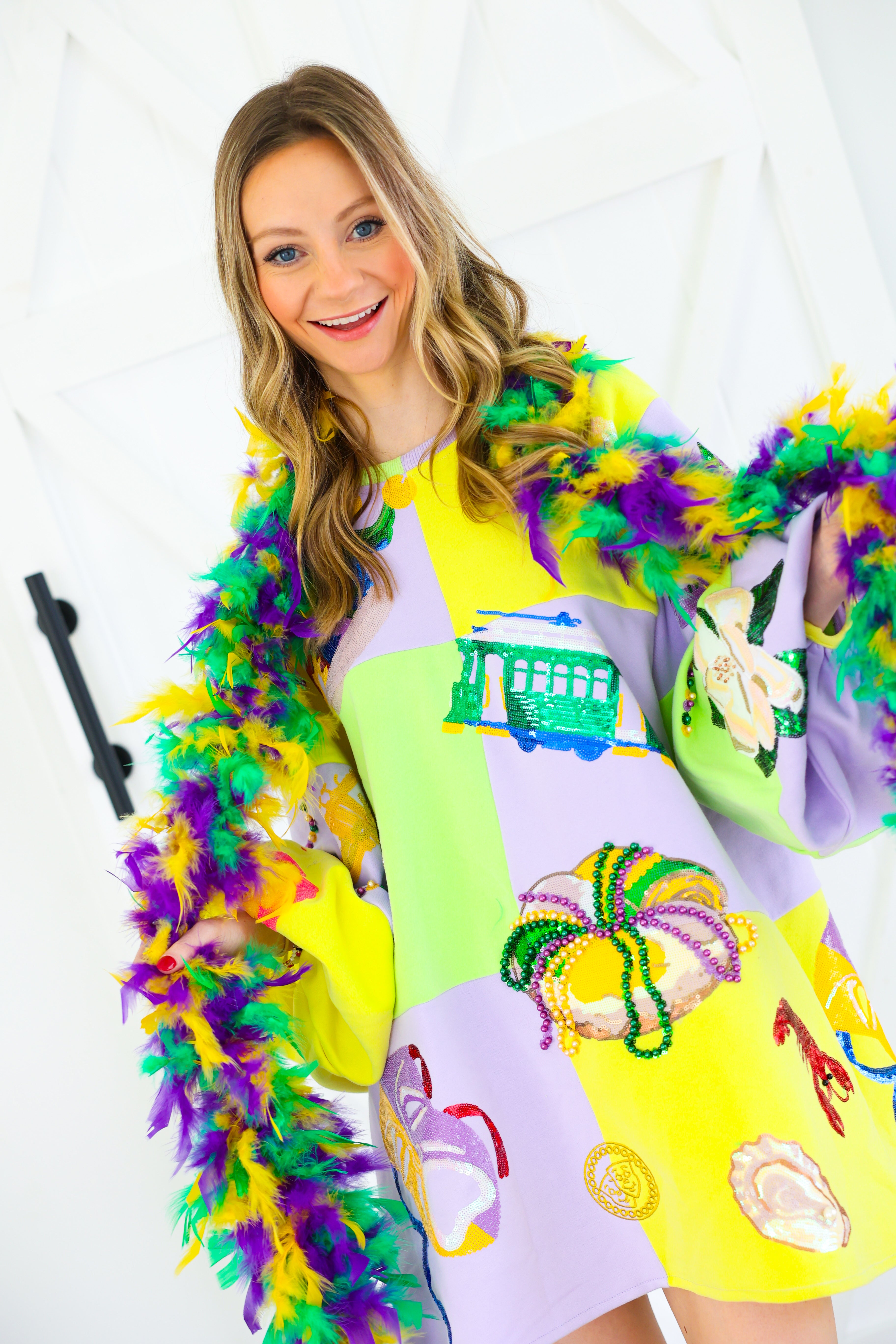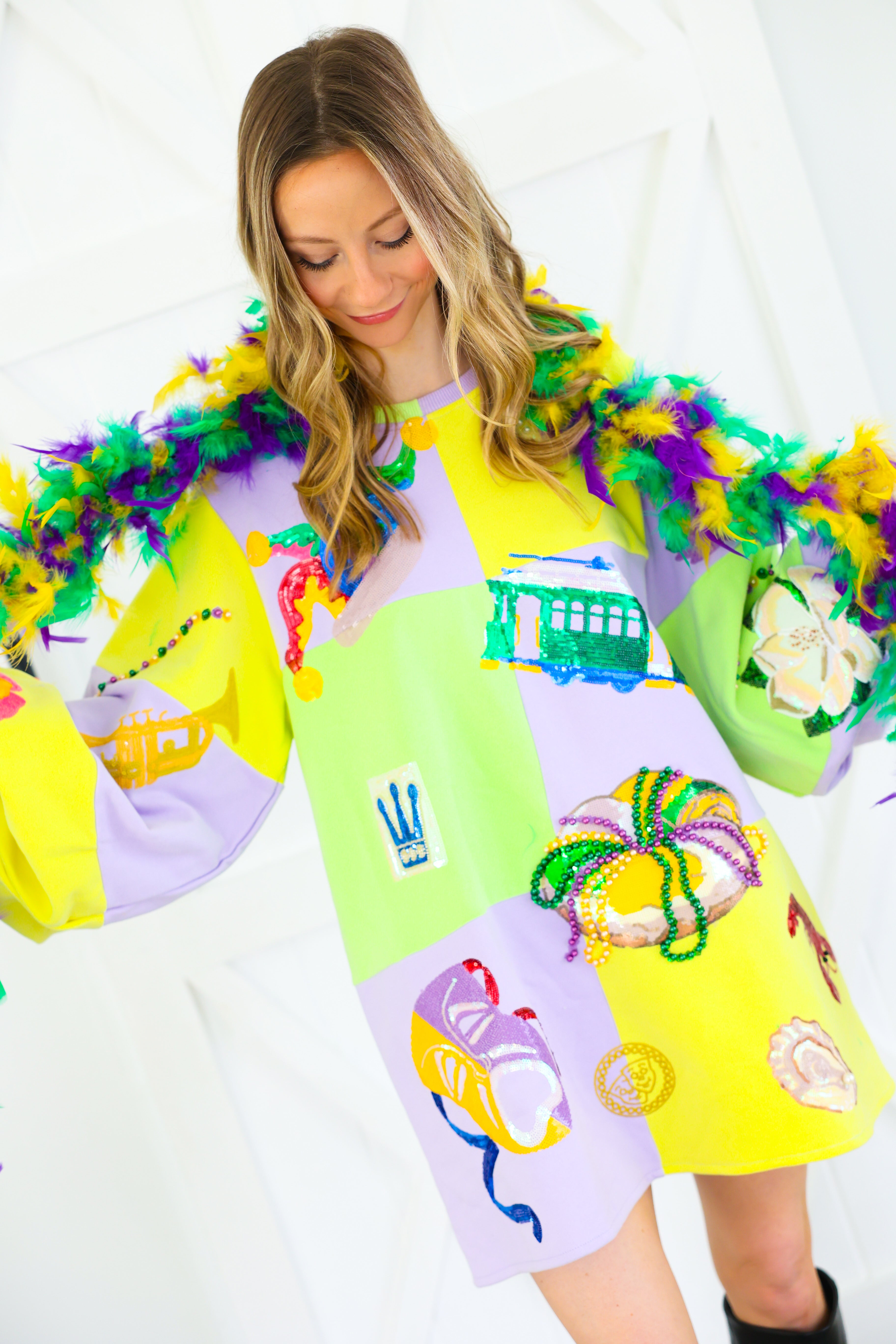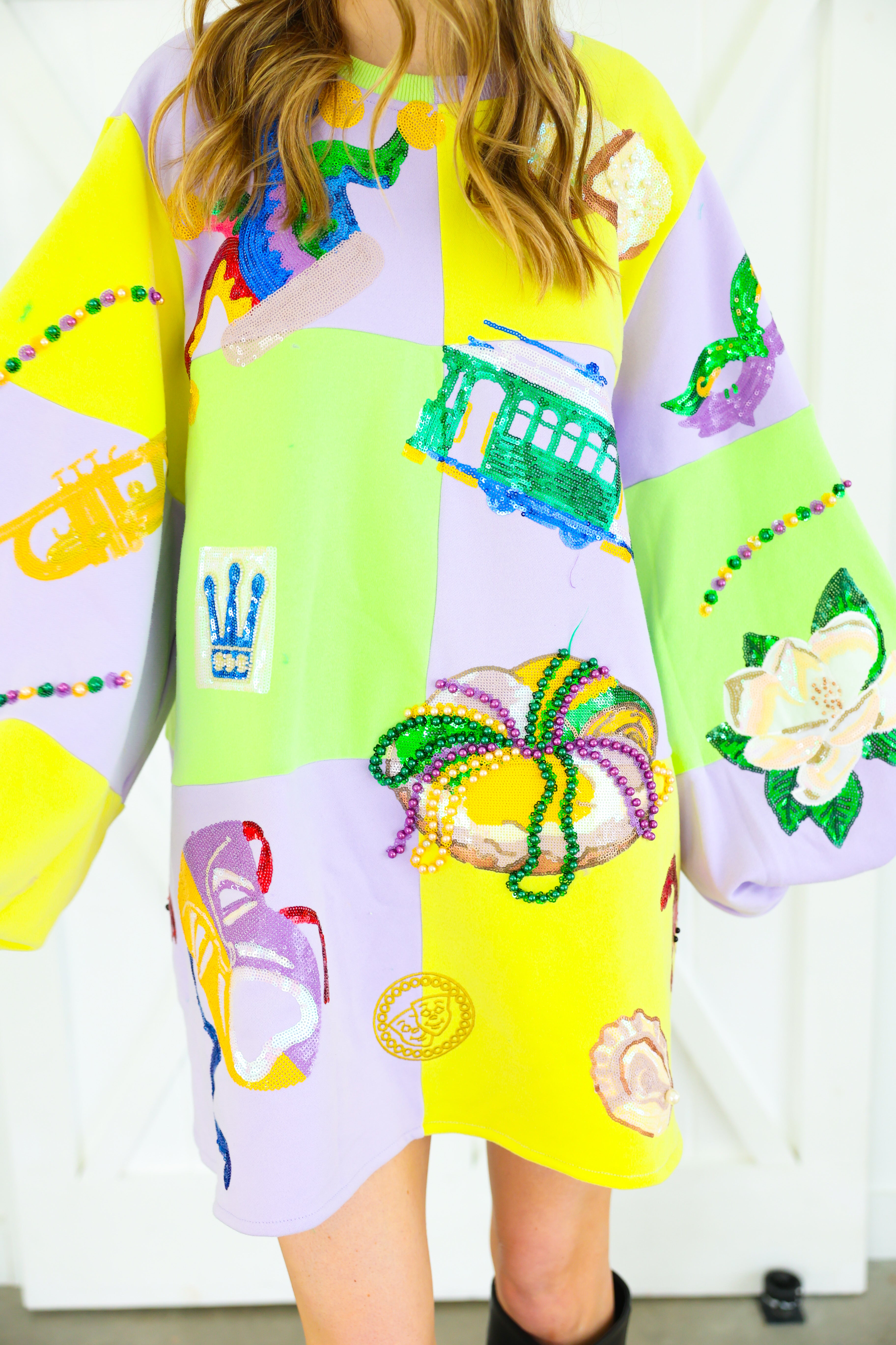 Celebrate in full sparkle with the Queen of Sparkles Checkered Mardi Gras Icon Balloon Sleeve Dress 🎭💜✨ This festive showstopper features a pastel checkered patchwork design adorned with oversized Mardi Gras icons—masks, crowns, beads, king cakes, streetcars, and more—each intricately embellished with sequins and beads for maximum shine 💚💛 The dramatic balloon sleeves add playful volume, making this the ultimate statement dress for parades, parties, and carnival celebrations.
