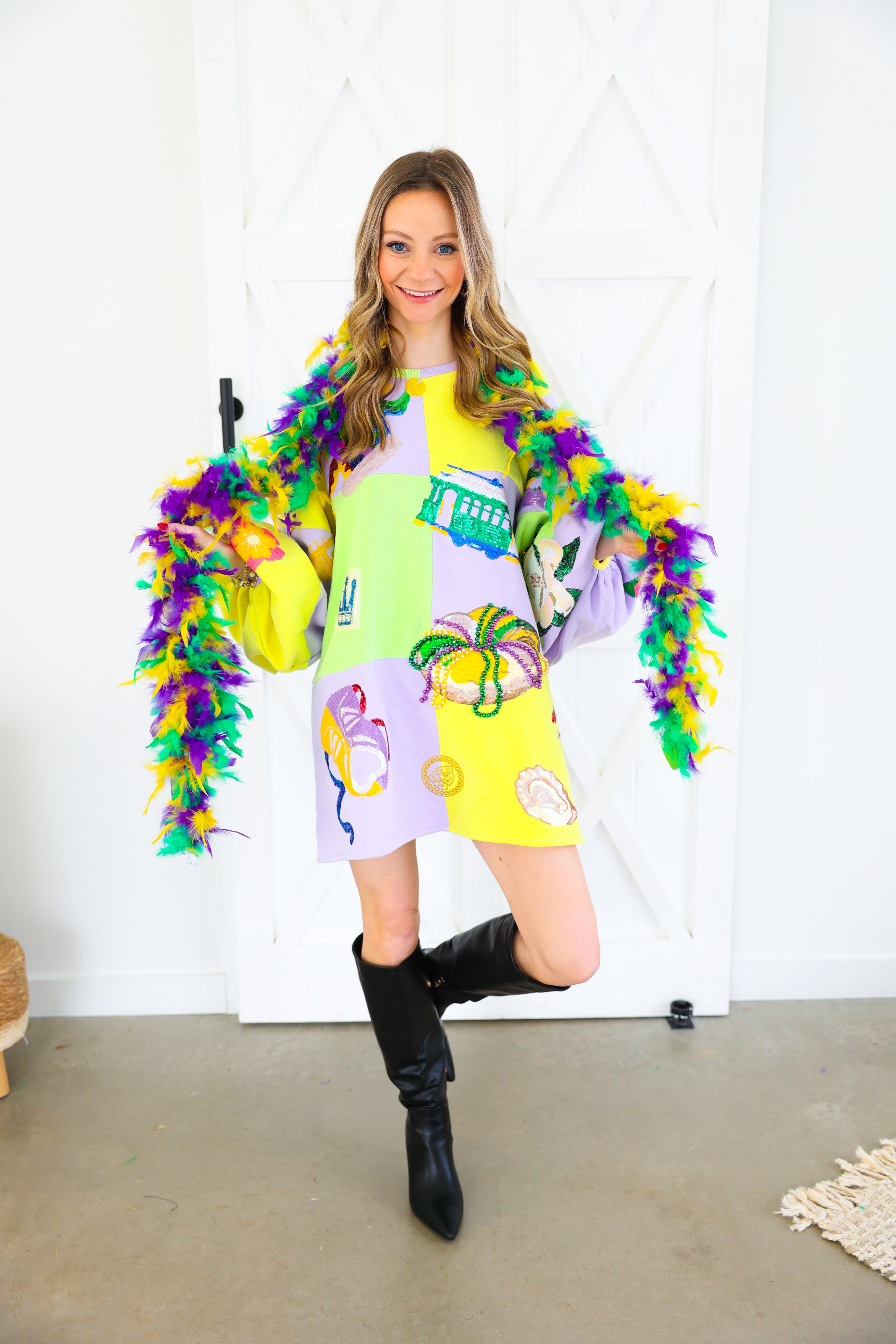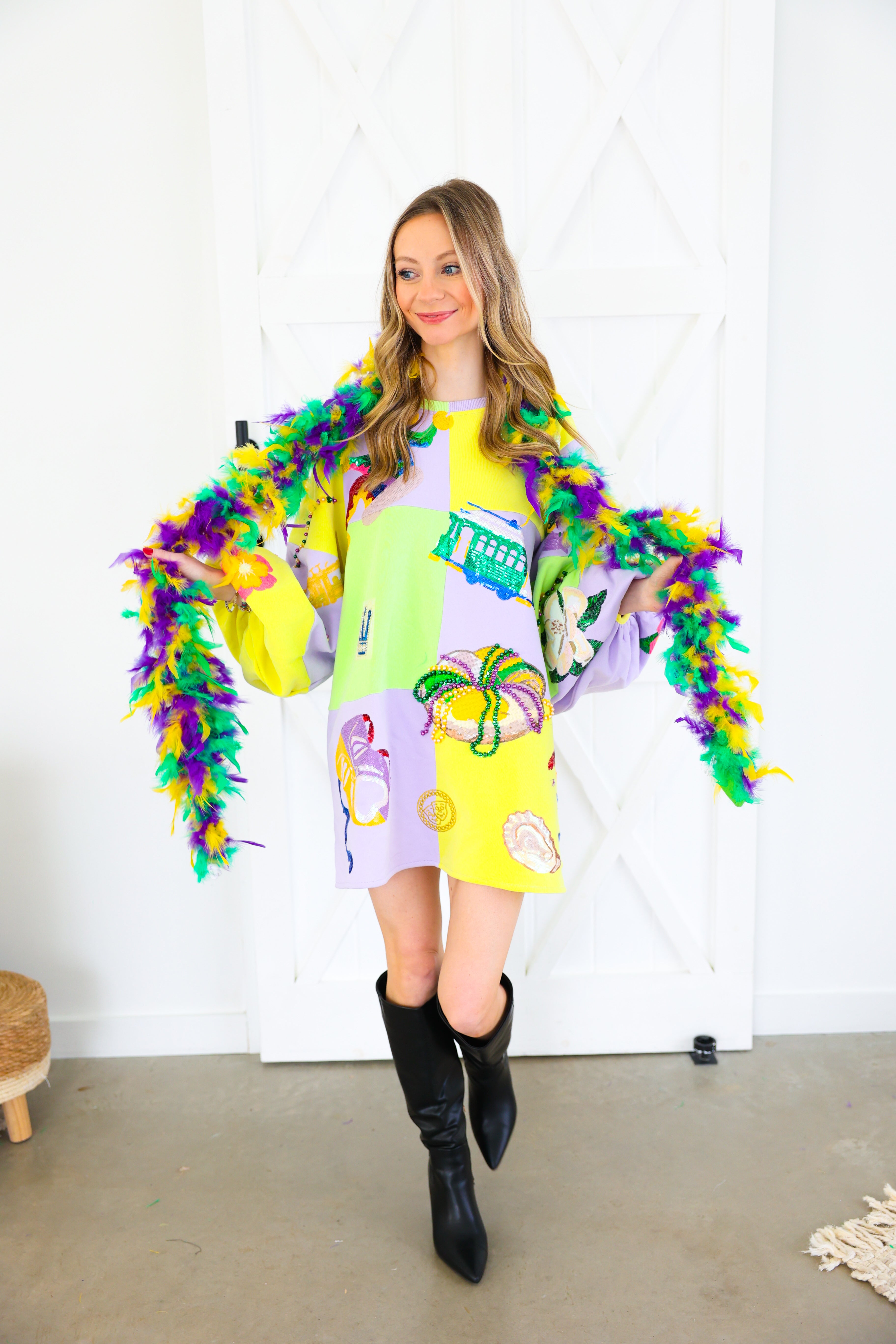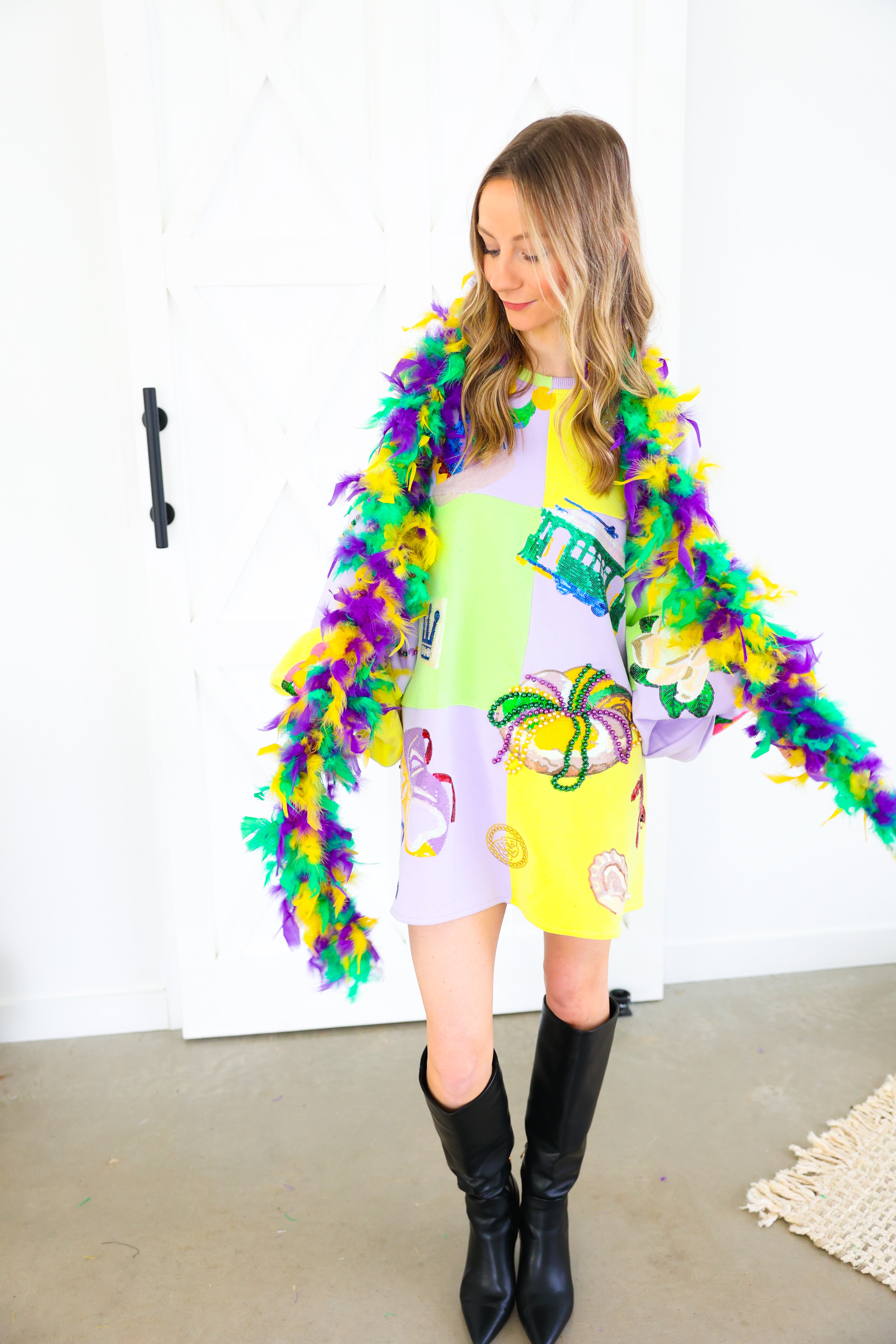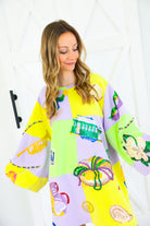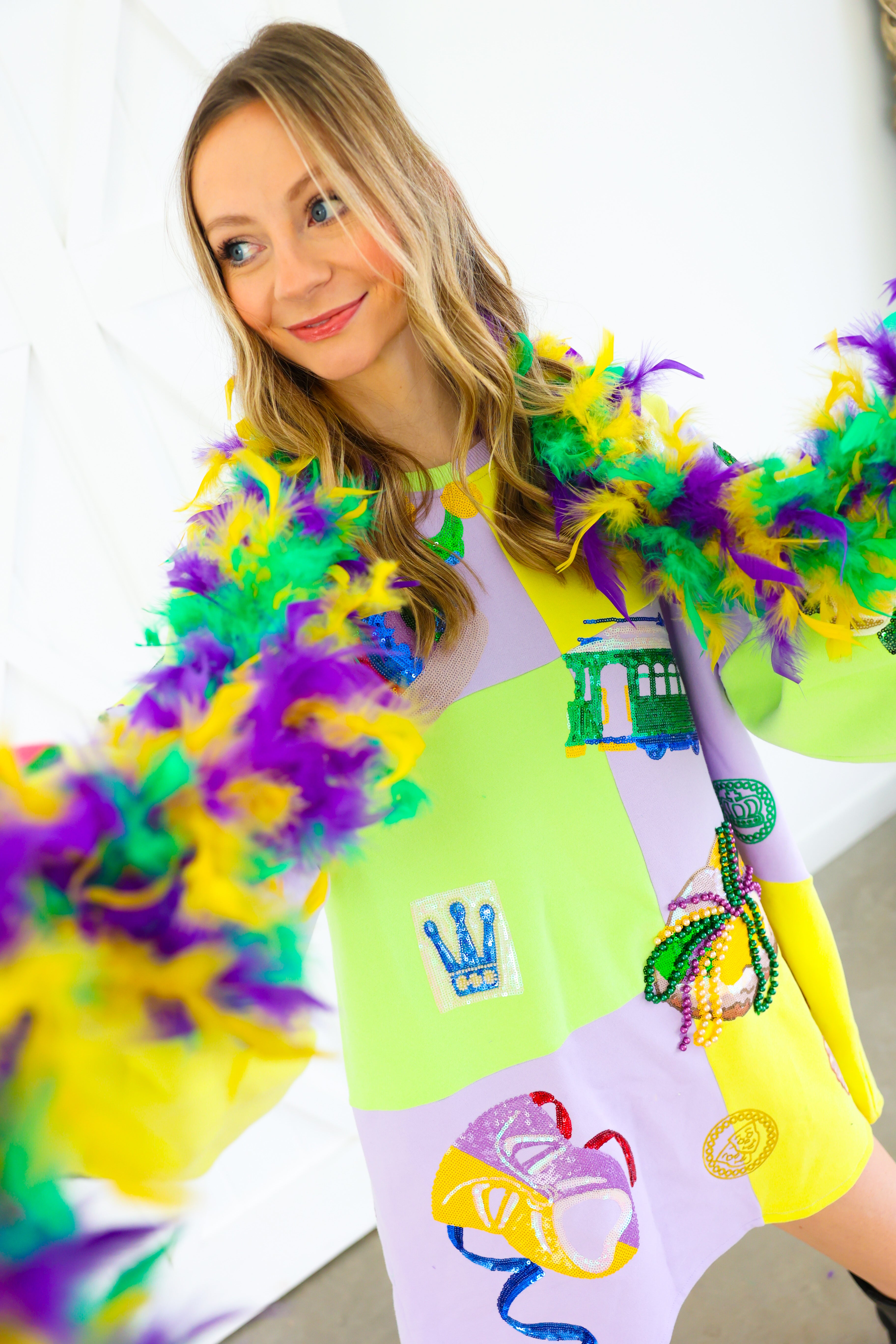 Celebrate in full sparkle with the Queen of Sparkles Checkered Mardi Gras Icon Balloon Sleeve Dress 🎭💜✨ This festive showstopper features a pastel checkered patchwork design adorned with oversized Mardi Gras icons—masks, crowns, beads, king cakes, streetcars, and more—each intricately embellished with sequins and beads for maximum shine 💚💛 The dramatic balloon sleeves add playful volume, making this the ultimate statement dress for parades, parties, and carnival celebrations.