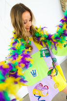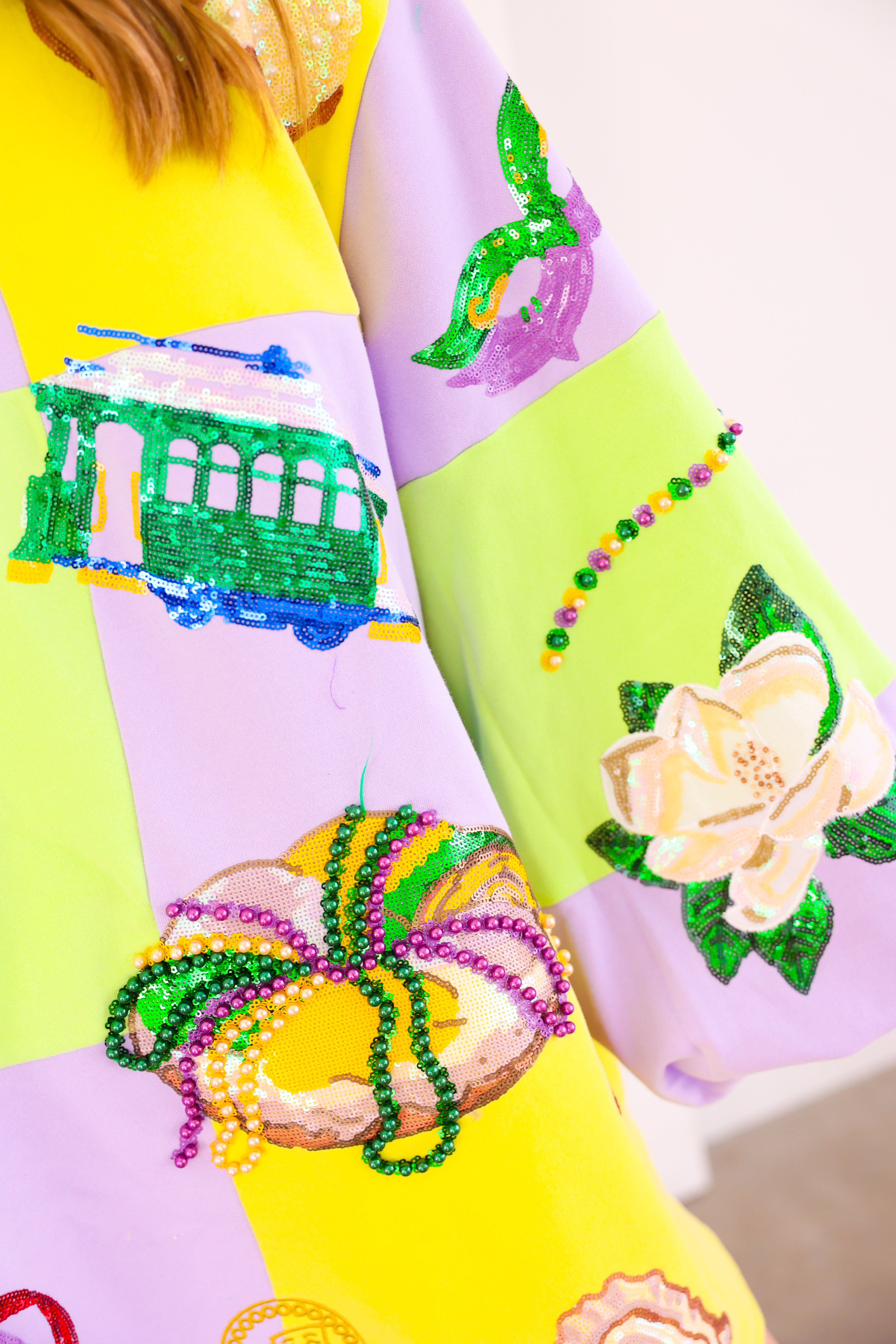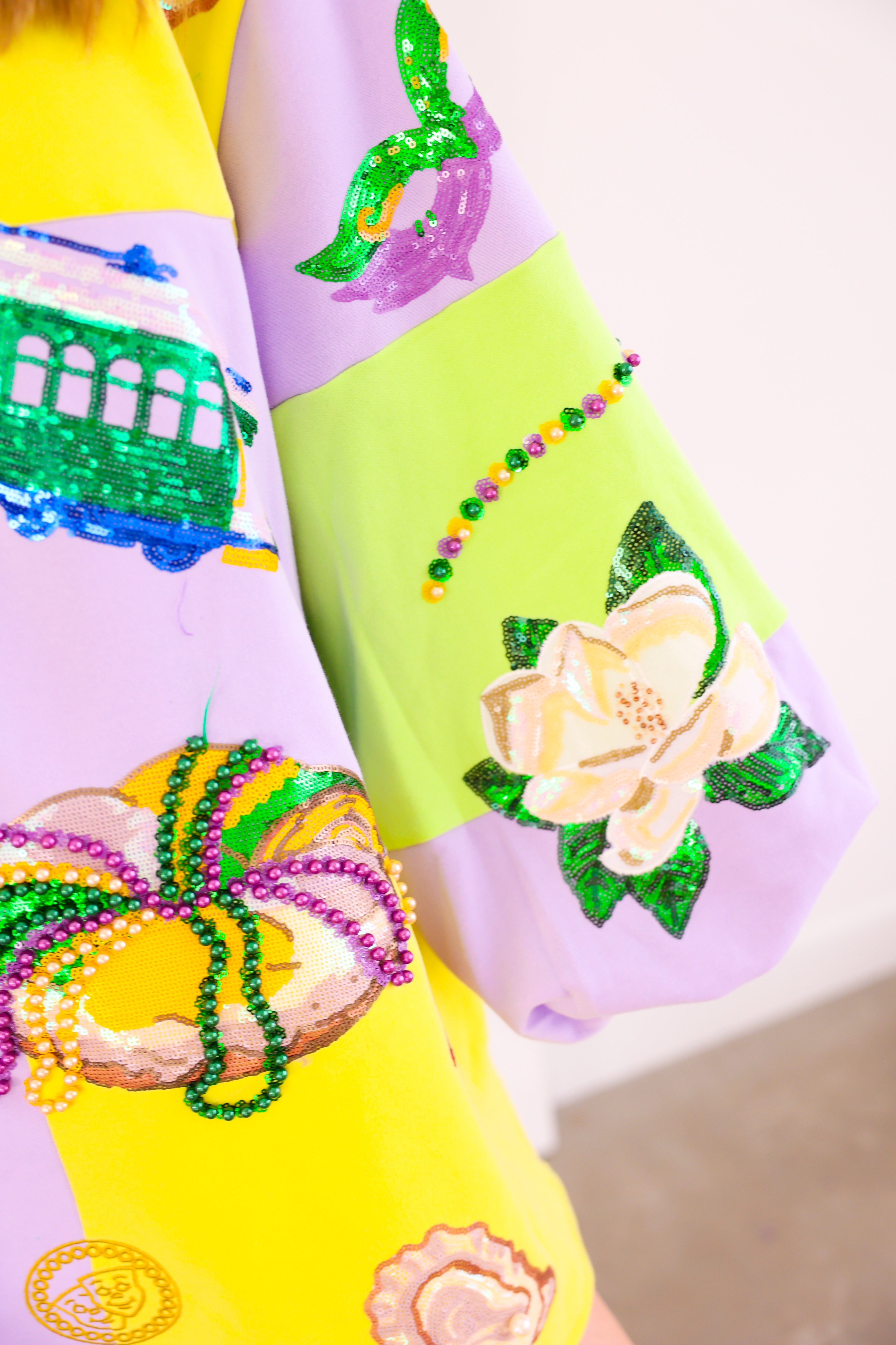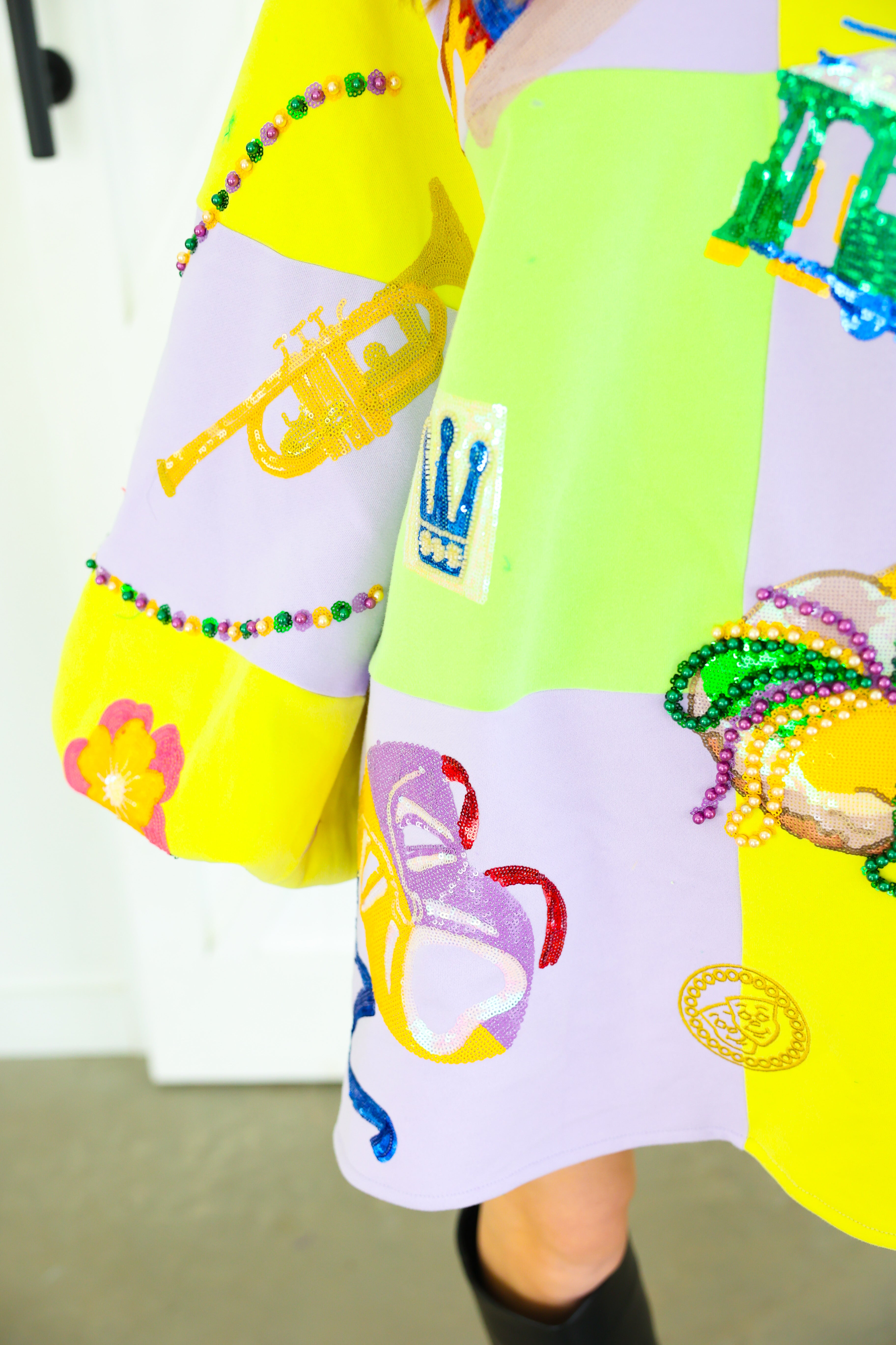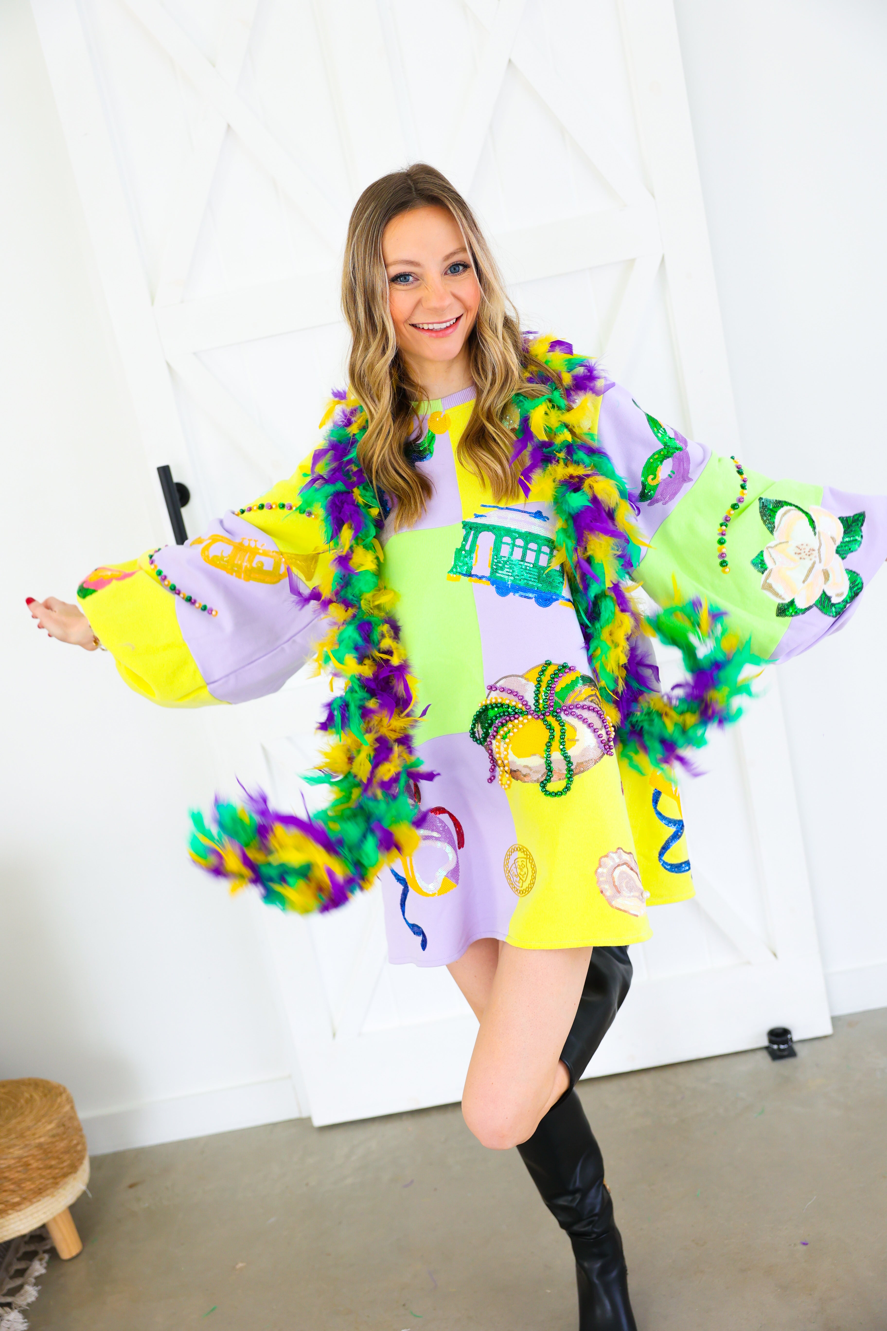 Celebrate in full sparkle with the Queen of Sparkles Checkered Mardi Gras Icon Balloon Sleeve Dress 🎭💜✨ This festive showstopper features a pastel checkered patchwork design adorned with oversized Mardi Gras icons—masks, crowns, beads, king cakes, streetcars, and more—each intricately embellished with sequins and beads for maximum shine 💚💛 The dramatic balloon sleeves add playful volume, making this the ultimate statement dress for parades, parties, and carnival celebrations.
