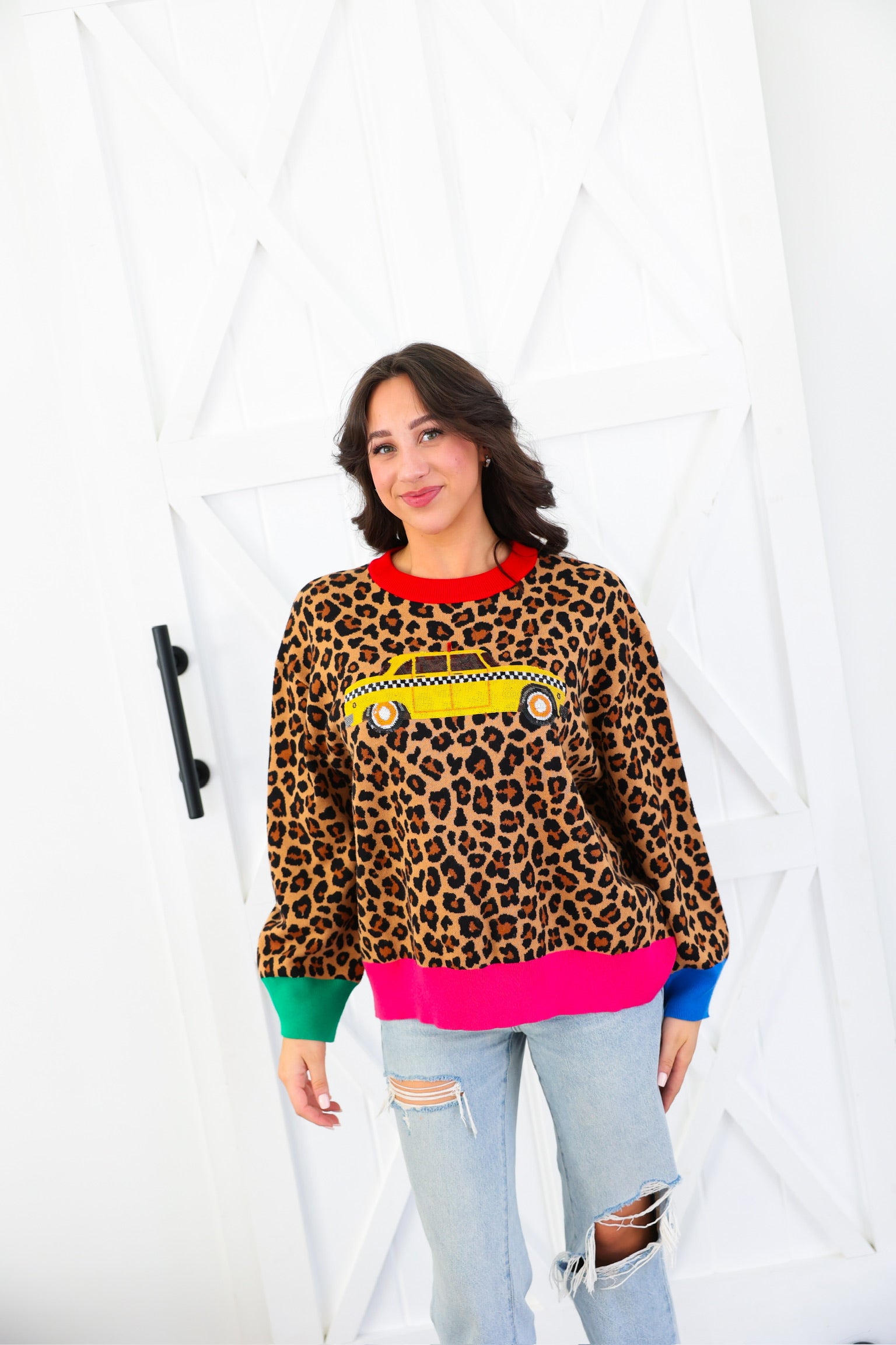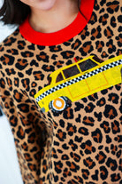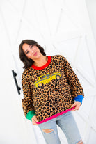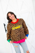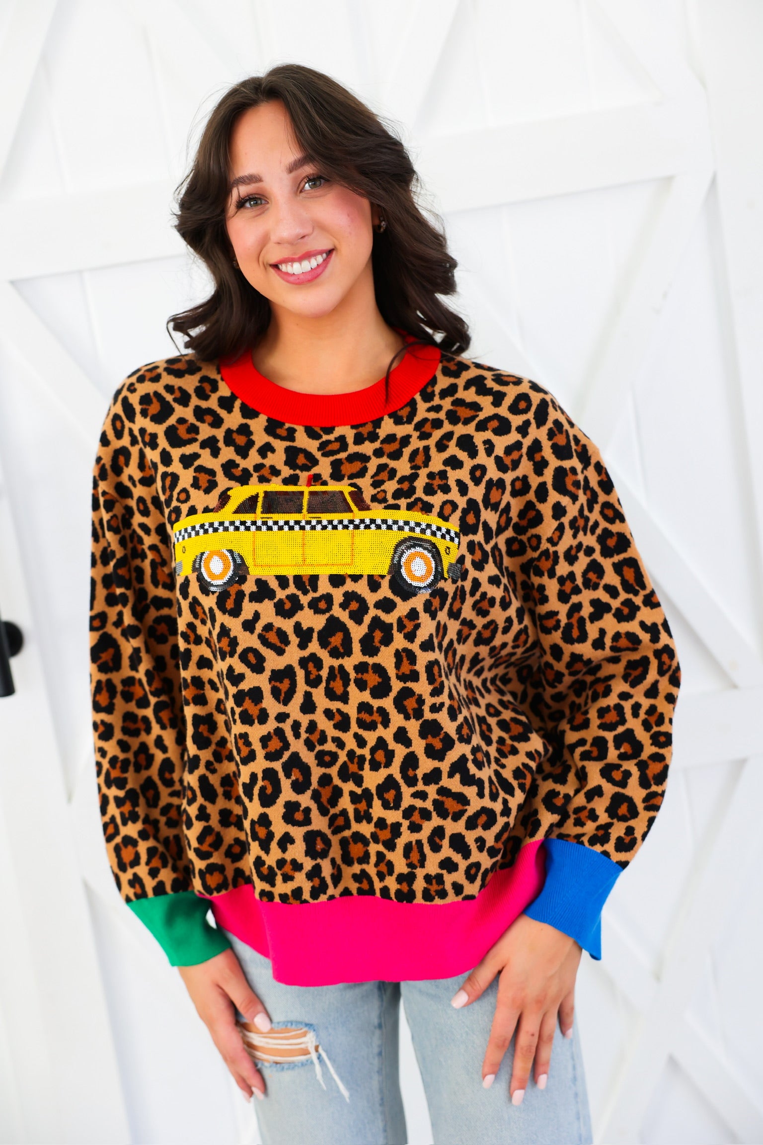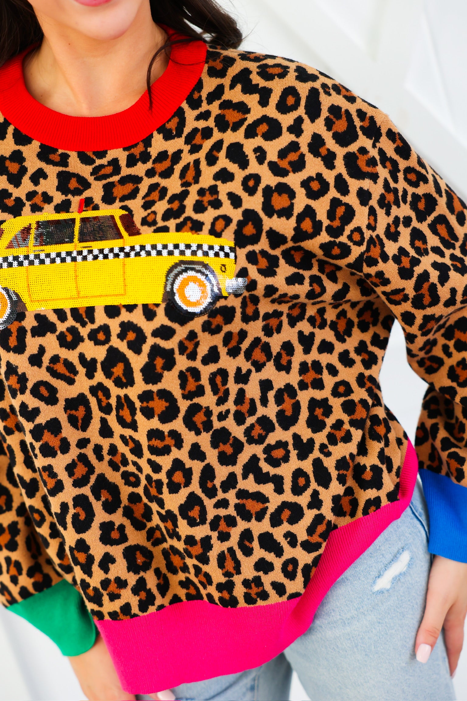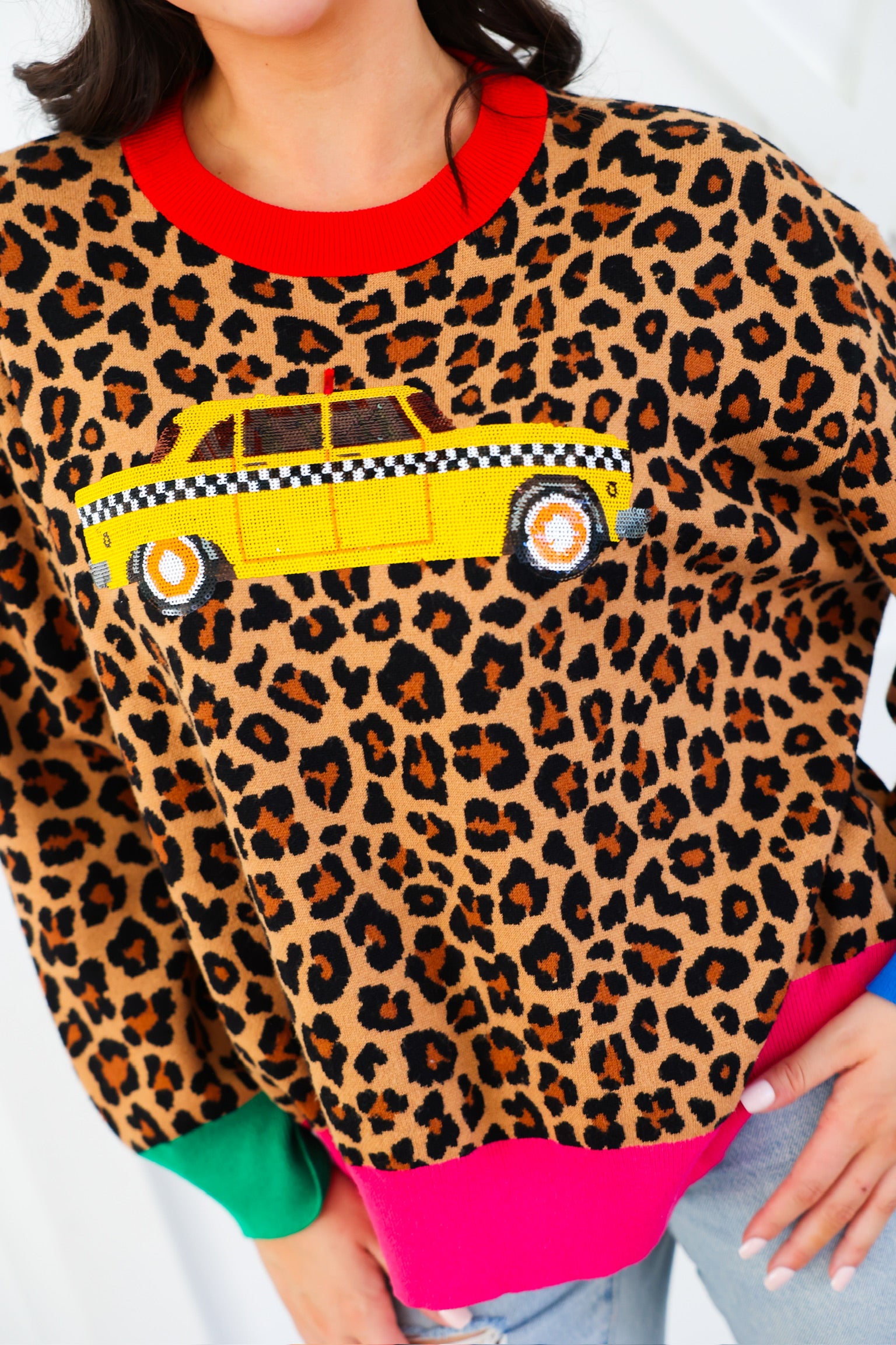 Queen of Sparkles Leopard Colorblock Trim Taxi Cab Sweater