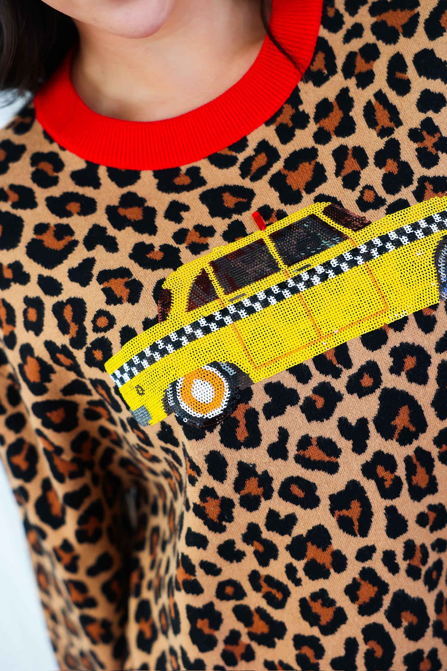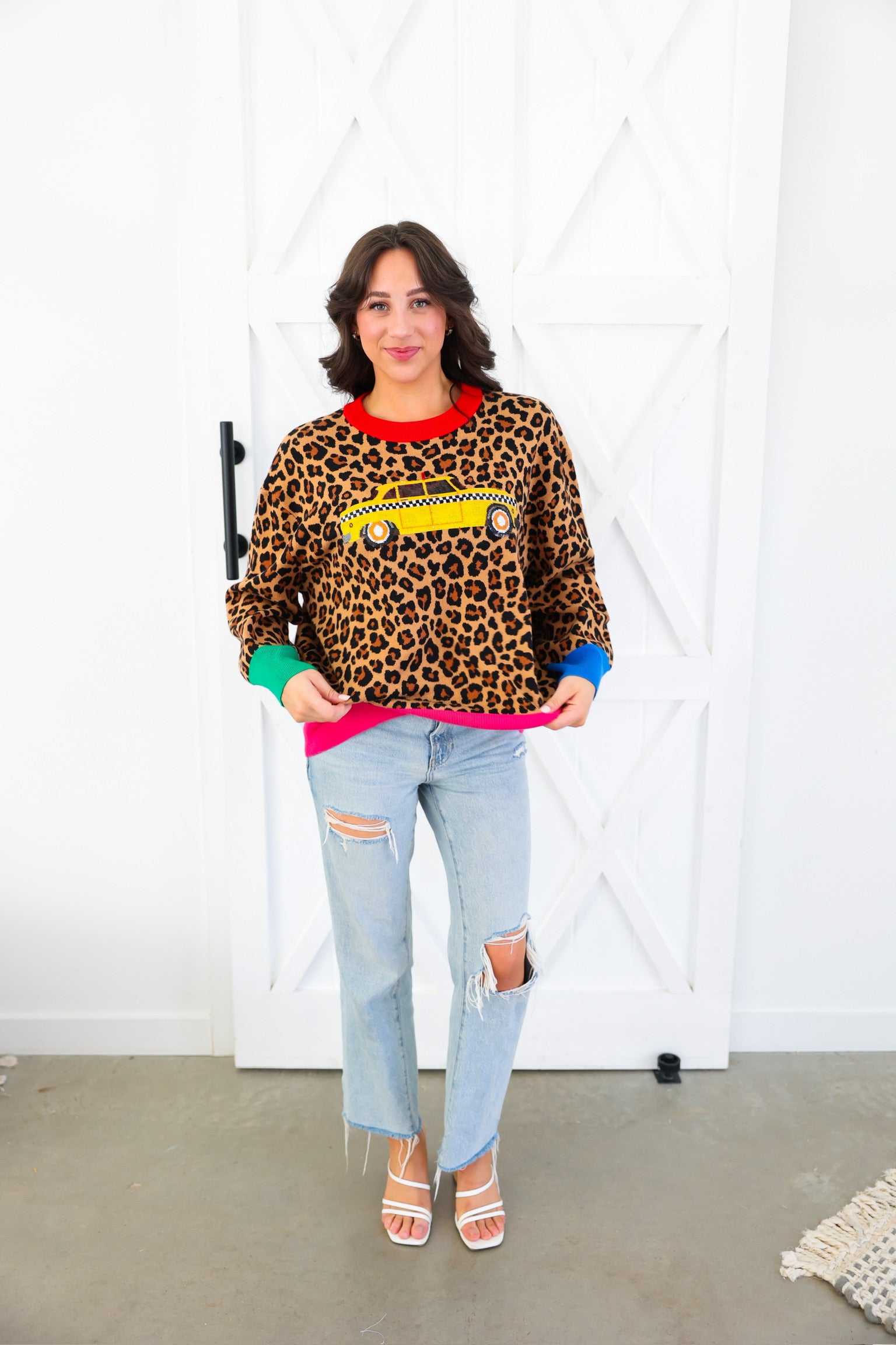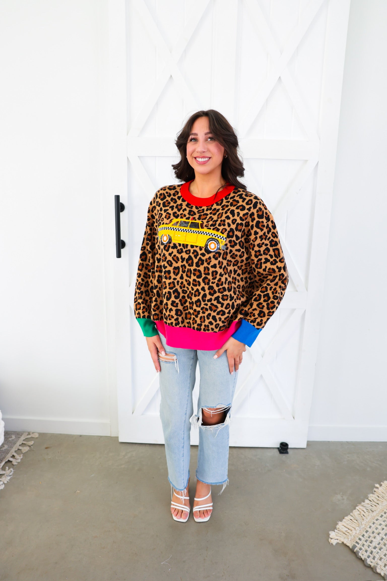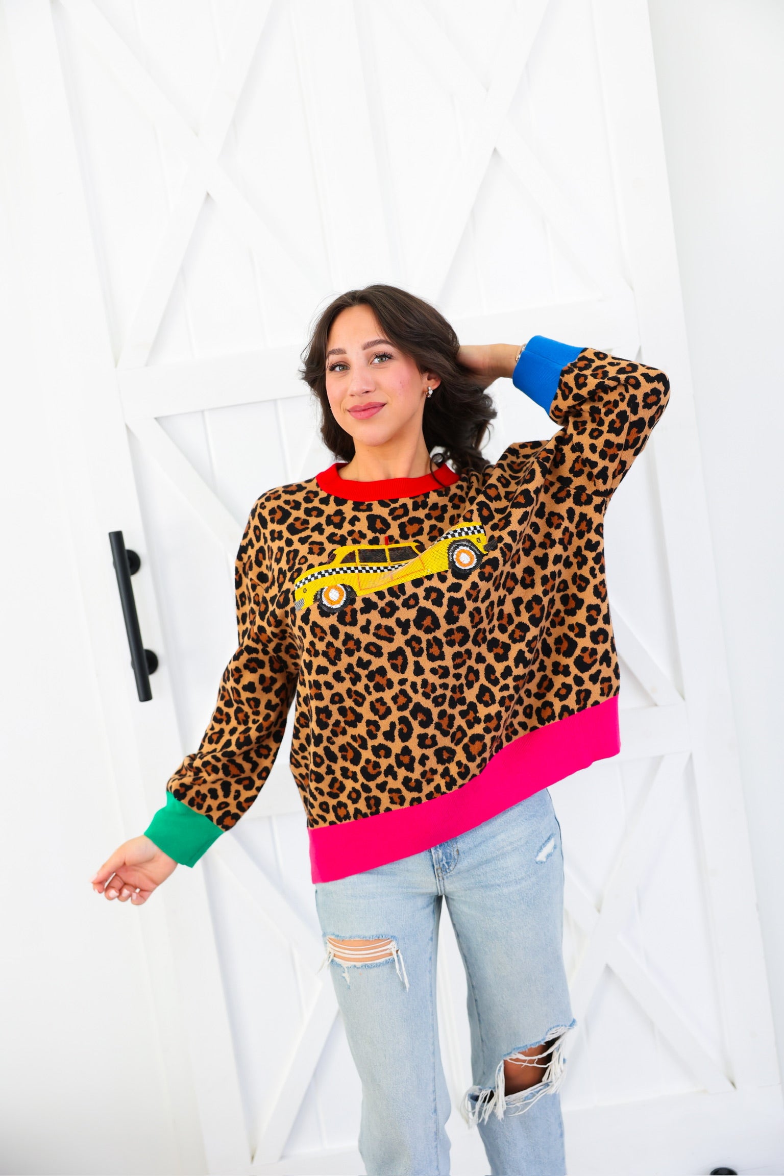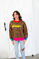 Queen of Sparkles Leopard Colorblock Trim Taxi Cab Sweater